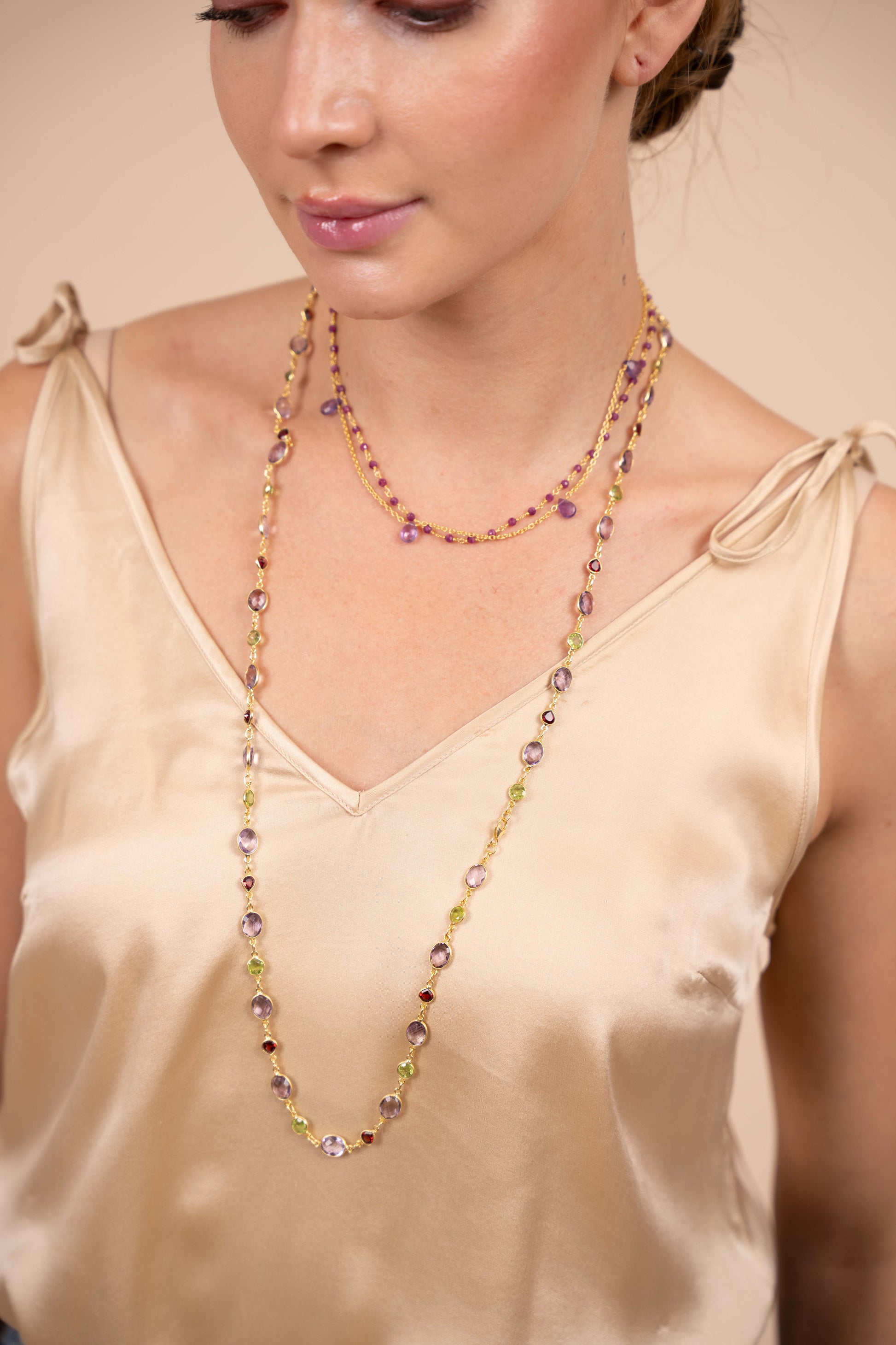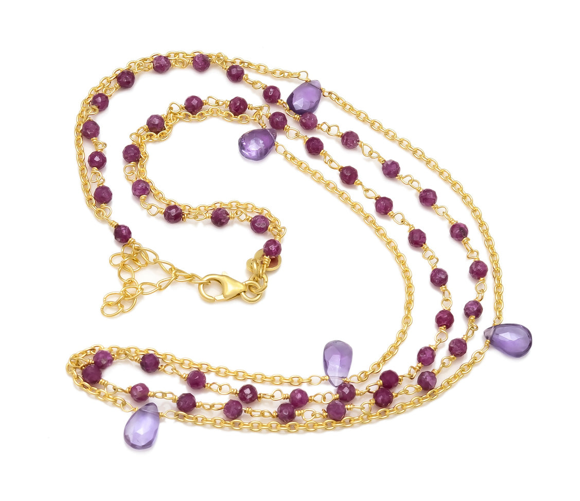 Ruby beads with pear shaped amethyst stones set in a tiered curb chain. Handcrafted in sterling silver with 18 ct gold plating.