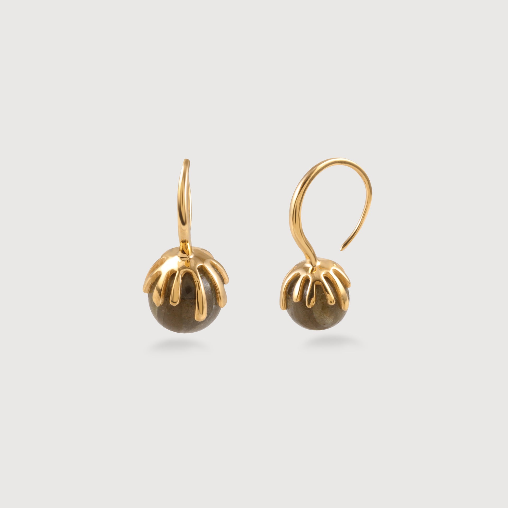 Crafted in 925 sterling silver and finished with gold plating, these minimalist drop earrings feature a polished labradorite stone sphere.
