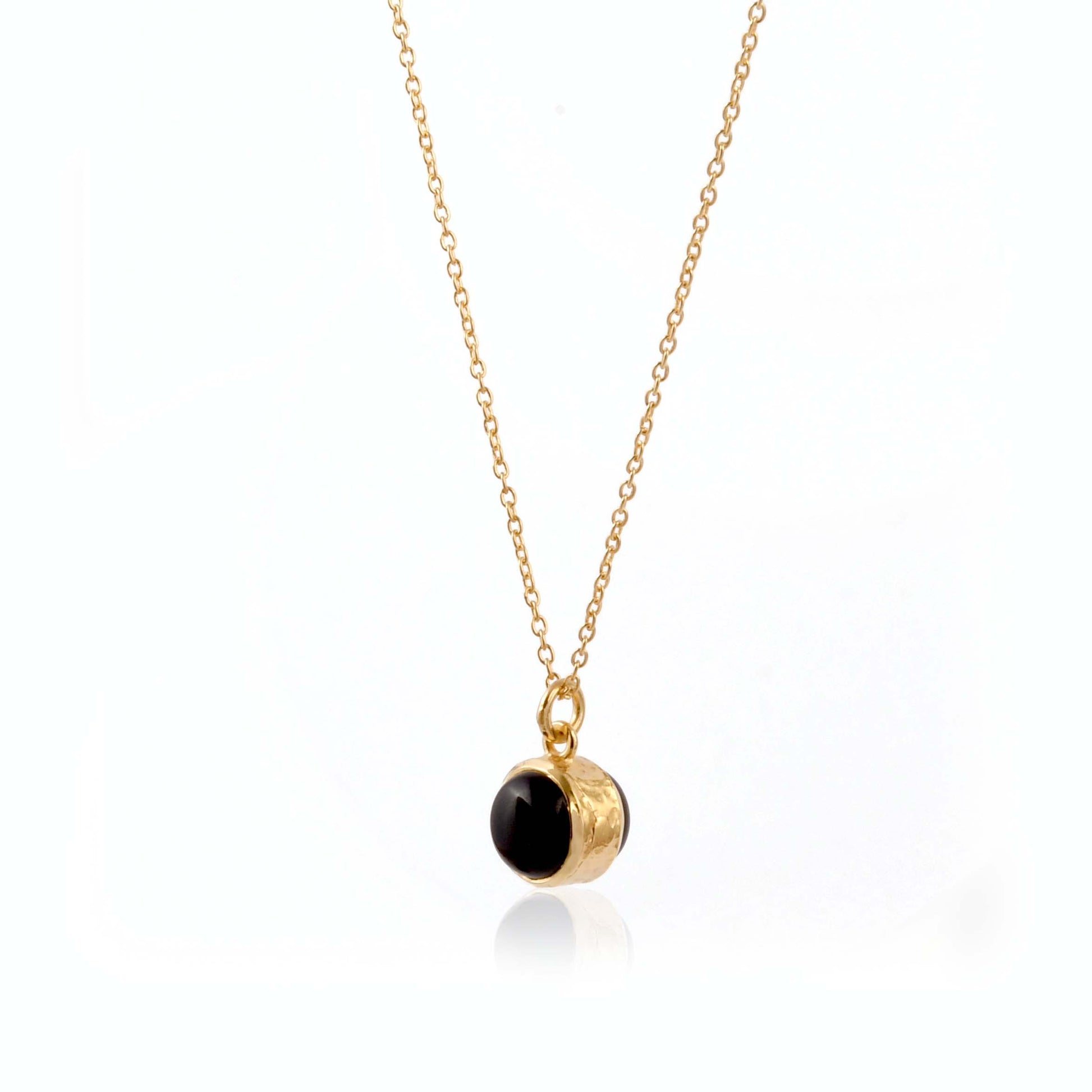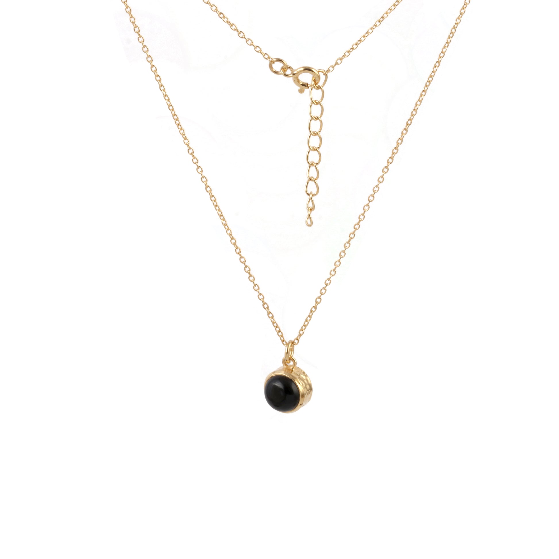 Cabochan cut black onyx with a hammered gold plated sterling silver band across it, this necklace is a 16" length with extra links.
