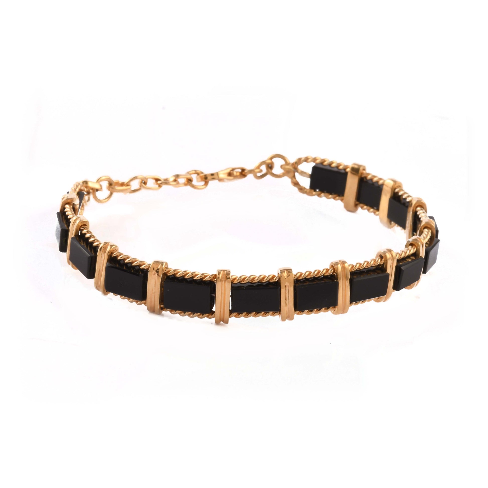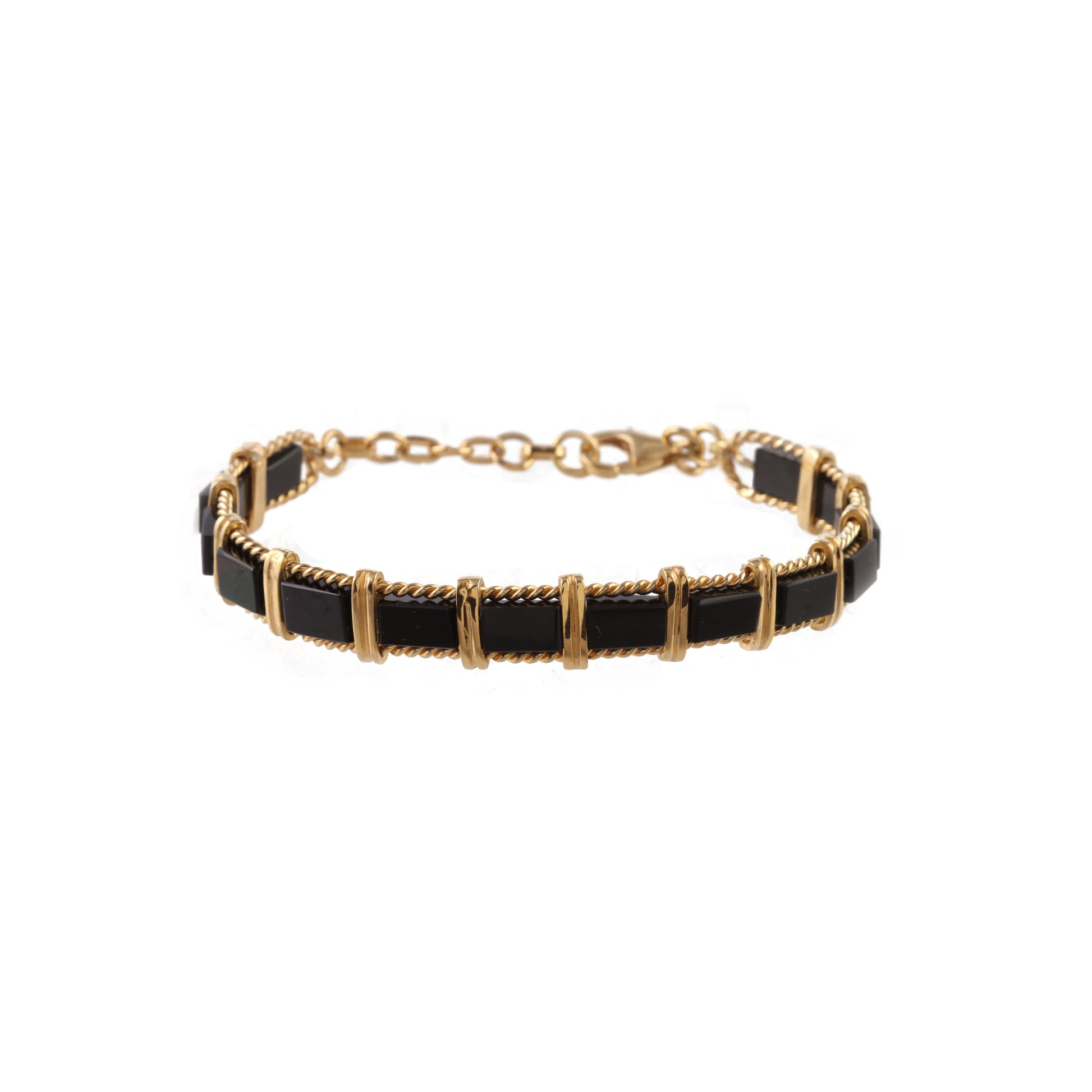 Tube rectangular cut black onyx stones strung together in a balled silver bracelet chain with 18 ct gold plated finish.