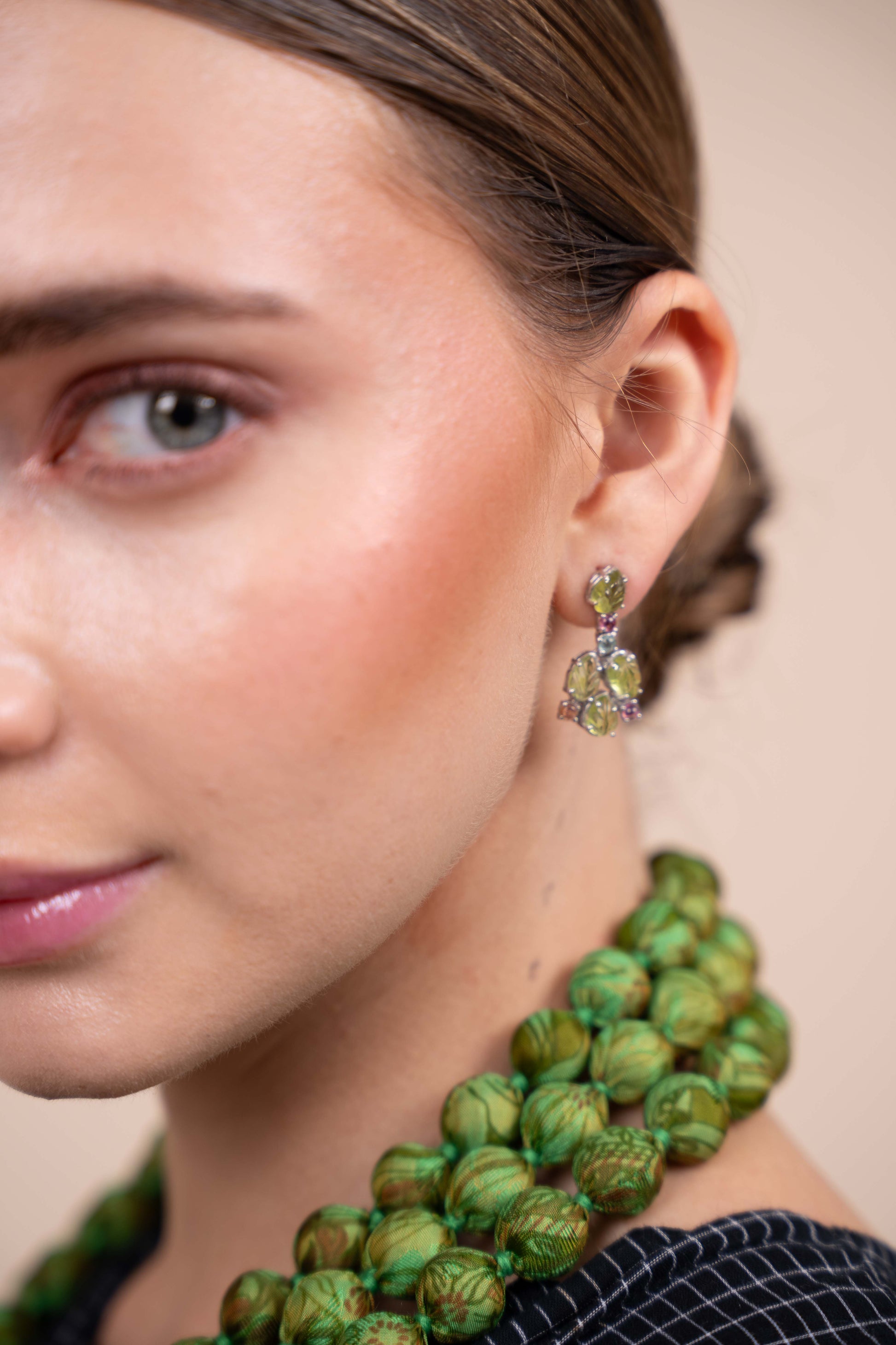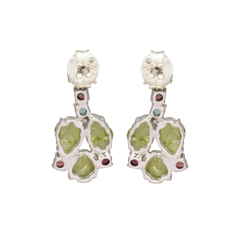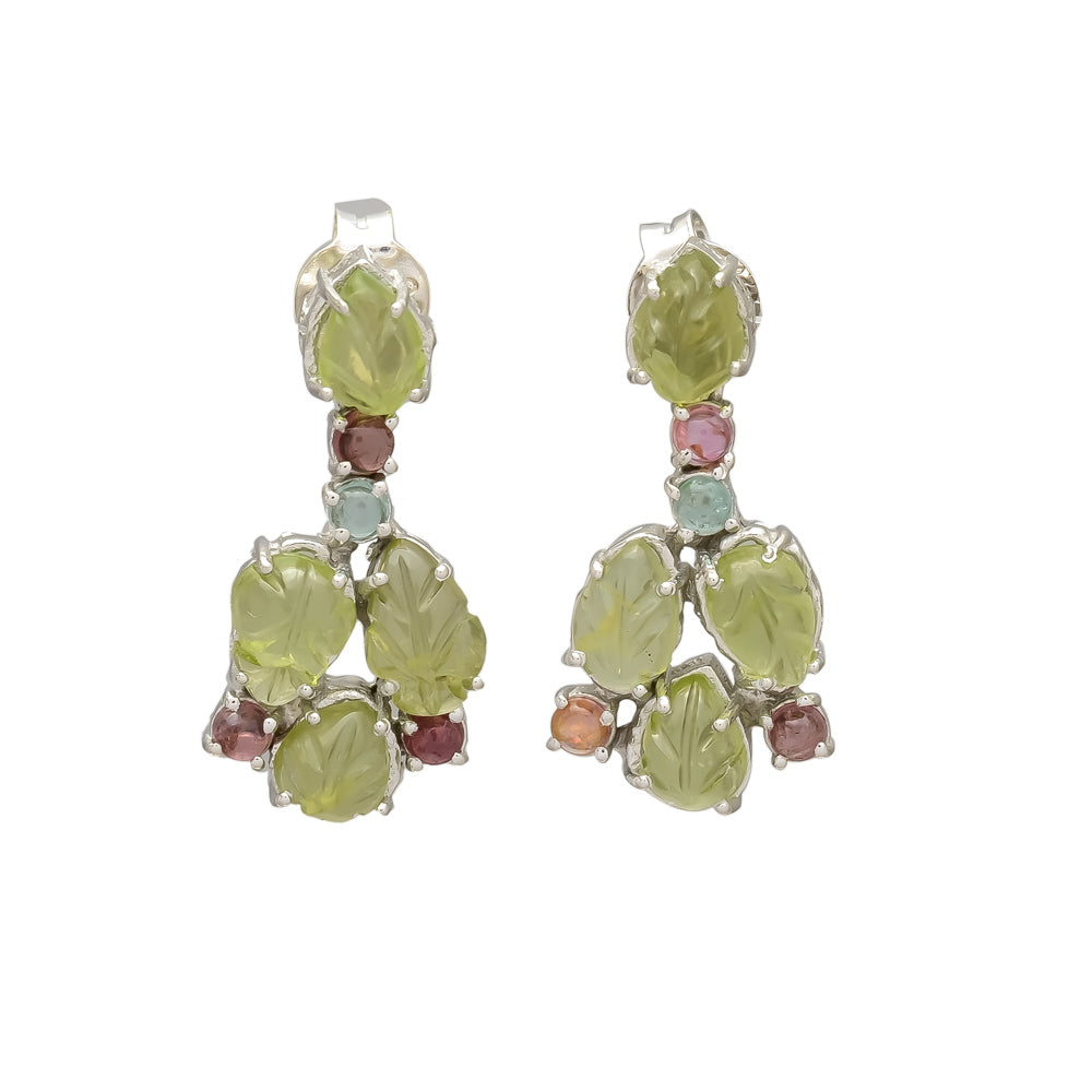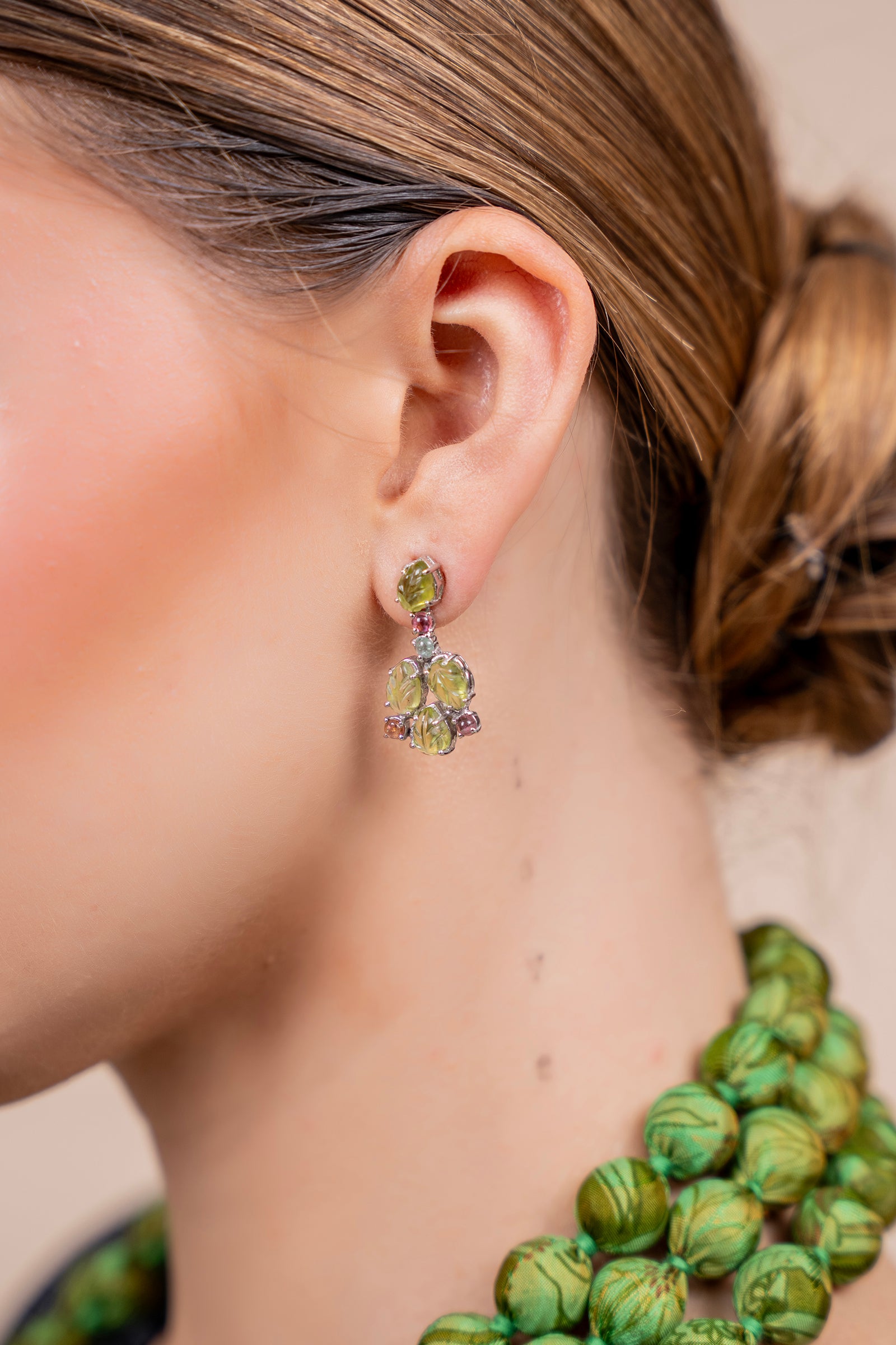 Carved peridots offset by the pink tourmalines in silver. This pair pops the lemon green of peridot to the T!