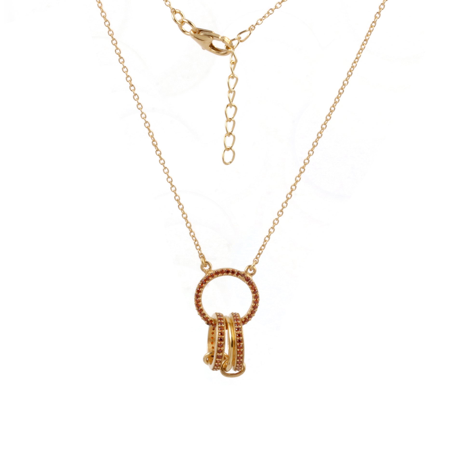A sleek gold plated sterling silver necklace with garnet zircon-lined circles and clean double drop design. Lightweight, versatile, and perfect for everyday shine.