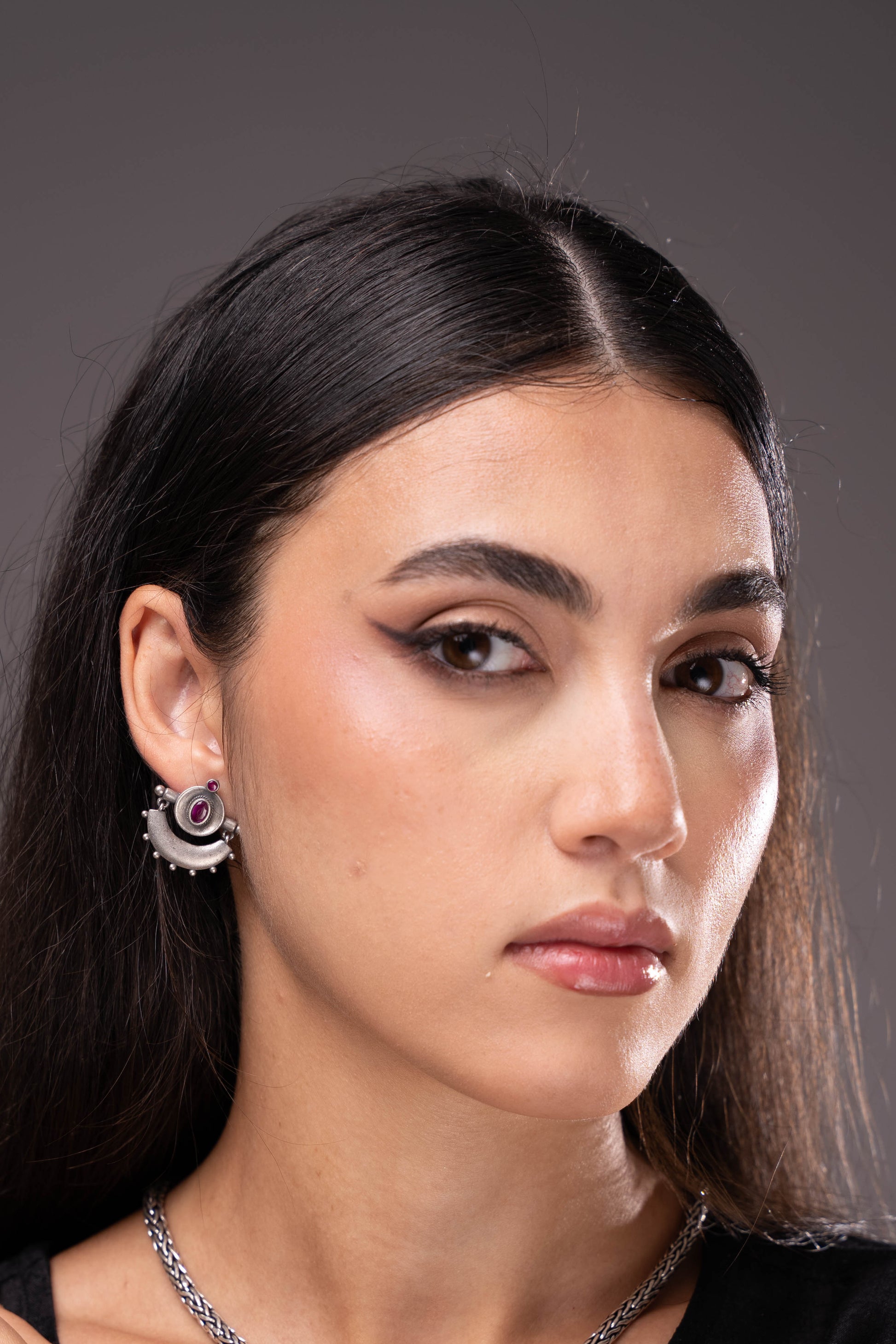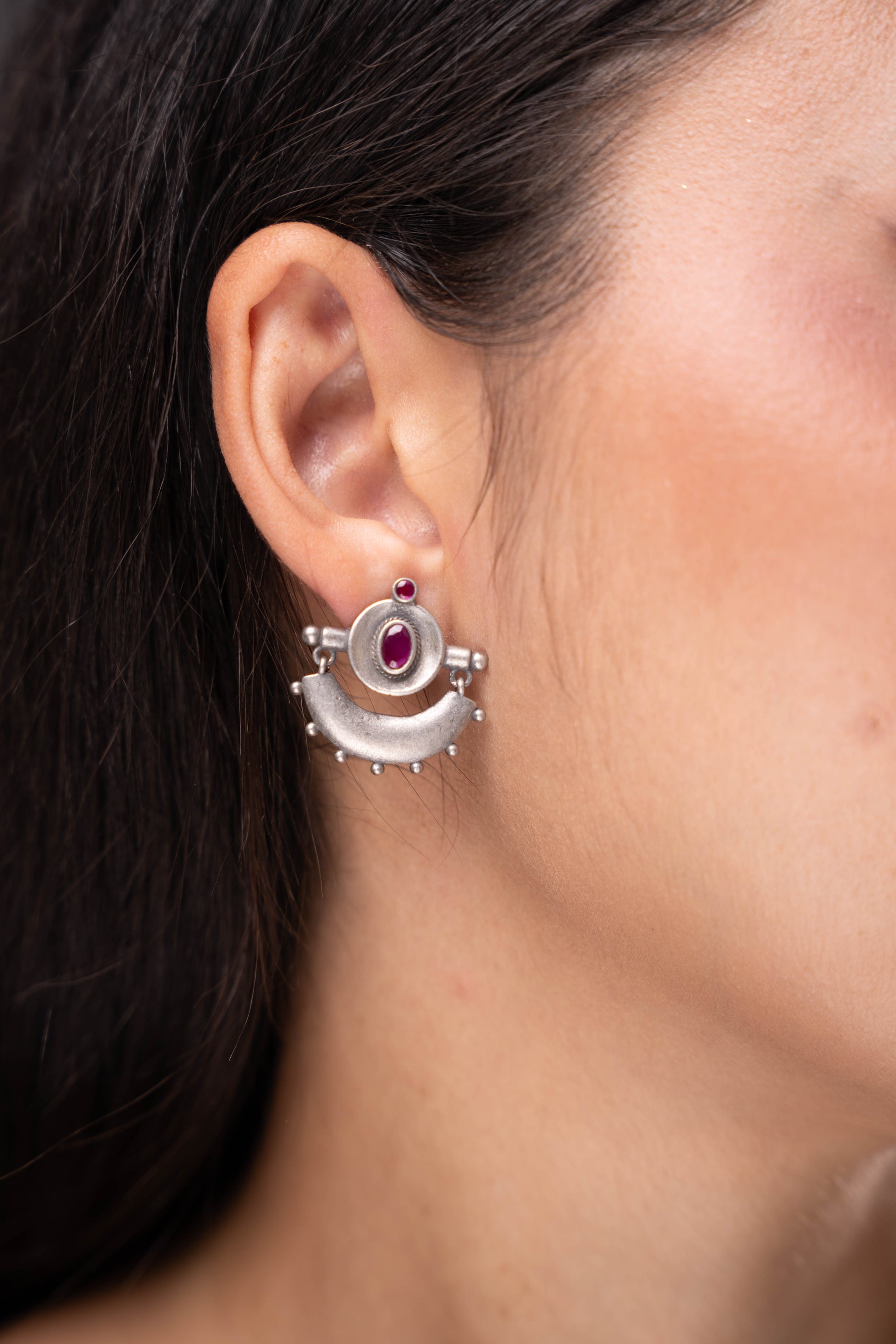 Simple daily wear and yet different - red kemp stone studded curved silver earrings with a vintage finish.
