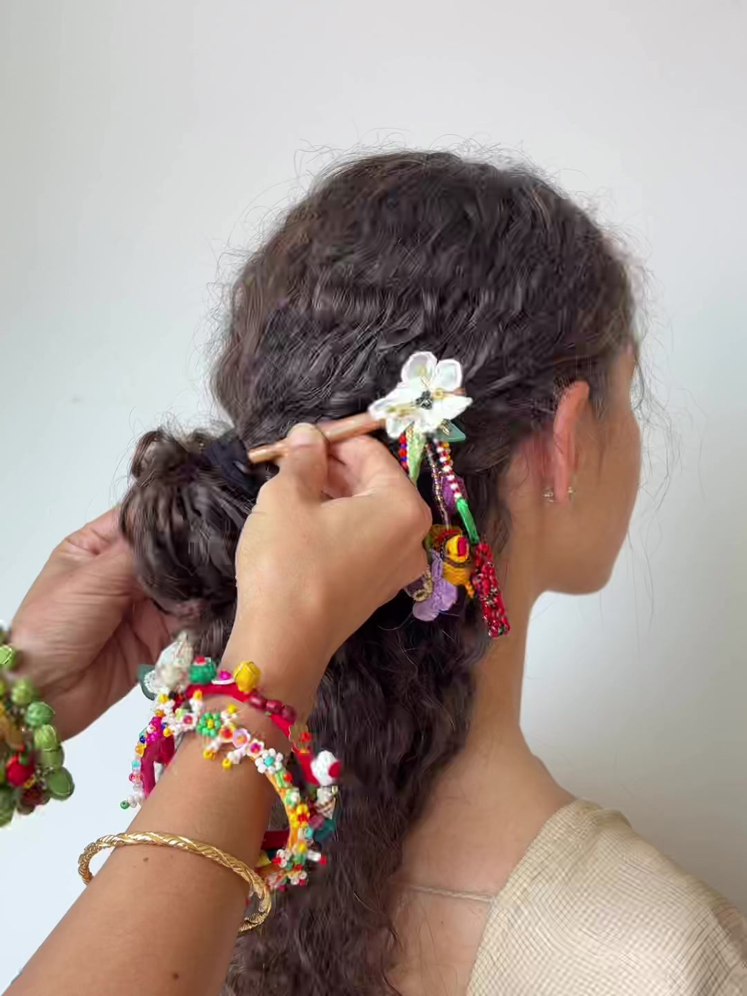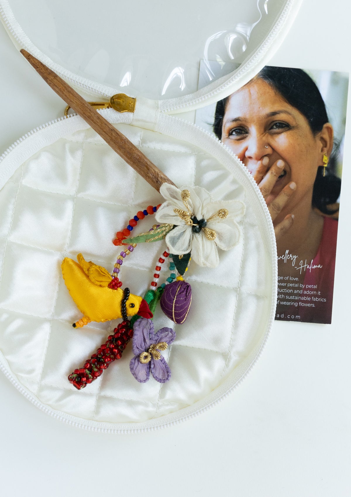 A bun stick with a difference - flowers, beads and tiny lil birdie neatly attached to the wooden bun stick. Handcrafted from silk and mashru fabrics.