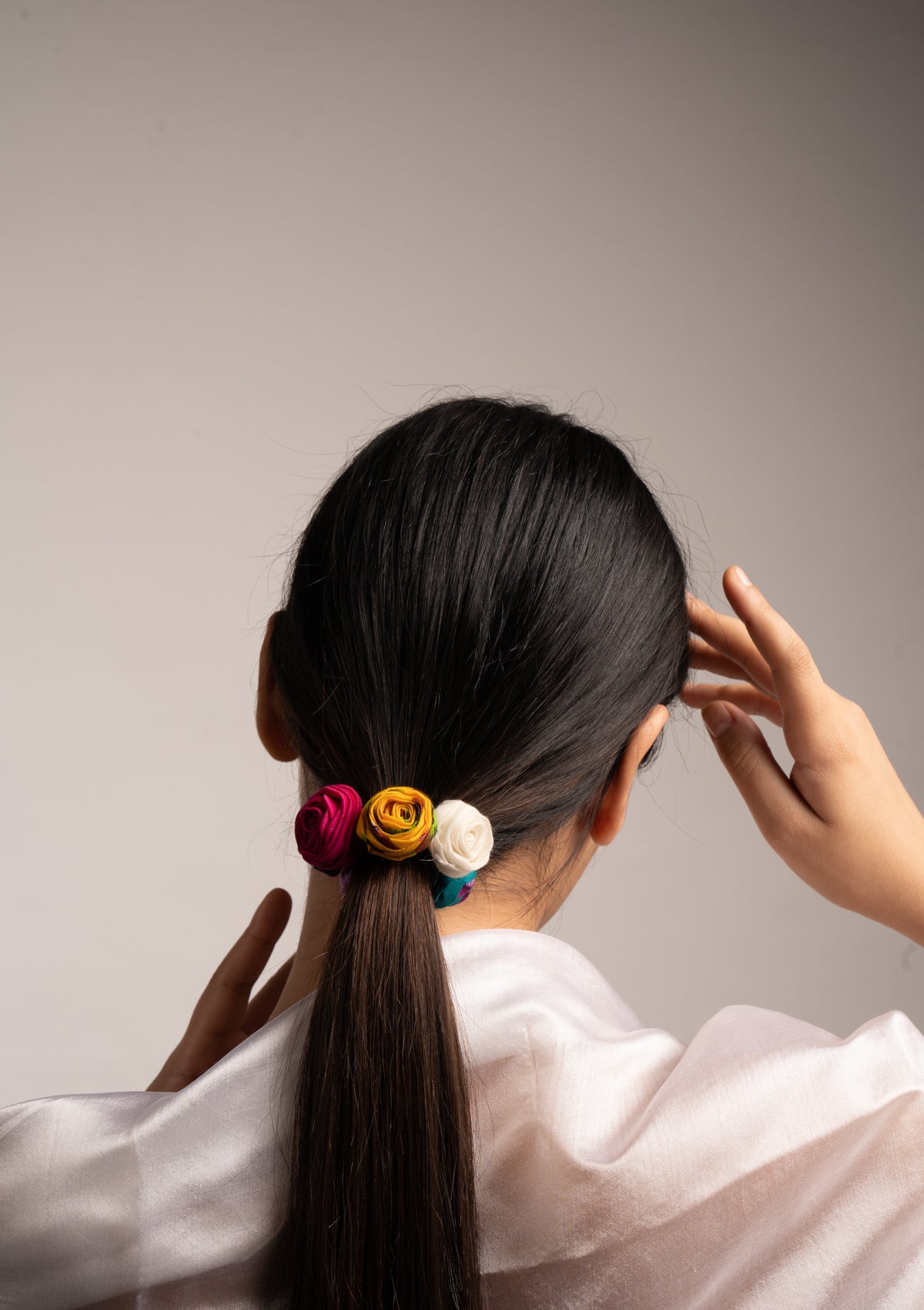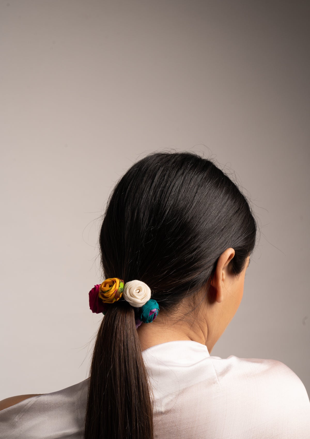 Cluster of roses handcrafted in silk / mashru fabric tucked in a durable rubber band.