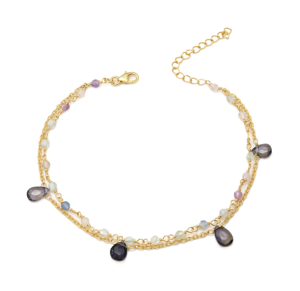 Pastel fluorite beads strung together with iolite pear shaped stones to create this 2 tiered bracelet.