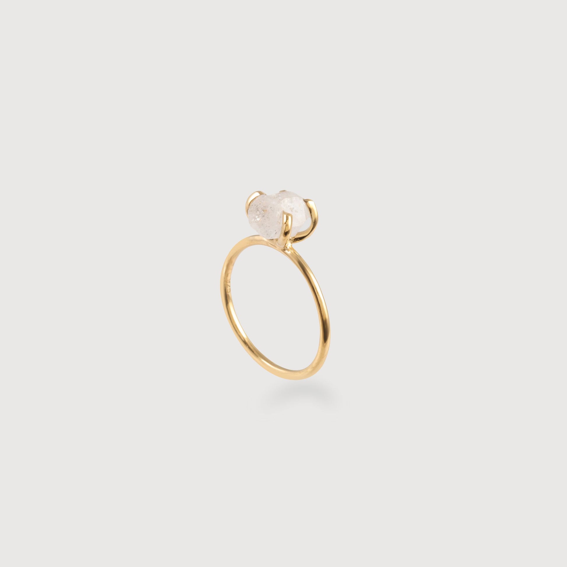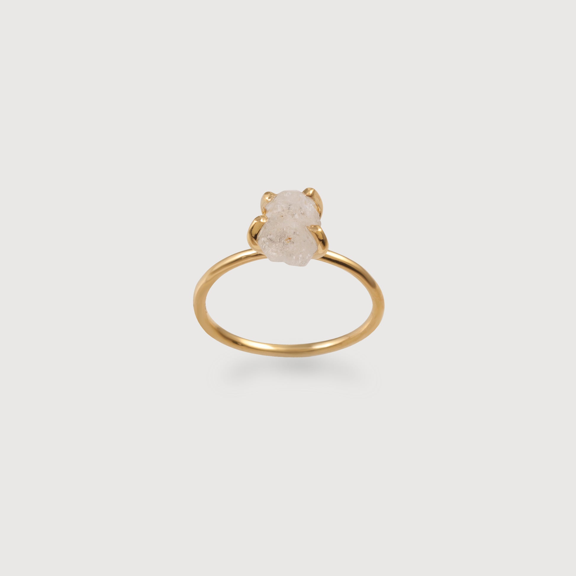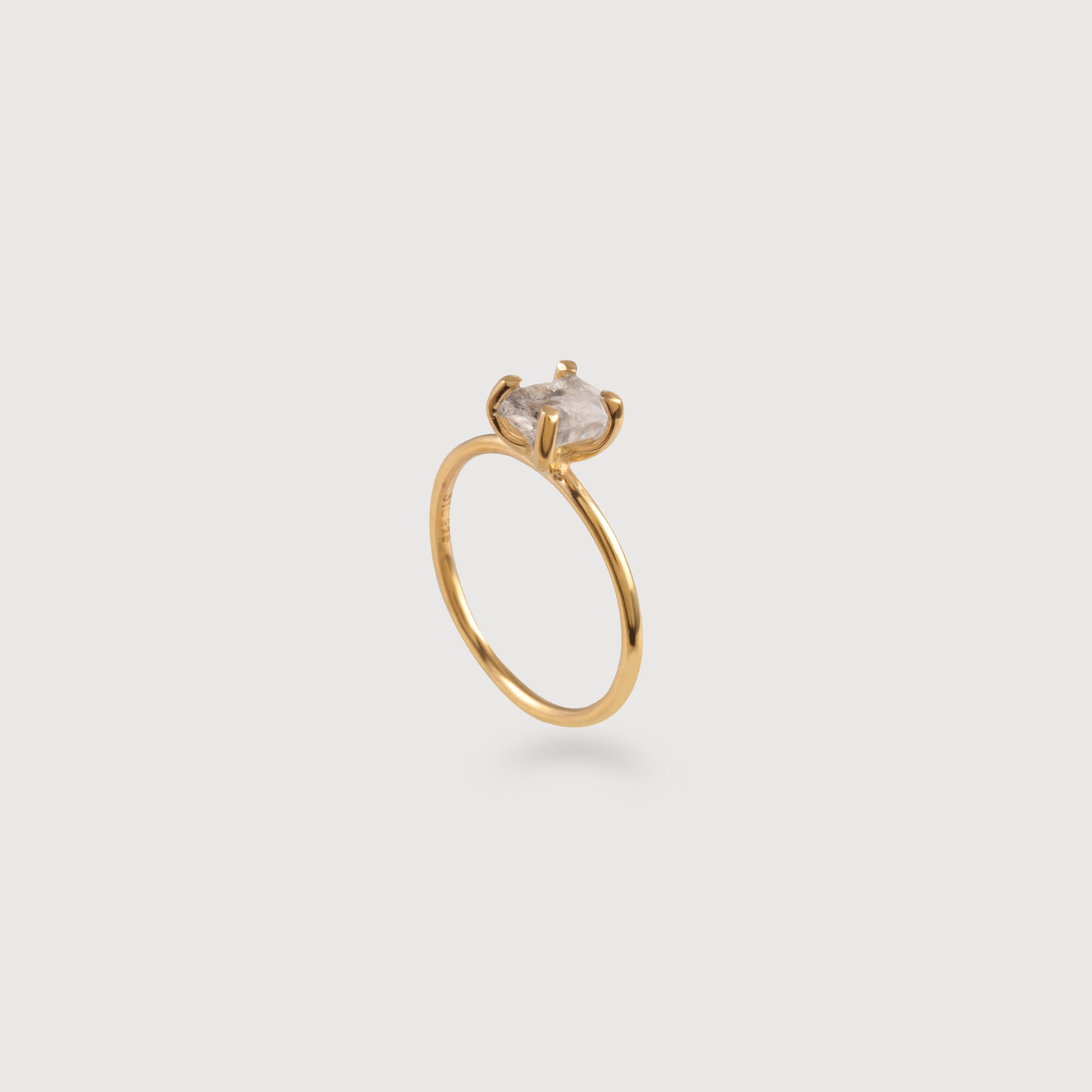 Inorganically shaped Herkimer stone set in a prong styled ring.