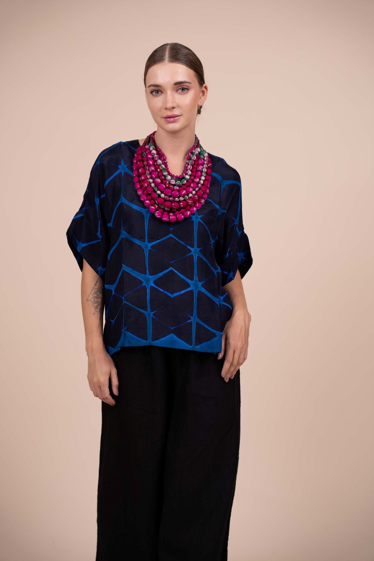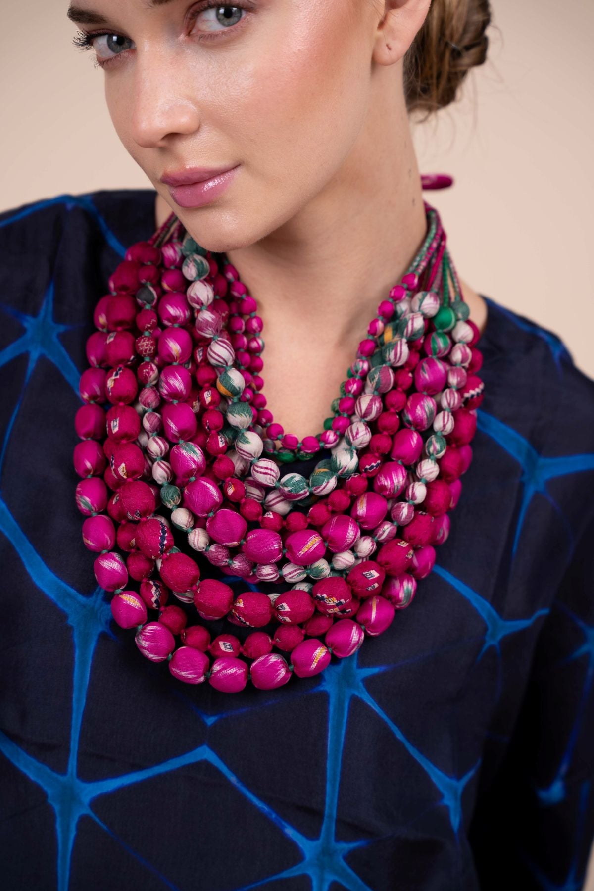 As made for and worn by the Queen of Style, Iris Apfel, our Iris Necklaces are incredible statement pieces - chunky, beaded necklaces made from vibrant, repurposed silk sari scraps. We select the most striking colours and prints from the mountains of sari remnants in our workshop. These scraps are first matched, piece-by-piece, with colourful cotton thread, and then sewn into narrow, double-layered tubes. The artisans fill these tubes with wooden prayer beads, hand-stitching each bead into place with the thread.