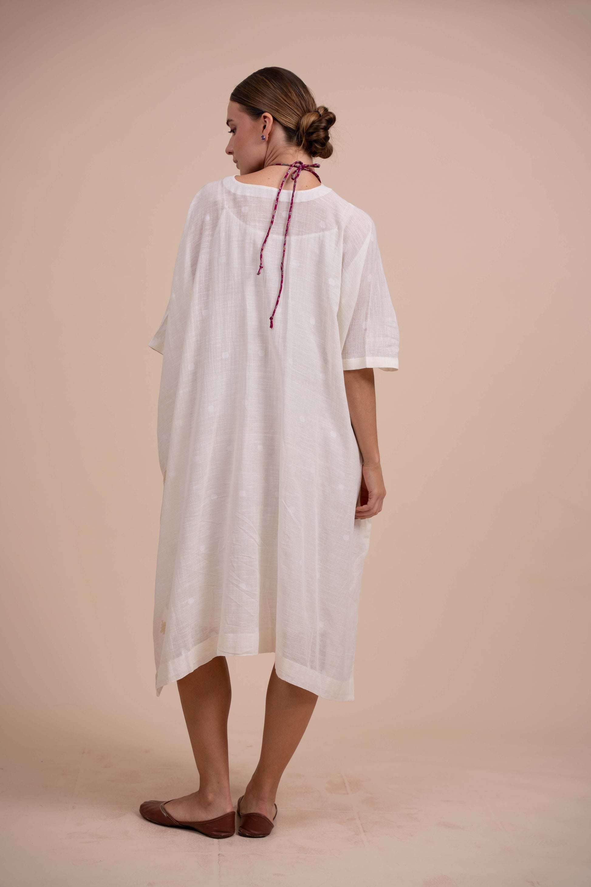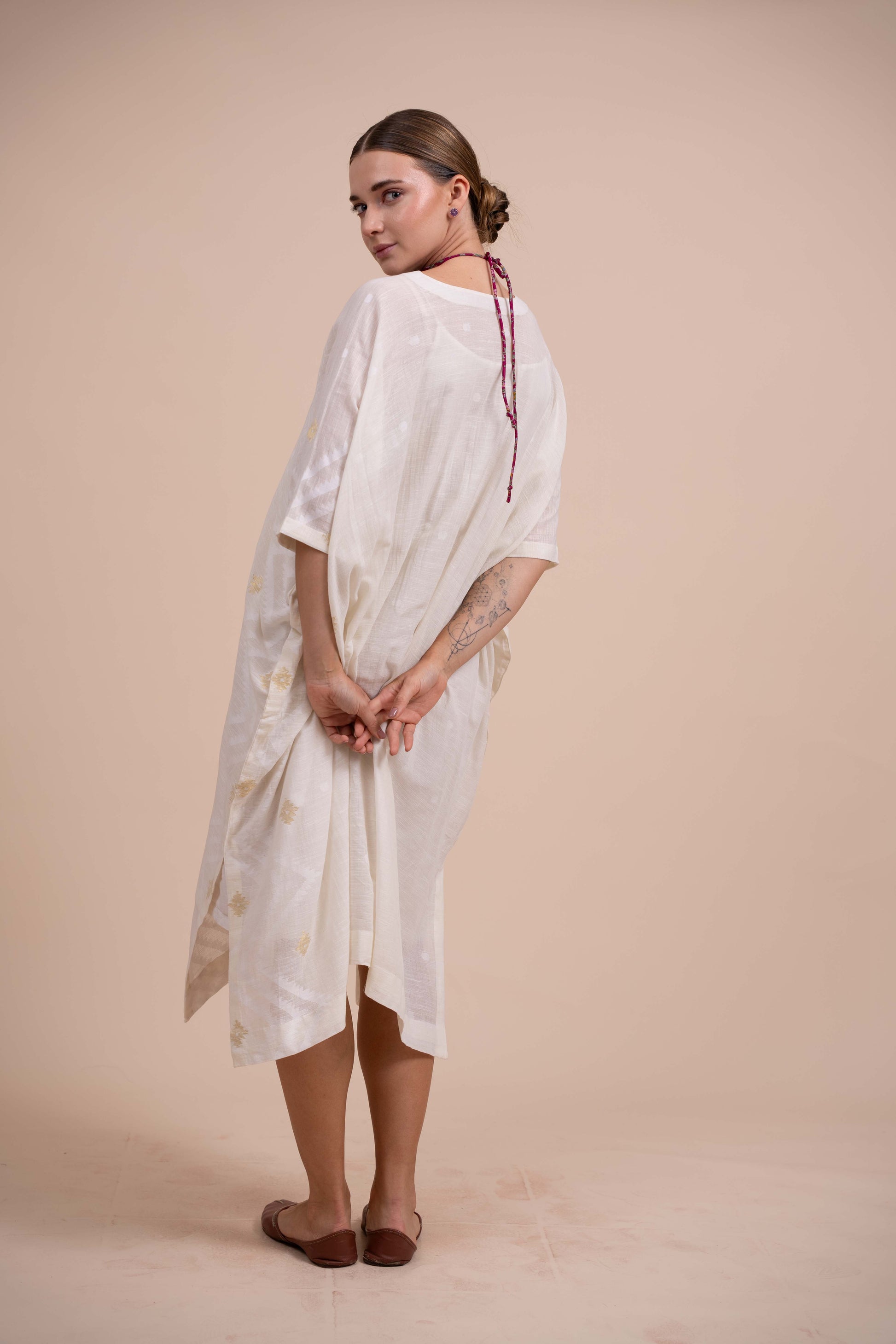 Effortless elegance meets comfort in this ivory short jamdani kaftan. Crafted from sheer muslin cotton, the delicate jamdani weave creates an intricate, breathable fabric . The relaxed silhouette features a graceful scooped neckline adorned with embellished button. One size fits most, making it an ideal choice for versatile styling. Whether worn as a casual cover-up or dressed up with palazzos, this kaftan combines traditional craftsmanship with contemporary ease.