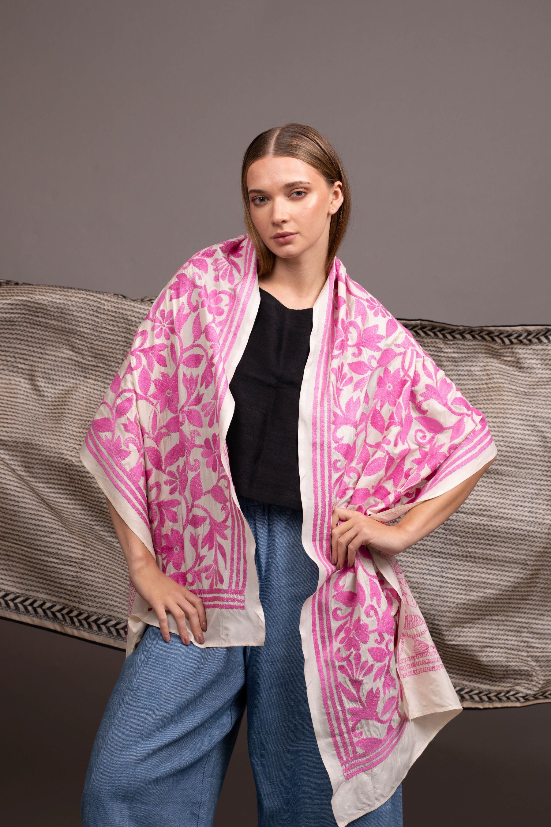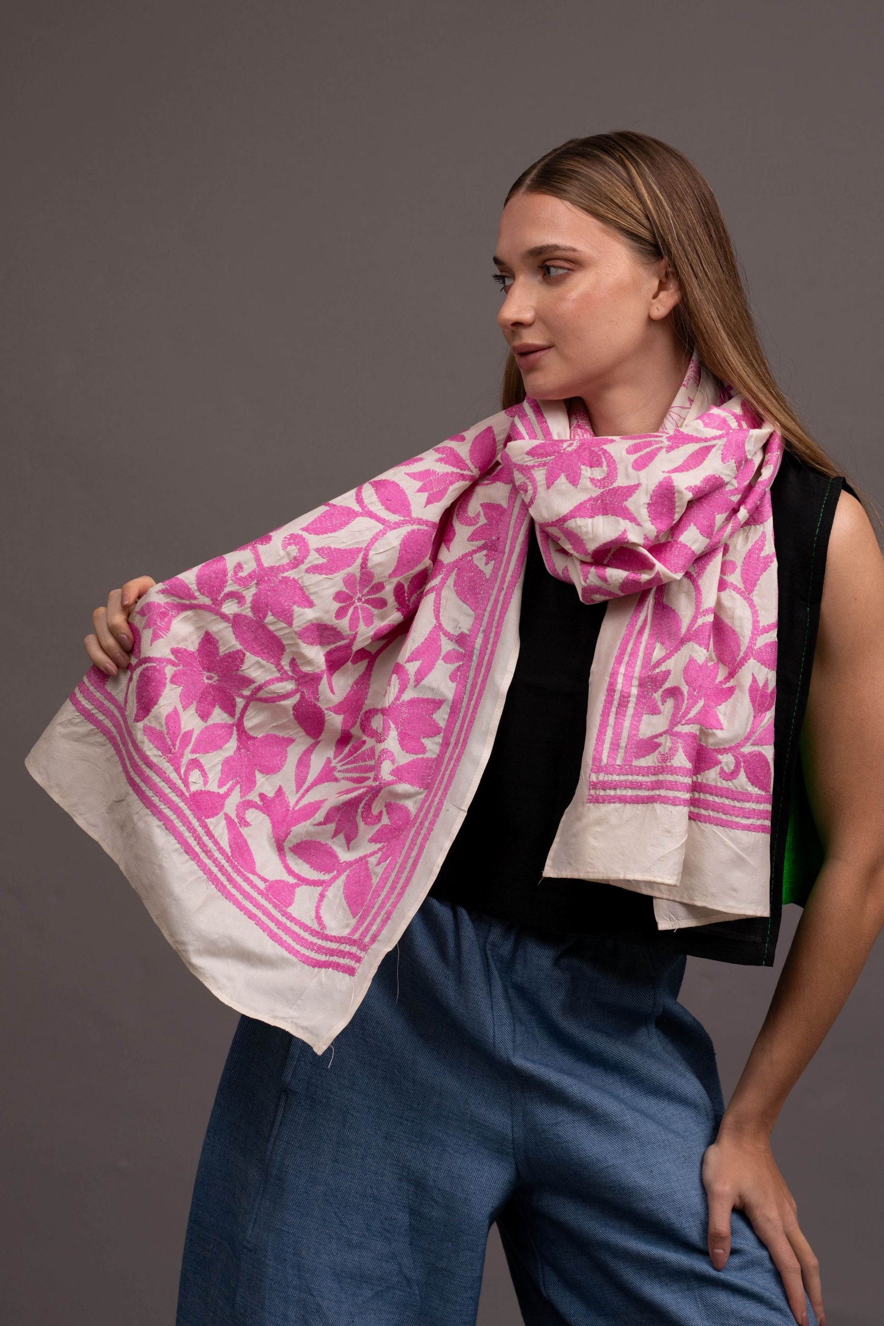 Hand embroidered kantha stitch in a floral pattern on a silk fabric.