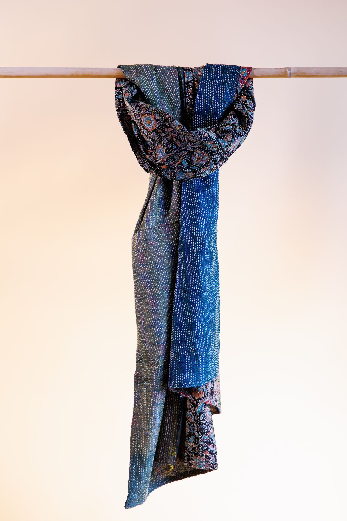 One-of-a-kind silk scarf, crafted from two layers of hand-picked, repurposed silk saris & strengthened with fine, all-over kantha, hand stitched by our partner, a women’s cooperative in rural West Bengal.