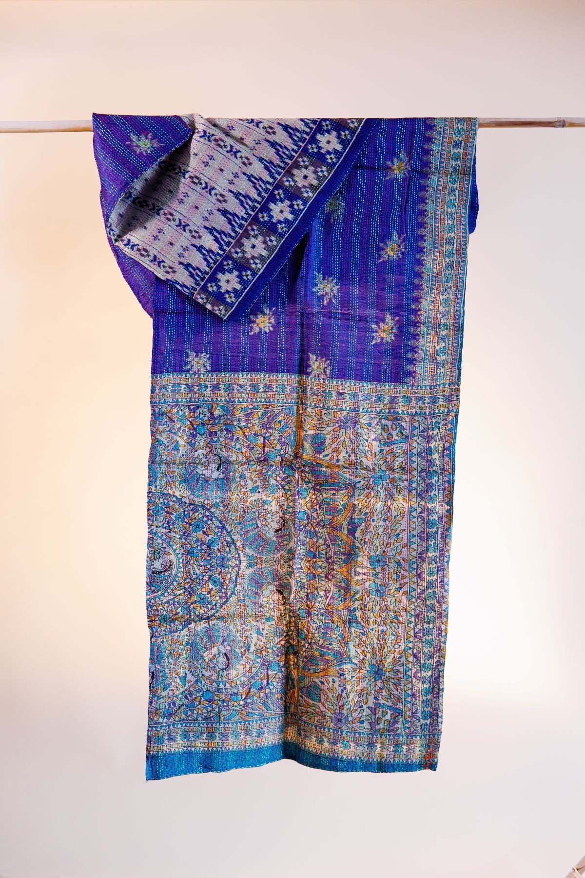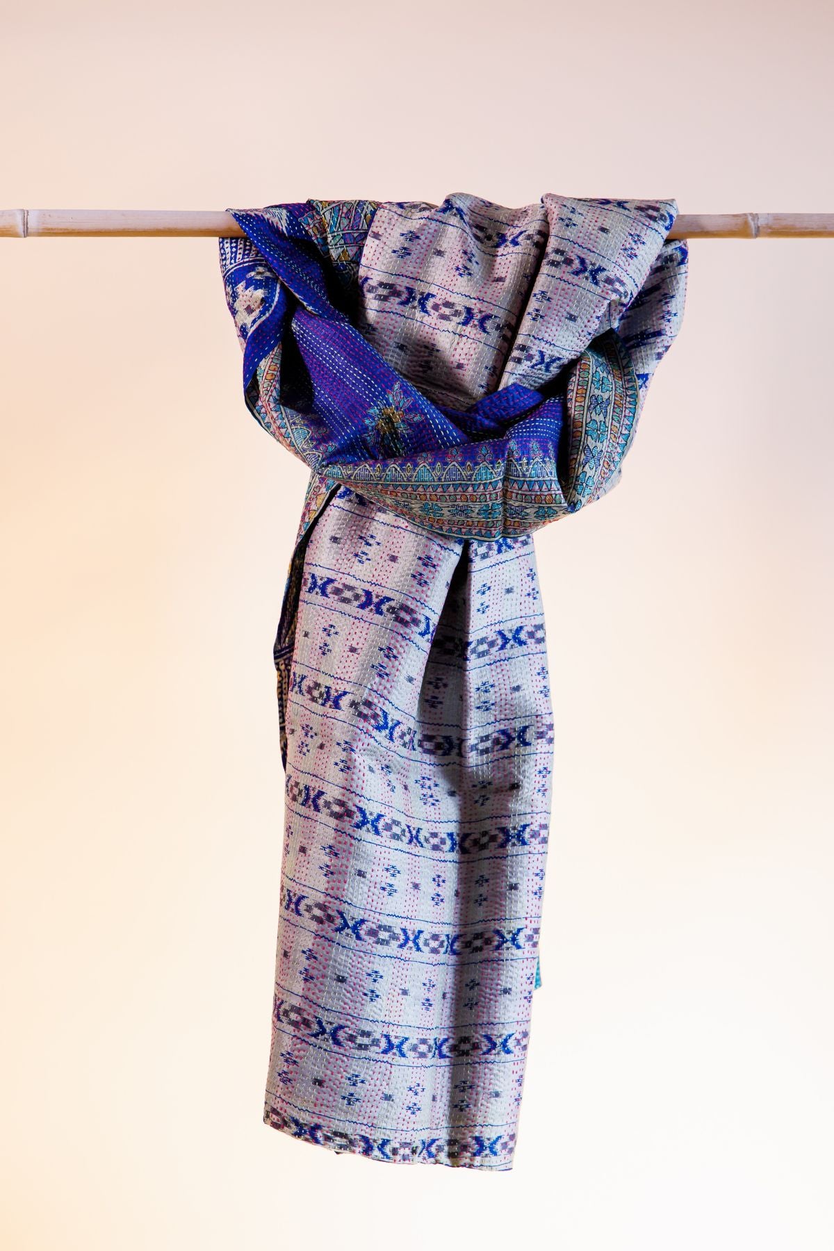 One-of-a-kind silk scarf, crafted from two layers of hand-picked, repurposed silk saris & strengthened with fine, all-over kantha, hand stitched by our partner, a women’s cooperative in rural West Bengal.
