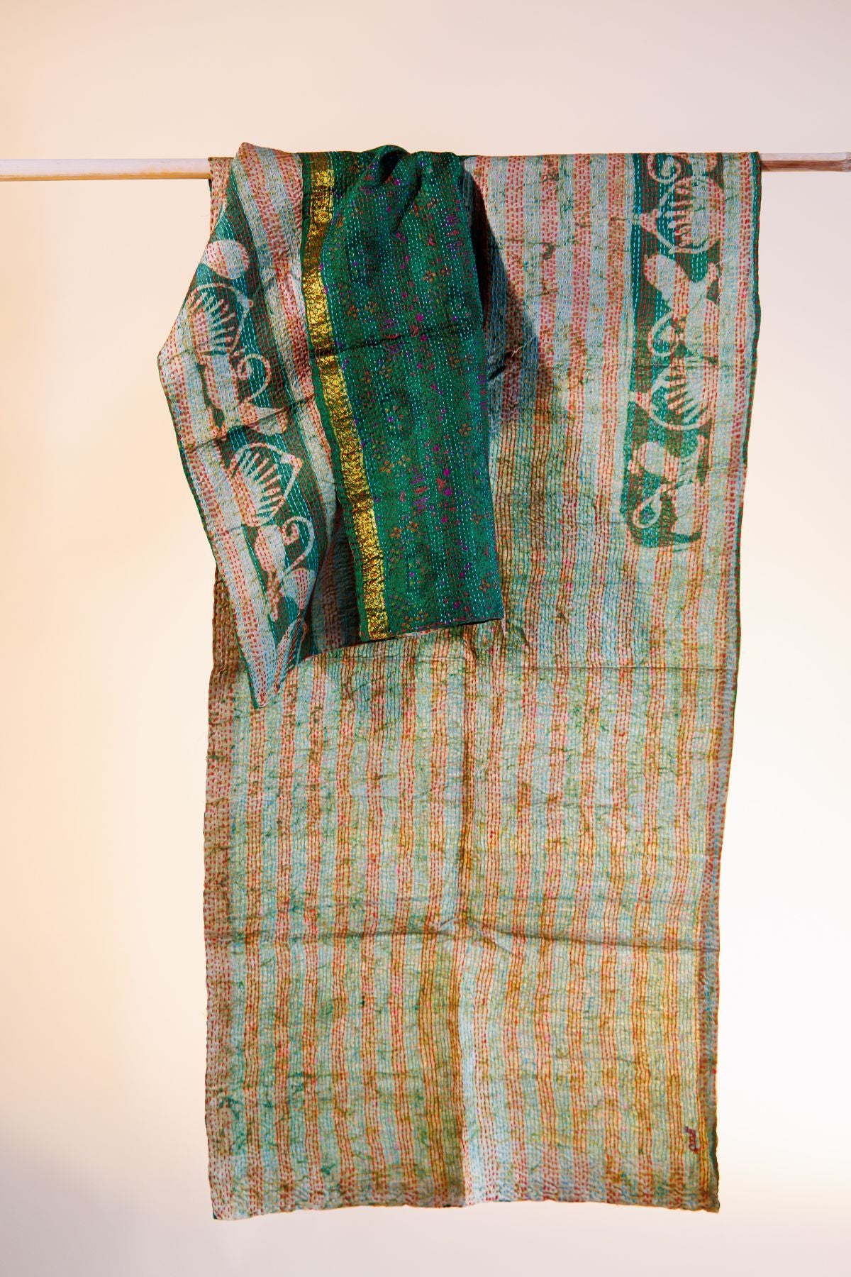 One-of-a-kind silk scarf, crafted from two layers of hand-picked, repurposed silk saris & strengthened with fine, all-over kantha, hand stitched by our partner, a women’s cooperative in rural West Bengal.