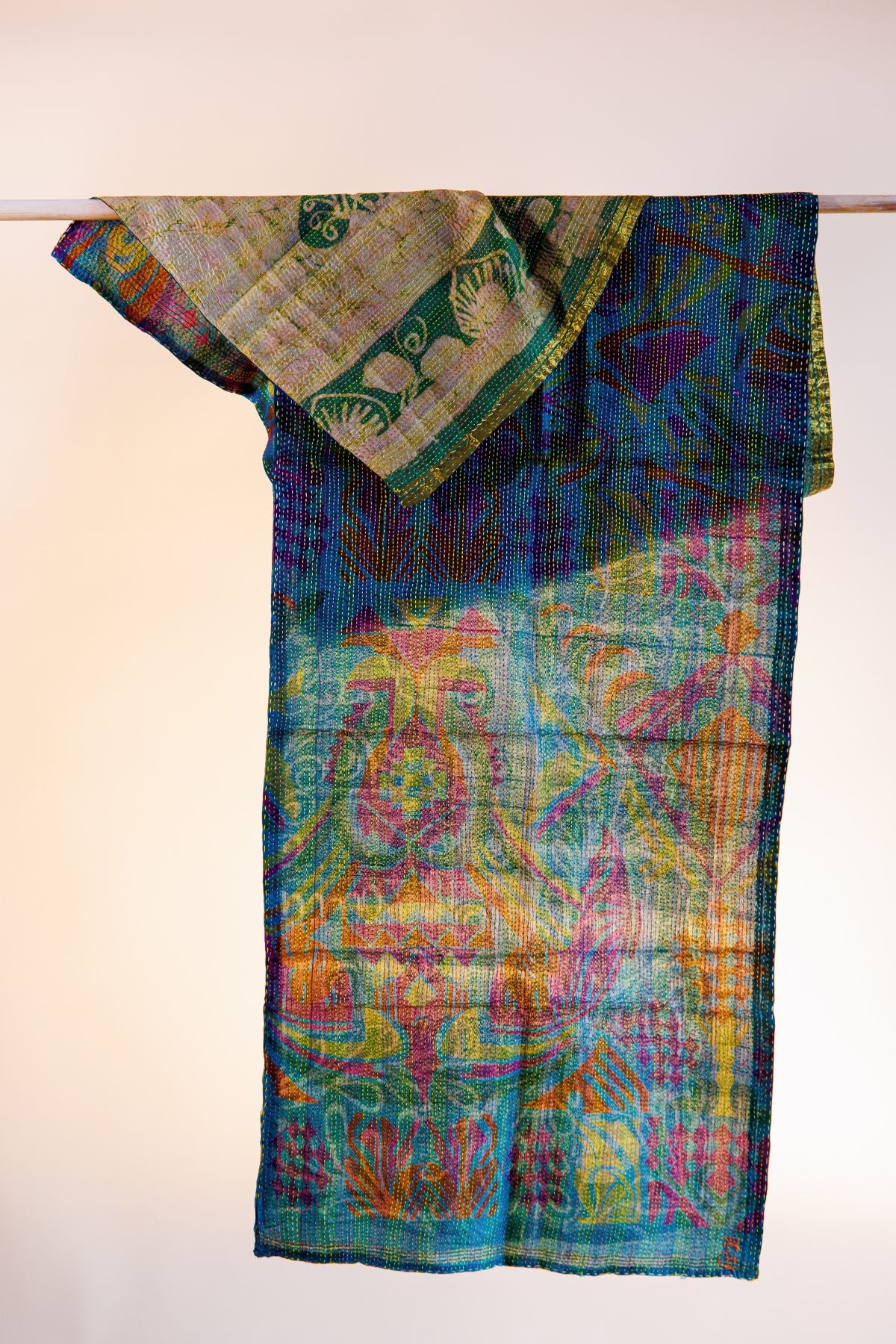 One-of-a-kind silk scarf, crafted from two layers of hand-picked, repurposed silk saris & strengthened with fine, all-over kantha, hand stitched by our partner, a women’s cooperative in rural West Bengal.
