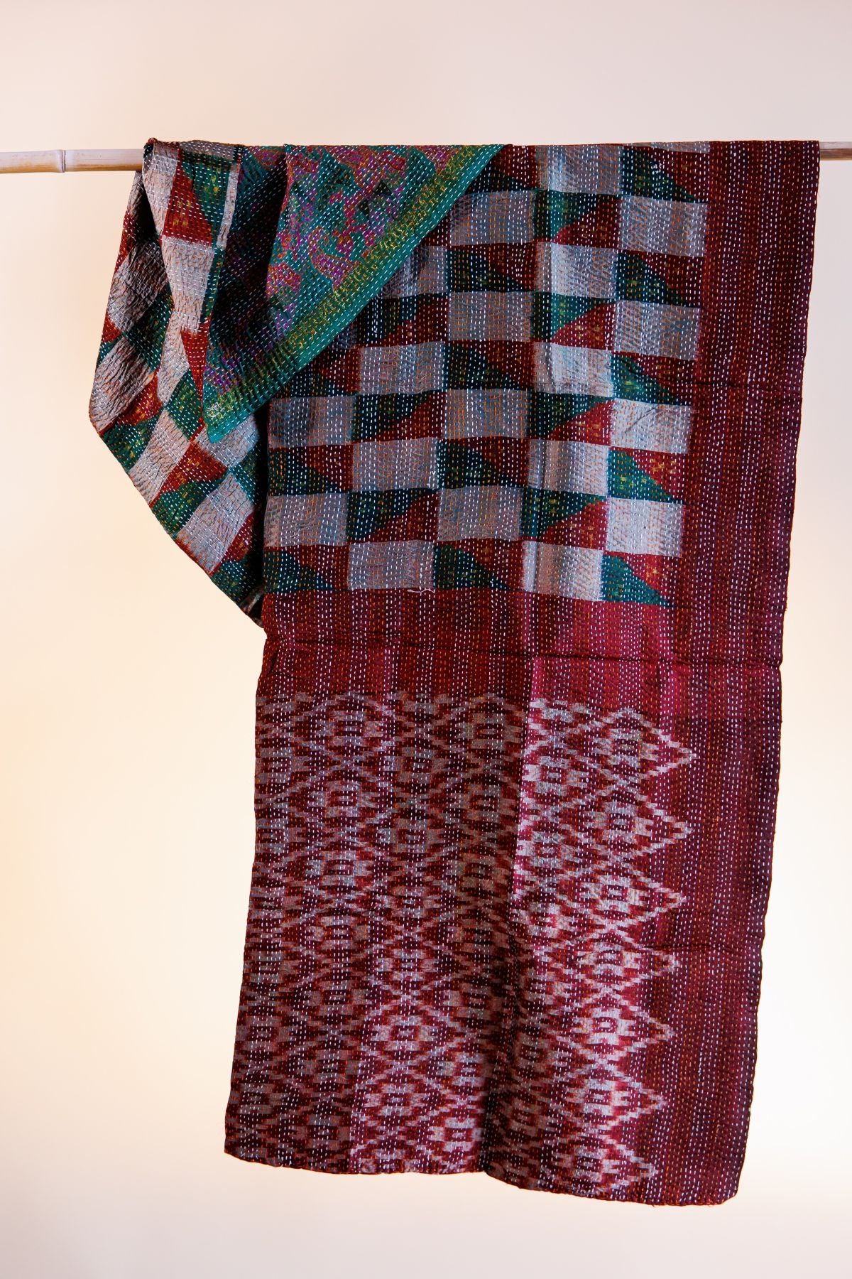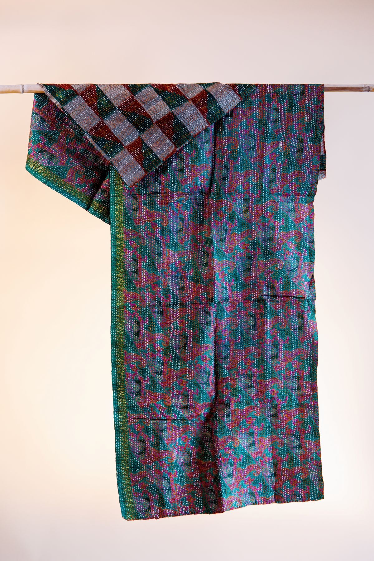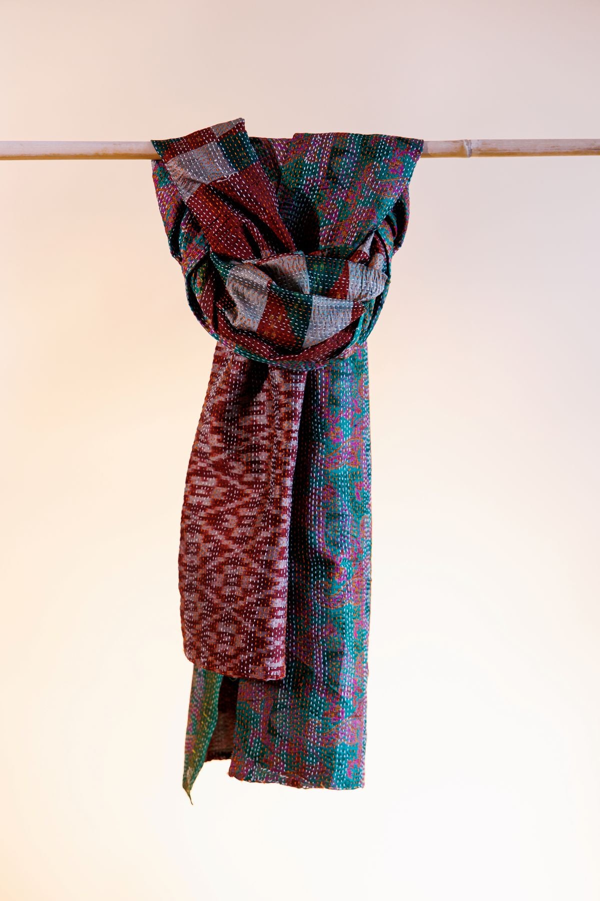 One-of-a-kind silk scarf, crafted from two layers of hand-picked, repurposed silk saris & strengthened with fine, all-over kantha, hand stitched by our partner, a women’s cooperative in rural West Bengal.