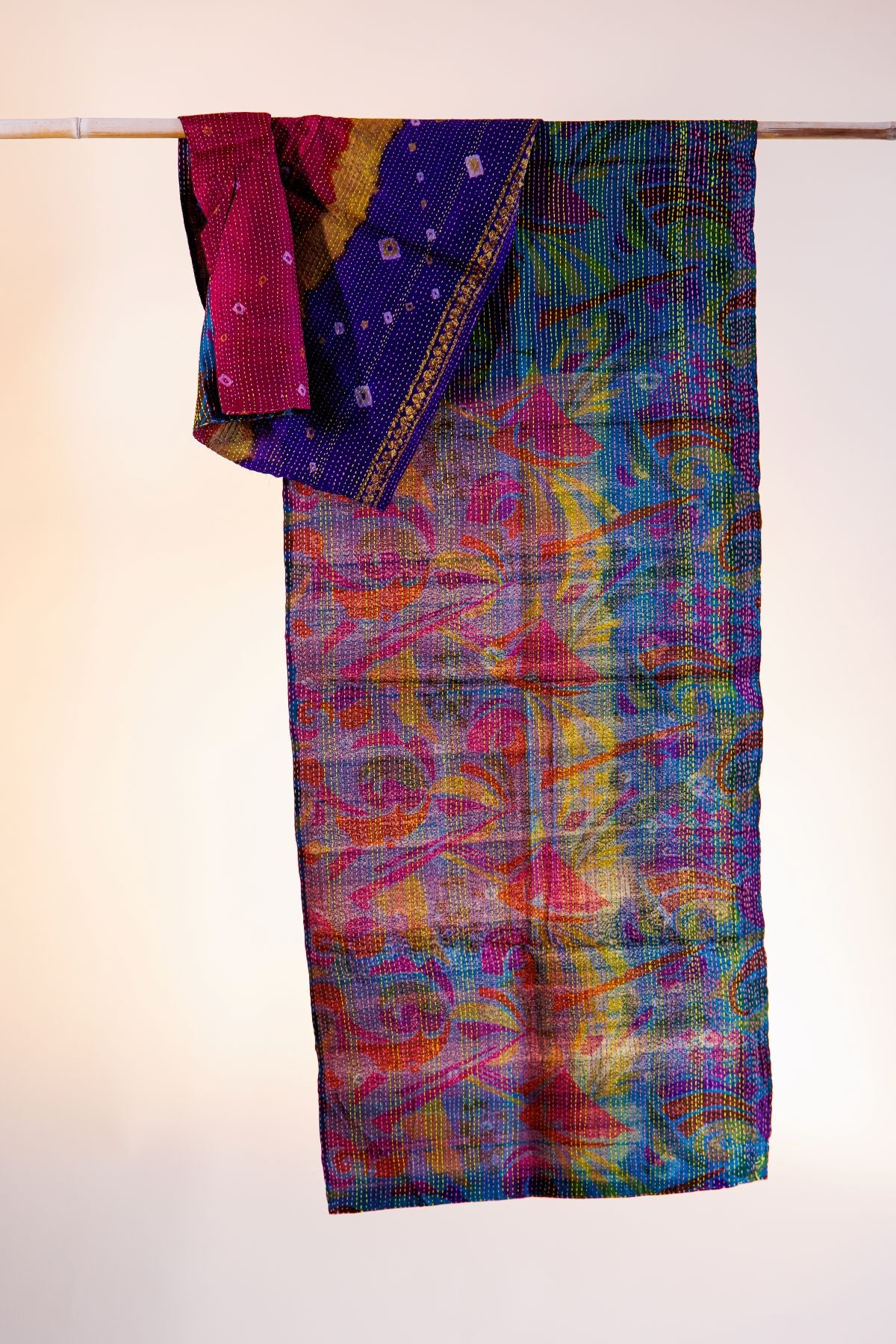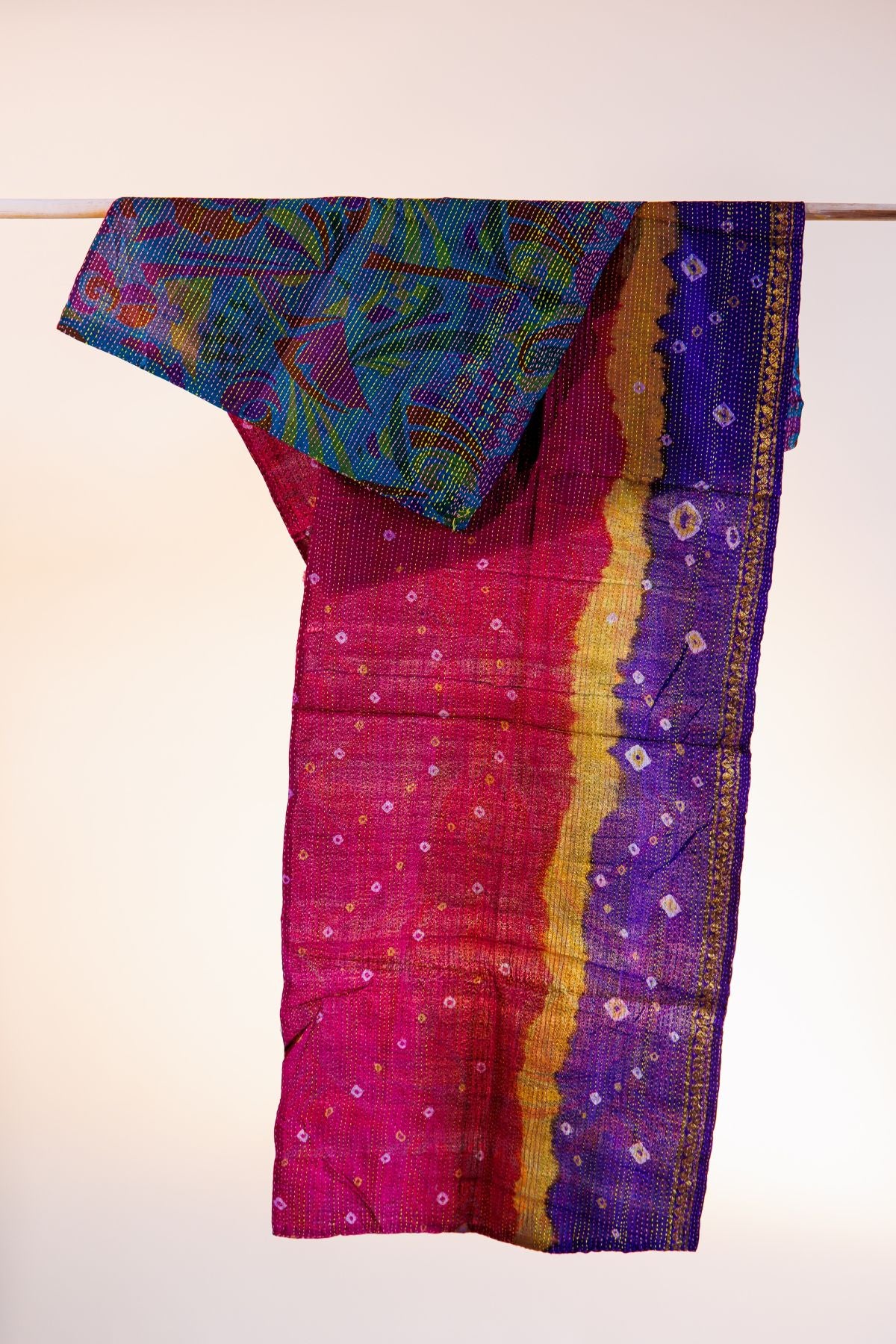 One-of-a-kind silk scarf, crafted from two layers of hand-picked, repurposed silk saris & strengthened with fine, all-over kantha, hand stitched by our partner, a women’s cooperative in rural West Bengal.
