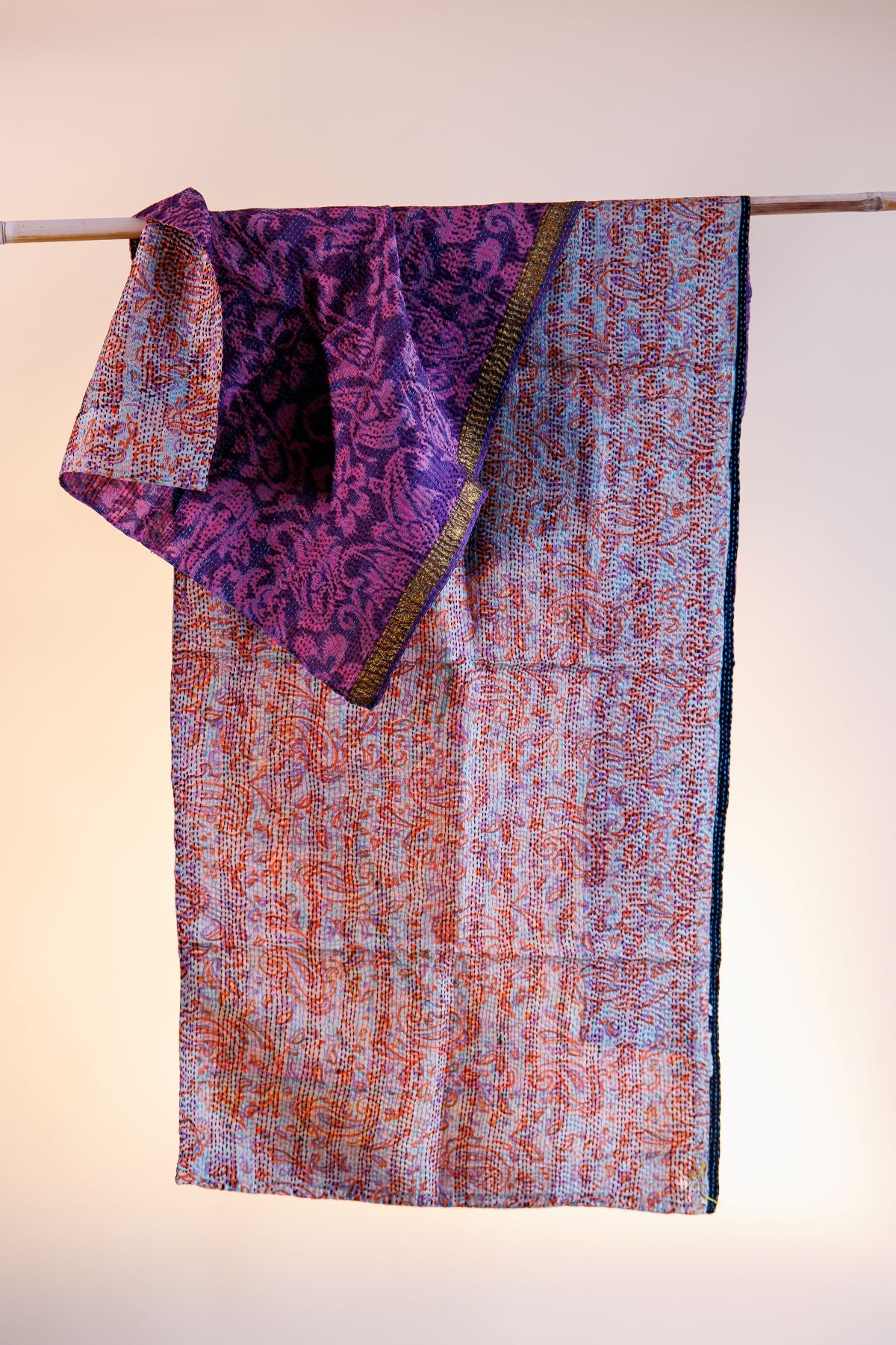 One-of-a-kind silk scarf, crafted from two layers of hand-picked, repurposed silk saris & strengthened with fine, all-over kantha, hand stitched by our partner, a women’s cooperative in rural West Bengal.