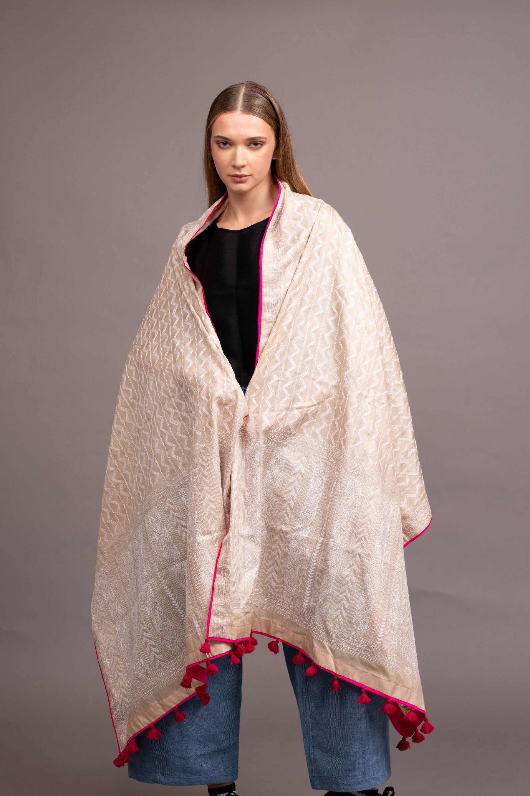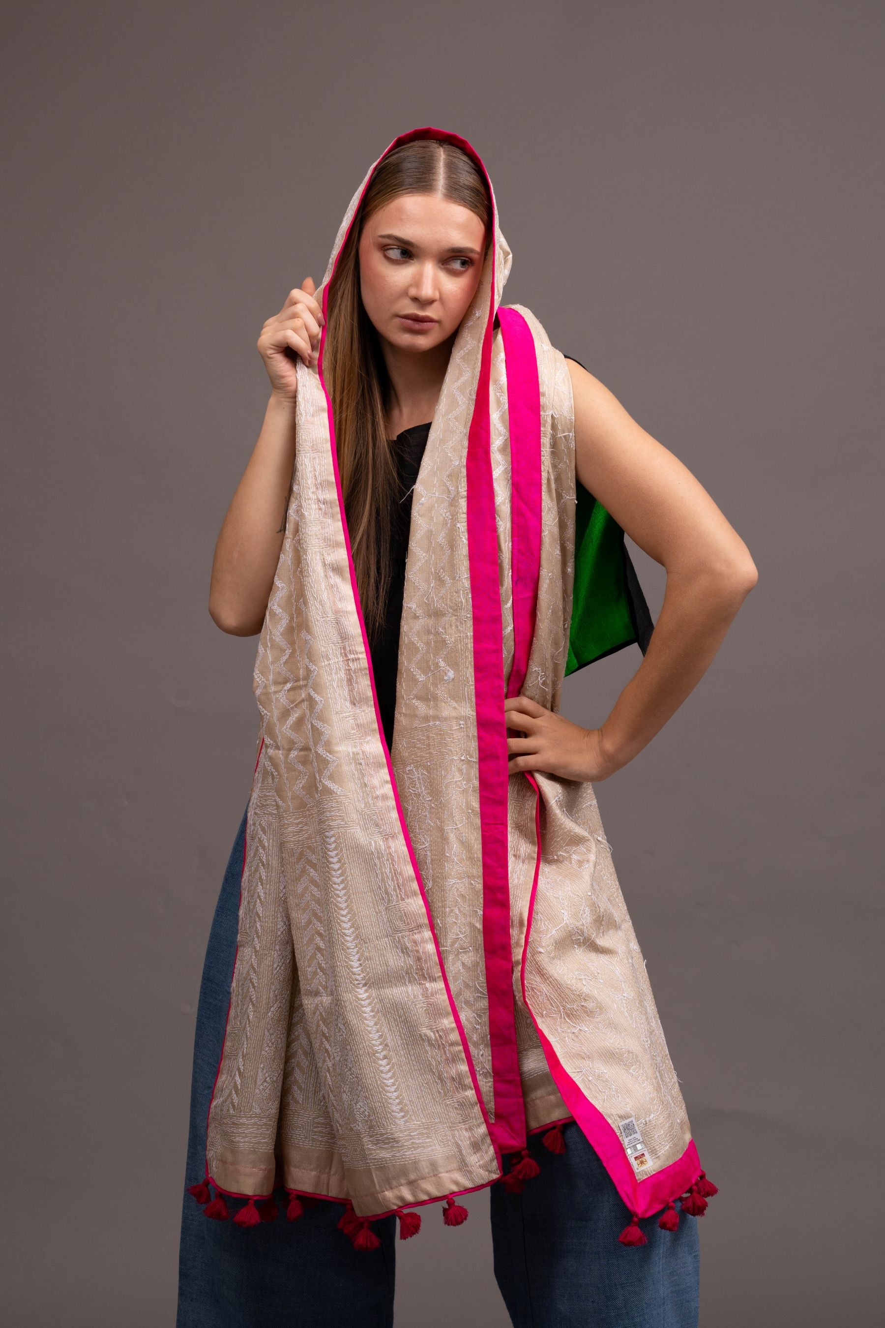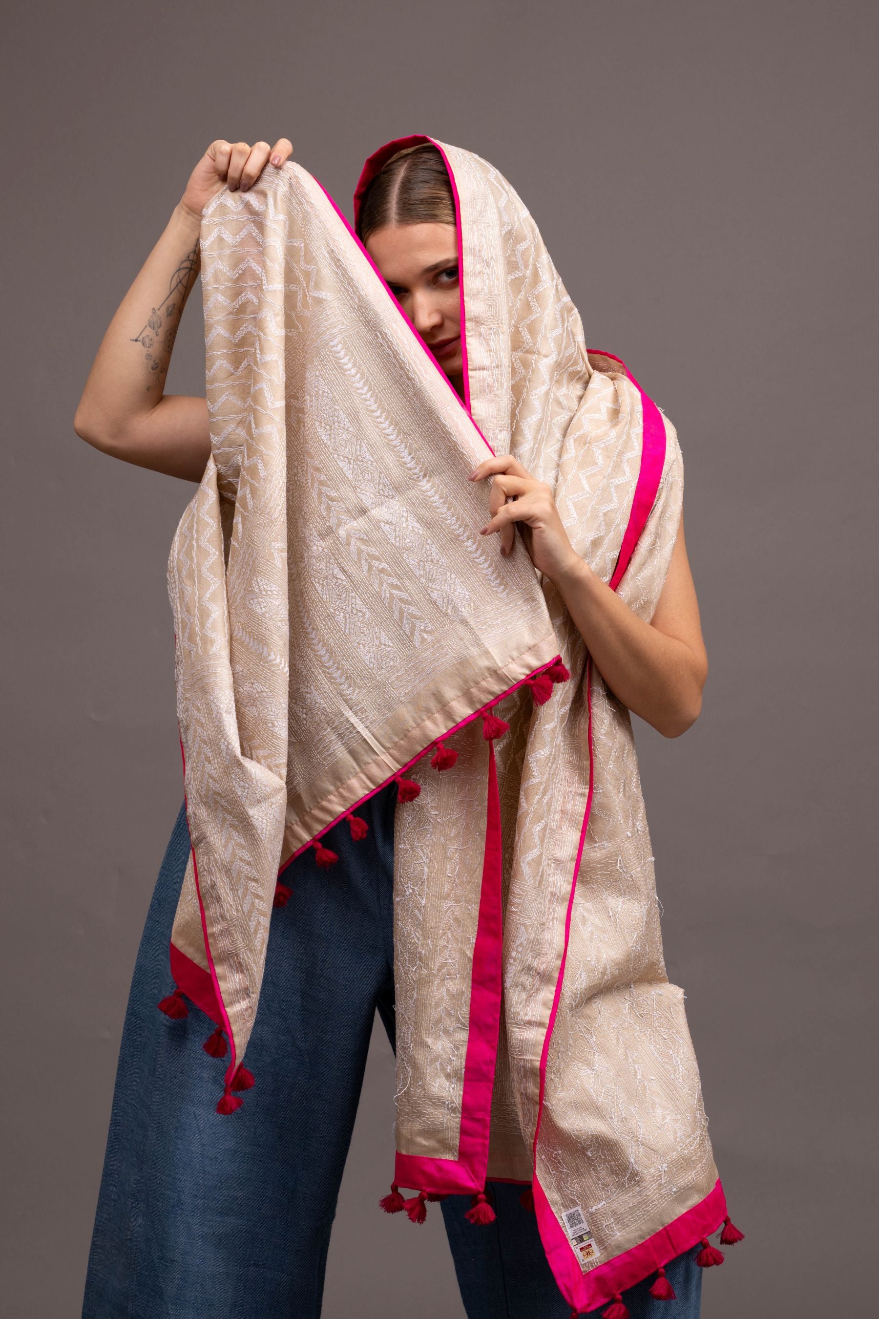 Hand embroidered kantha stitch on tussar silk - with tassels and contrast border edging.