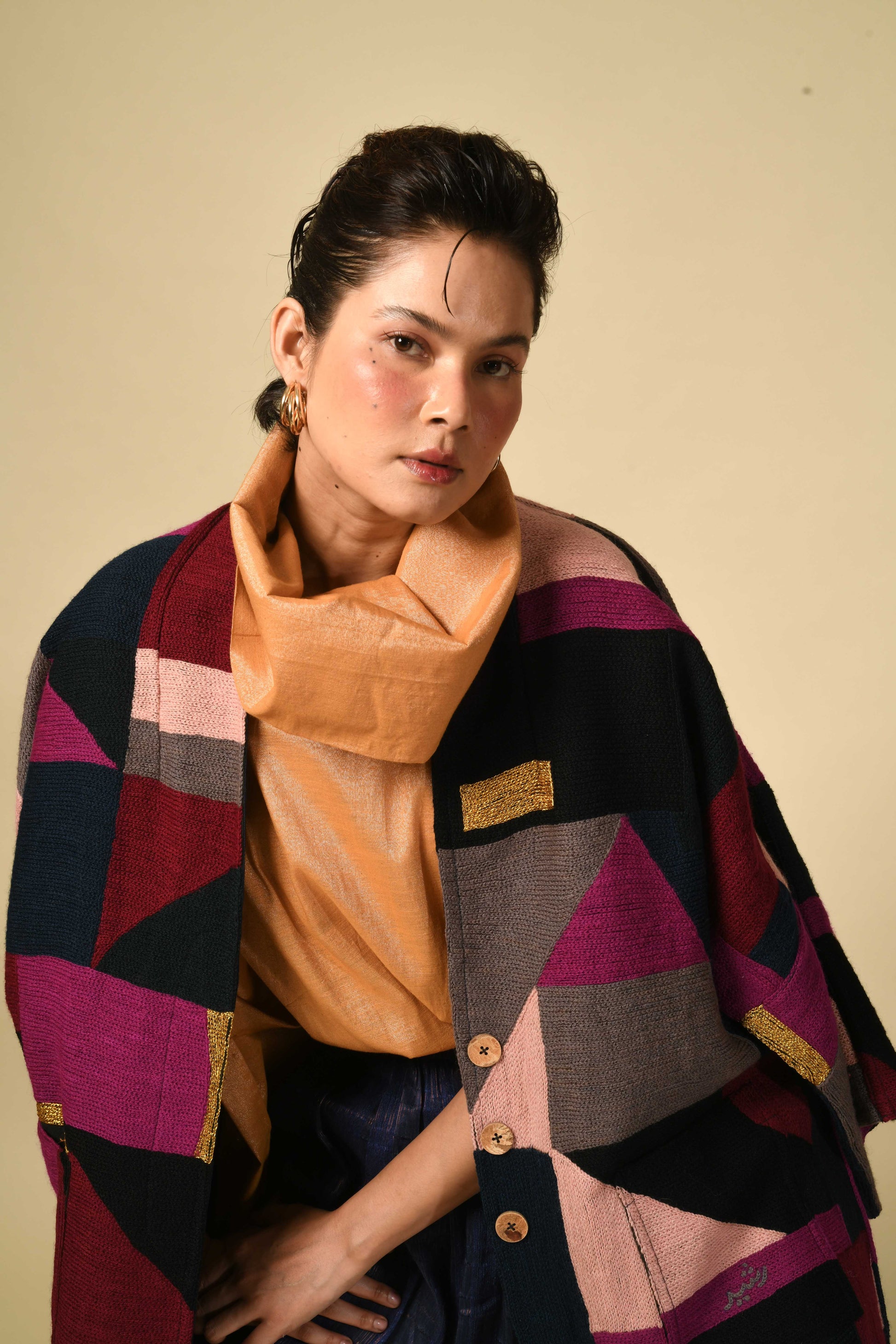 Our capsule collection of Kashmiri Crewel Duster Coats are heirloom pieces: rooted in a long history of crewel stitch and inspired by the timeless and Avant Garde patterns of Sonia Delaunay. These coats are a fresh interpretation of a traditional and famed Kashmiri embroidery technique. This piece is crafted in a range of blue shades with highlights in wheat, cream and golden zari.