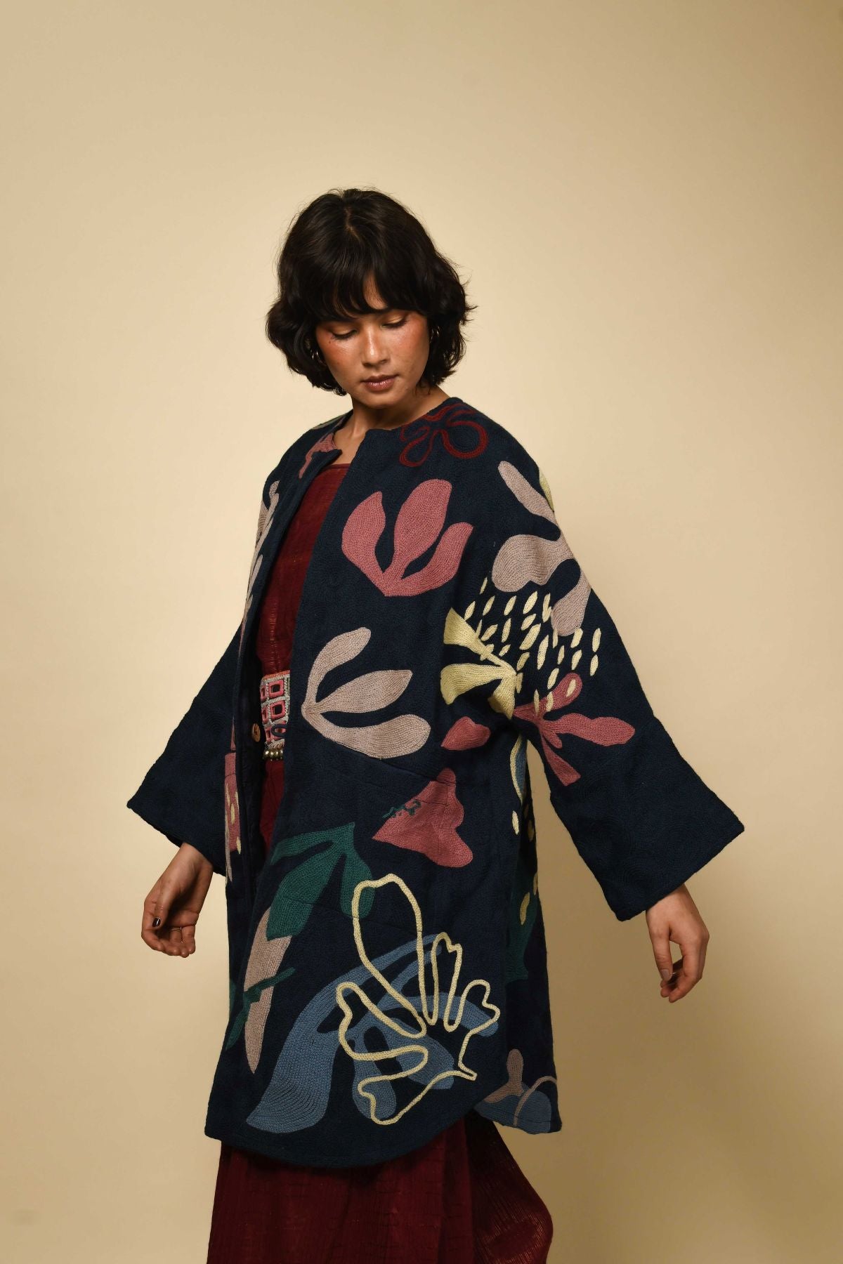 This newest capsule collection of Kashmiri Crewel Coats are heirloom pieces: rooted in a long history of crewel stitch & inspired by the sculptured, symbolic & organic motifs of Matisse's last decade of work creating papier découpé. These coats are a fresh interpretation of a traditional & famed Kashmiri embroidery technique.