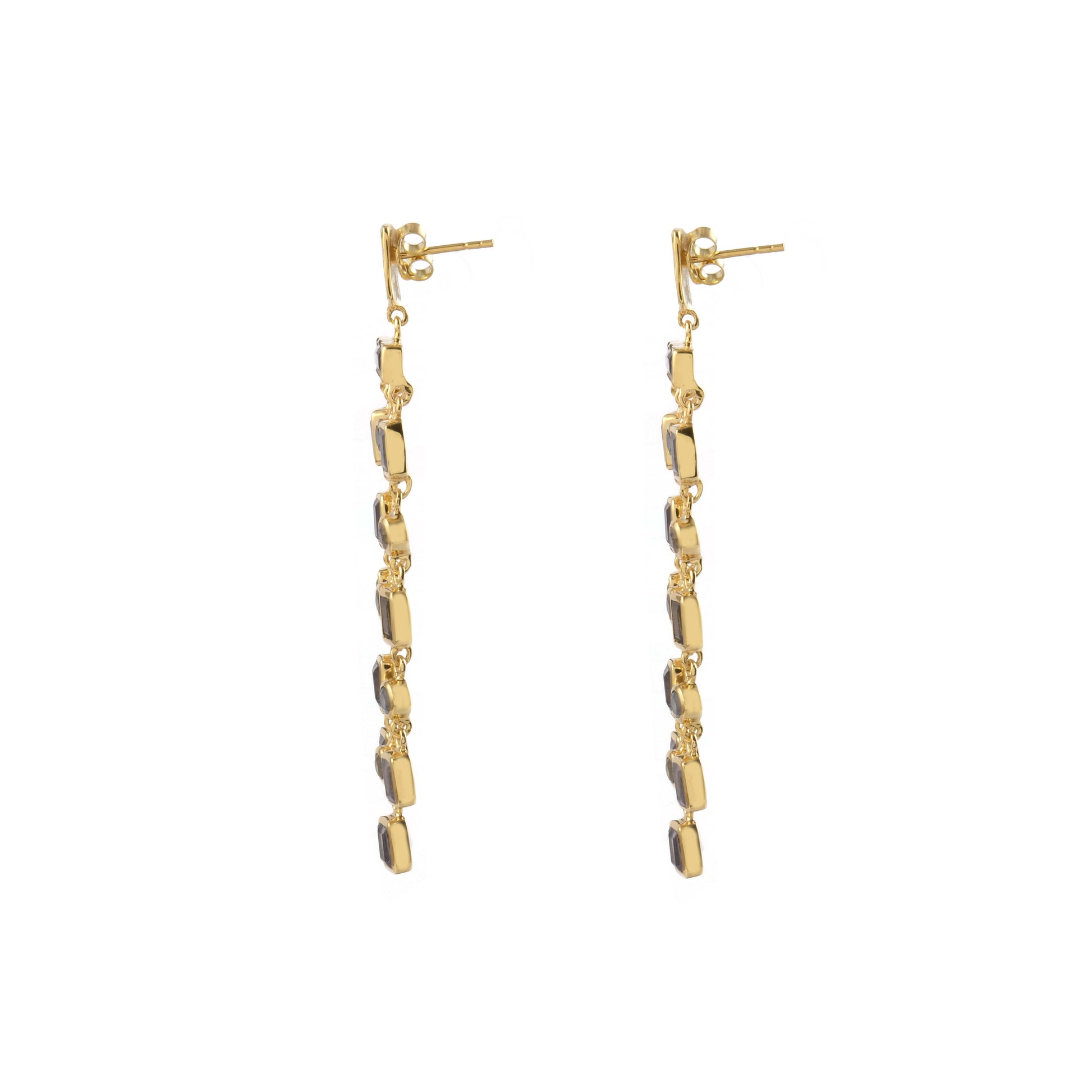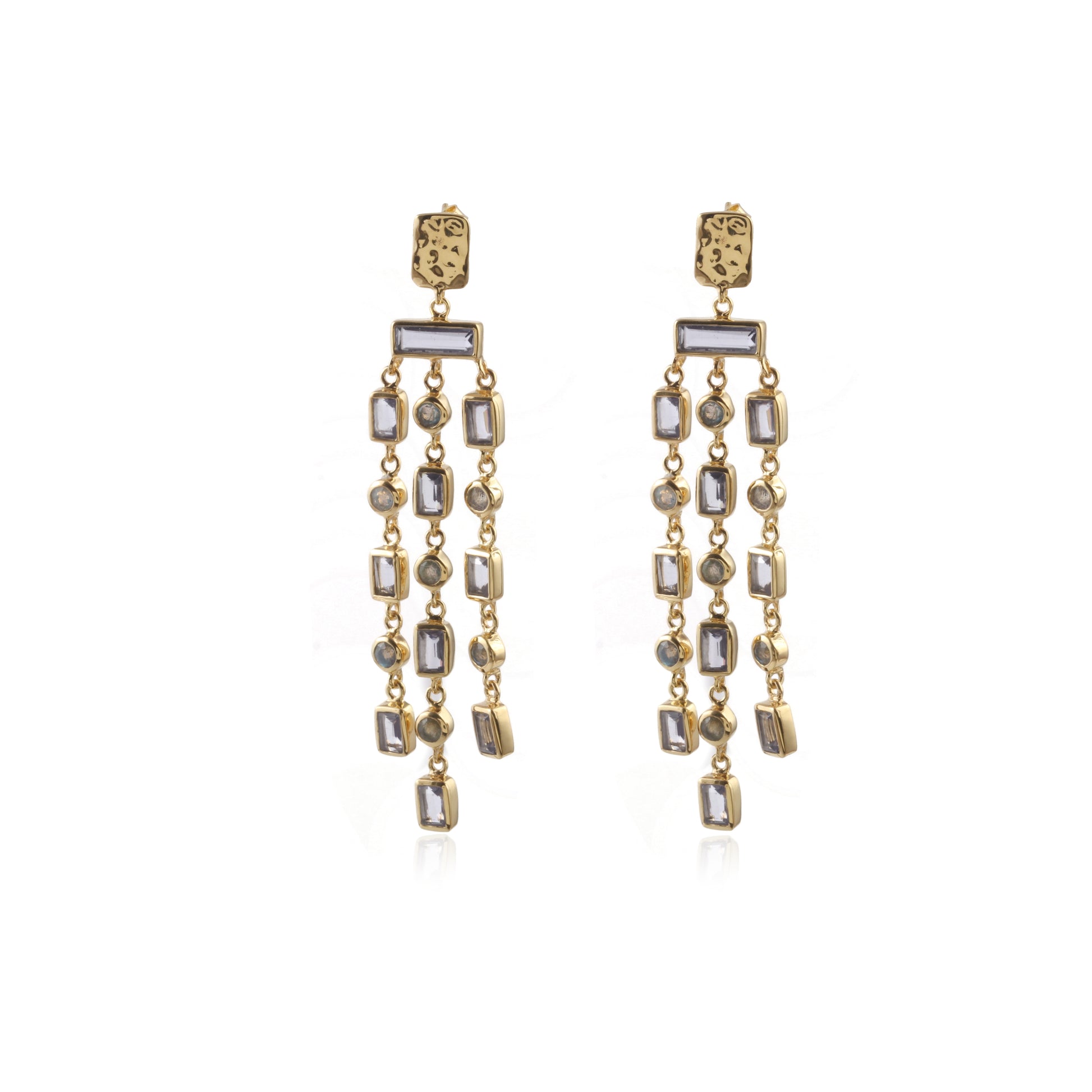 Your go to statement earrings! Round labradorite stones strung together with iolite colored glass bezel set in gold plated sterling silver.
