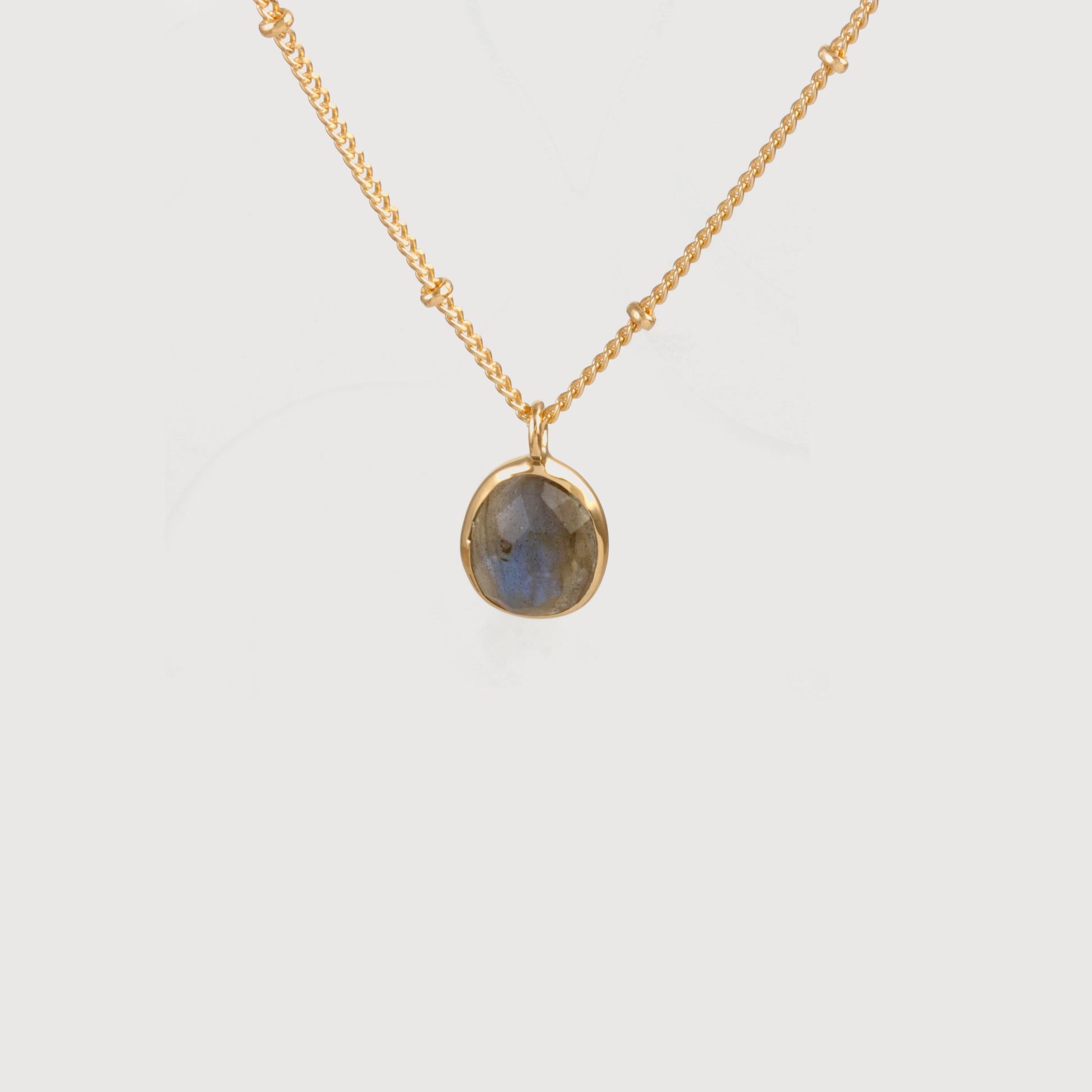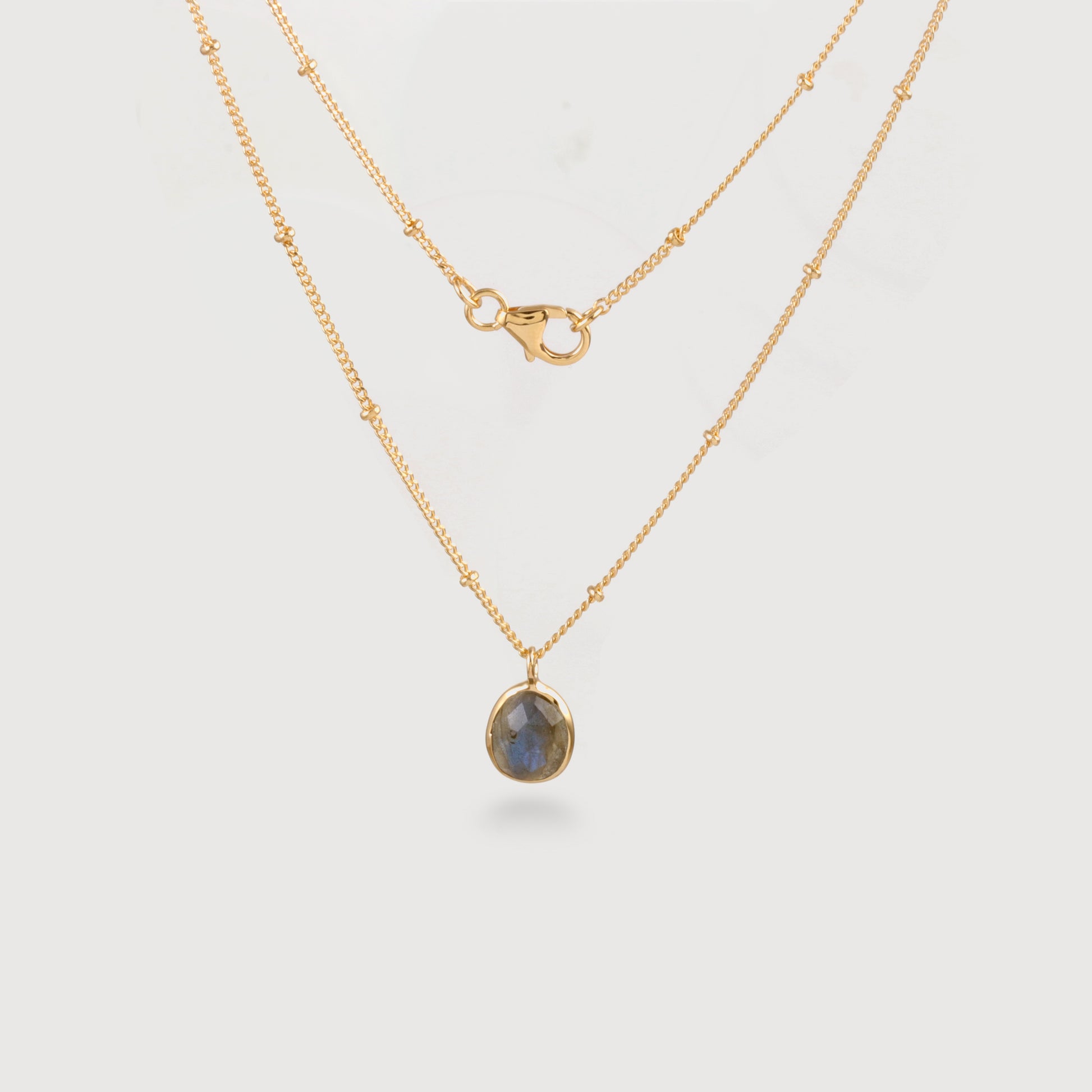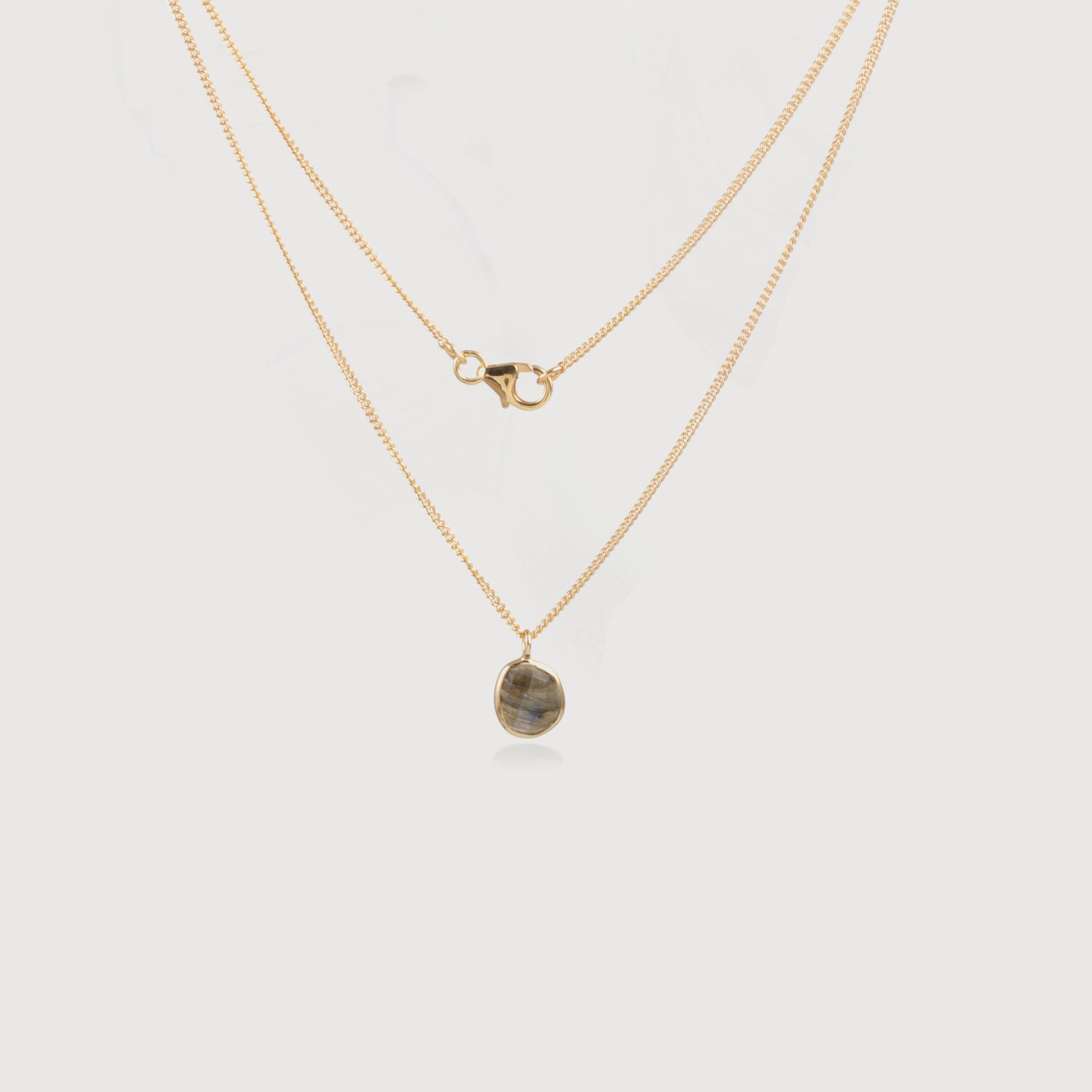 Oval bezel set Labradorite stone in sterling silver with 18 ct gold plated finish. The pendant comes with 2 chain options - 16" curb chain or 18" curb rawa chain. Ideal for layering or on its own.