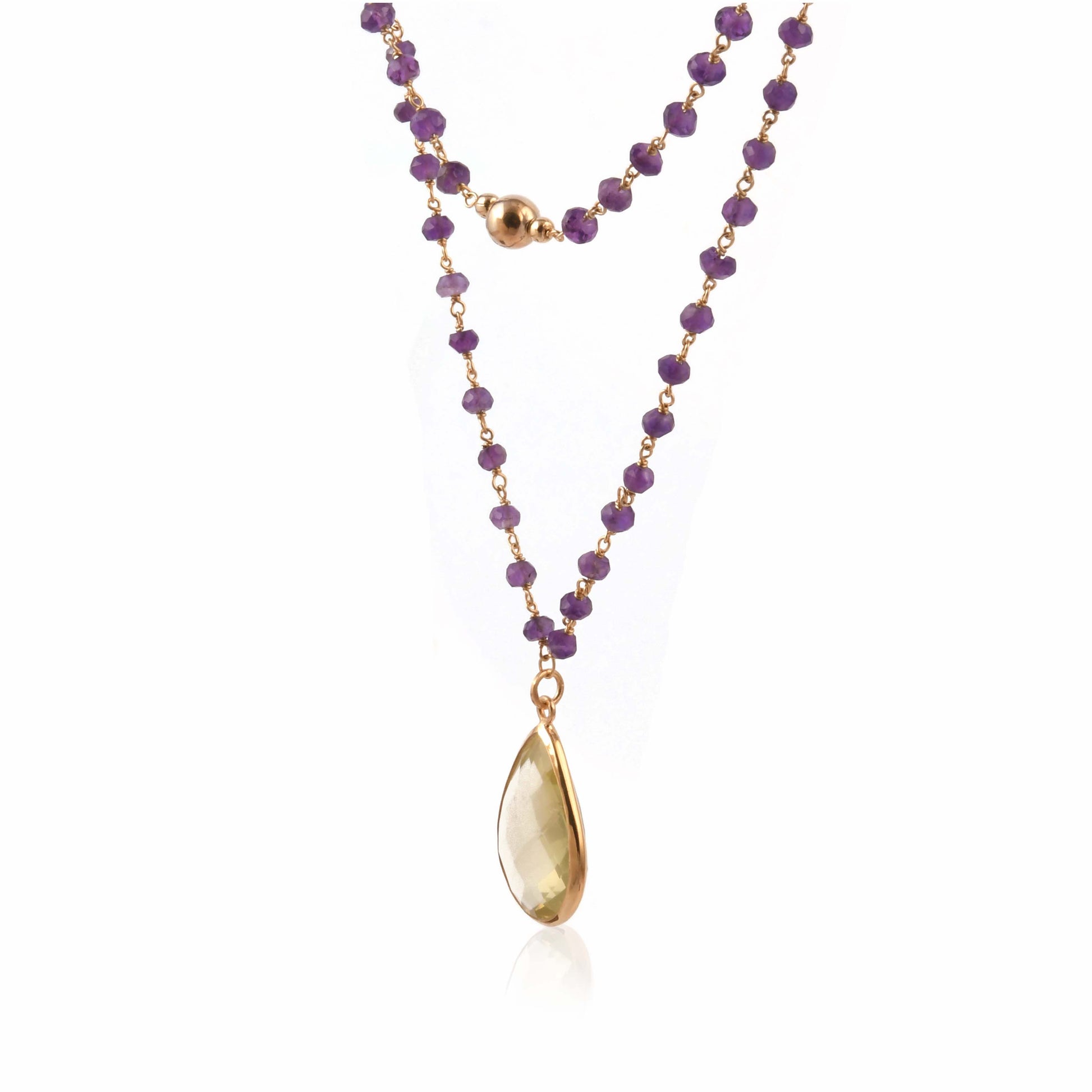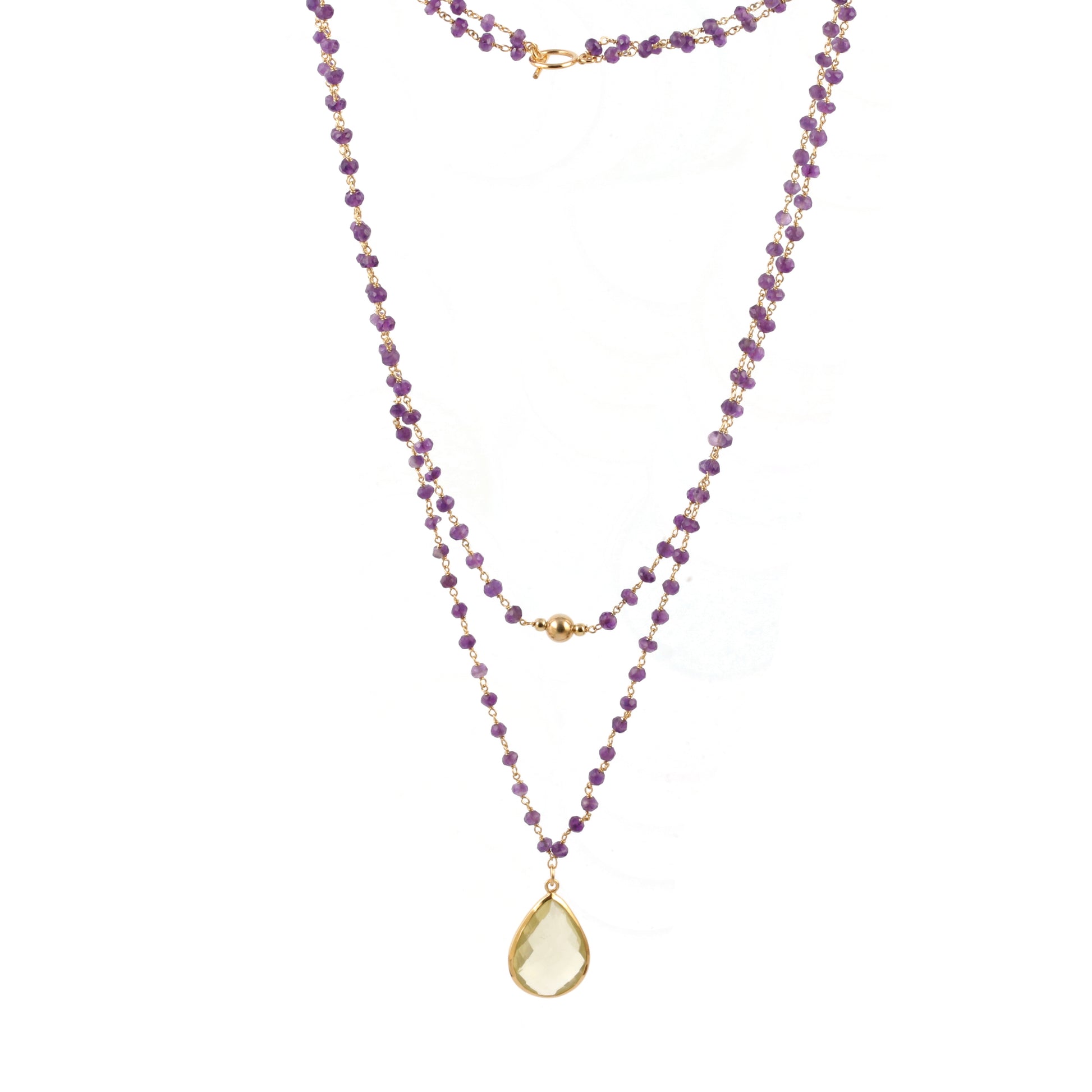Tear drop shaped lemon quartz stone pendant - necklace made of faceted amethyst beads strung in gold plated silver. Wear it double layered or as a lariat necklace - versatile enough.