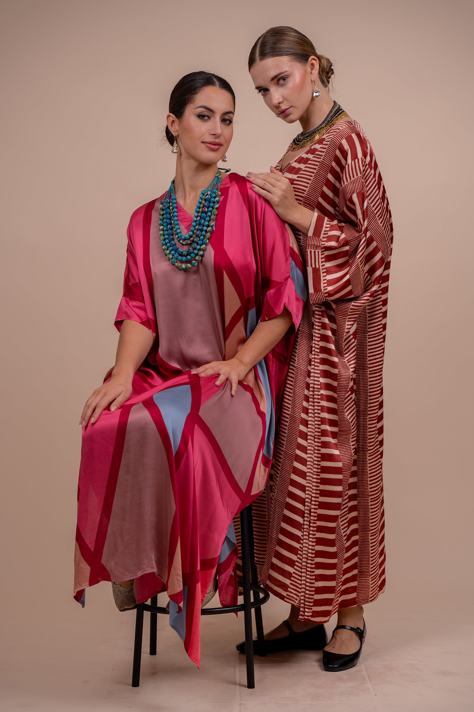 Effortless elegance meets comfort in this Modal Silk Printed Kaftan. Crafted from soft, breathable screen-printed modal fabric, this one-size piece features distinctive cuff sleeves and flowing side slits for easy movement. Perfect for lounging or casual outings, the timeless kaftan silhouette offers versatile style with minimal effort. The lightweight fabric drapes beautifully while maintaining its shape, making it an essential addition to any wardrobe.