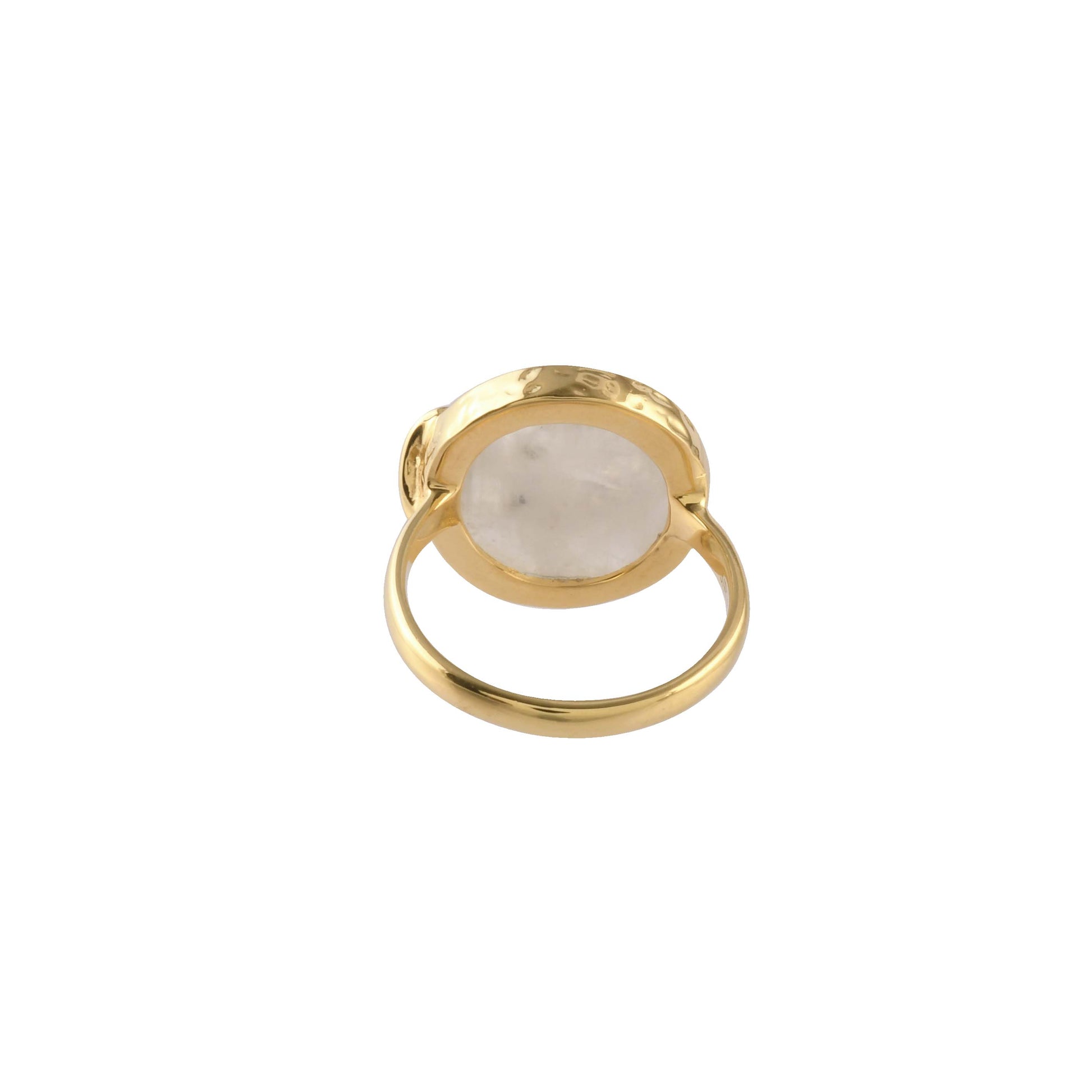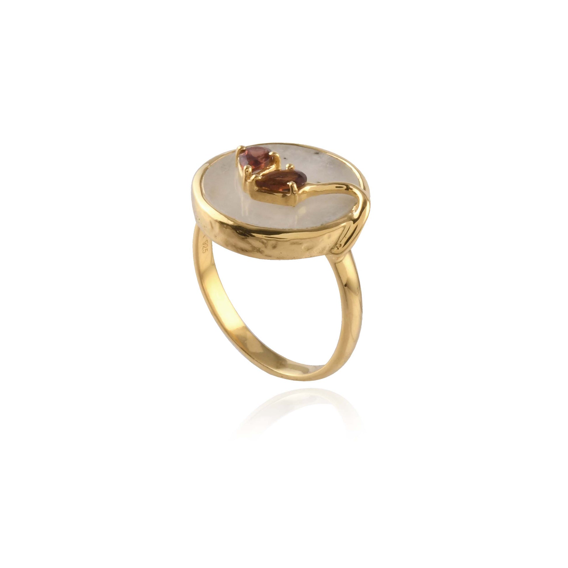 A smooth moonstone base meets sculptural gold detailing and deep garnet accents, creating a contemporary ring with a refined artistic edge.