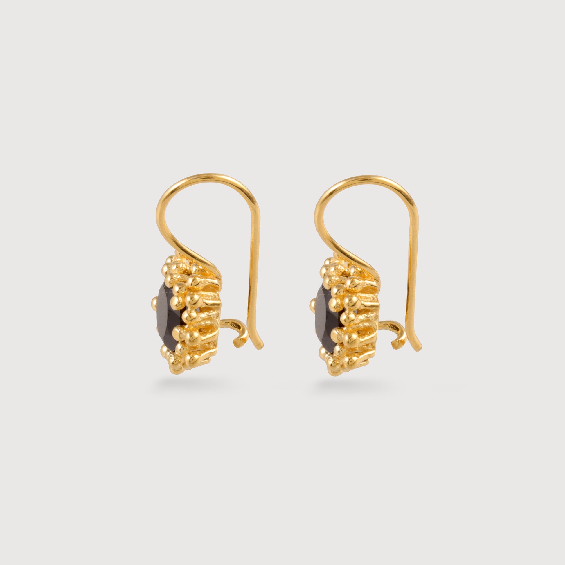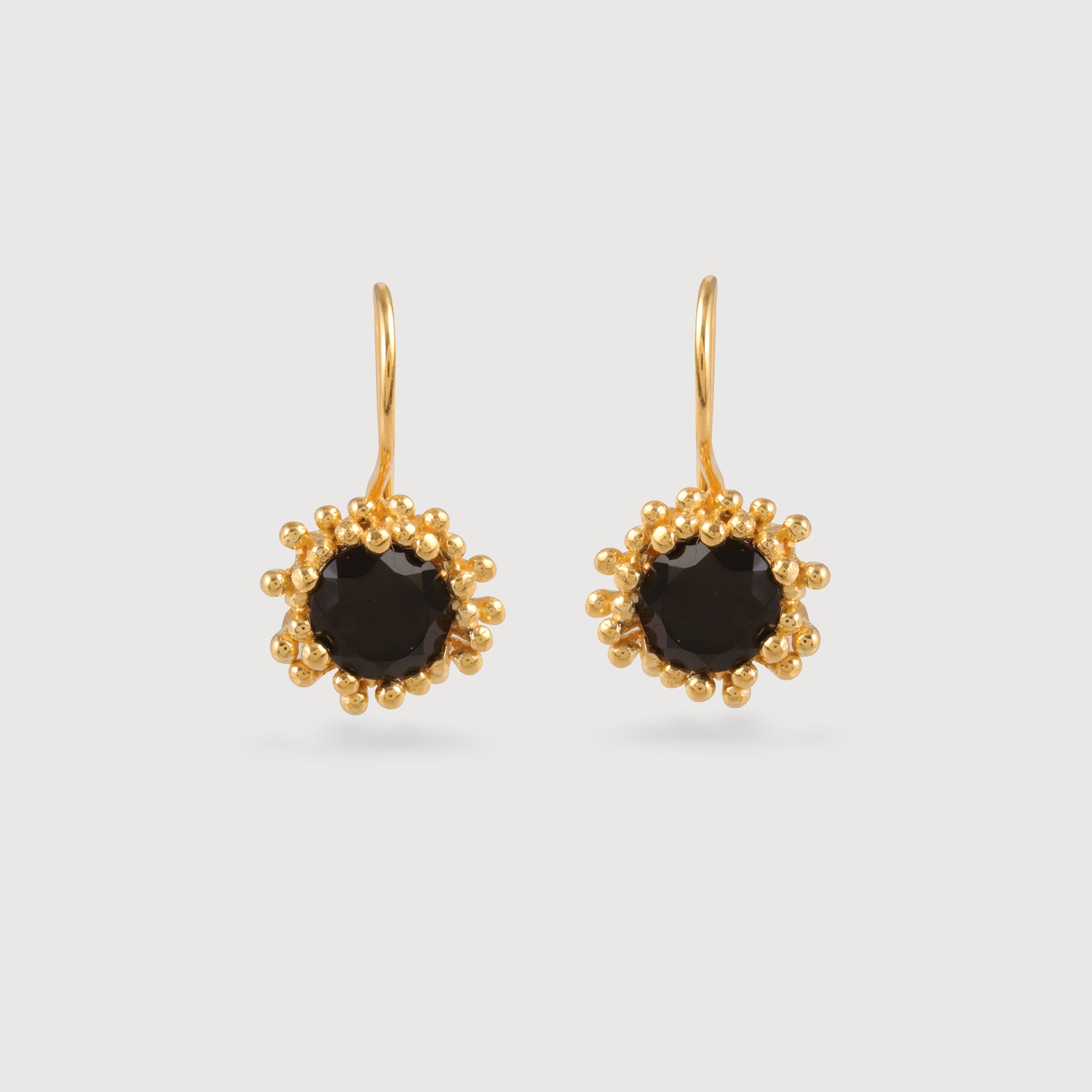 Crafted in 925 sterling silver with a 18 ct gold-plated finish, these elegant drop earrings feature a black onyx framed in a textured halo setting. The contrast between the deep black stone and warm gold tones creates a refined yet striking look.