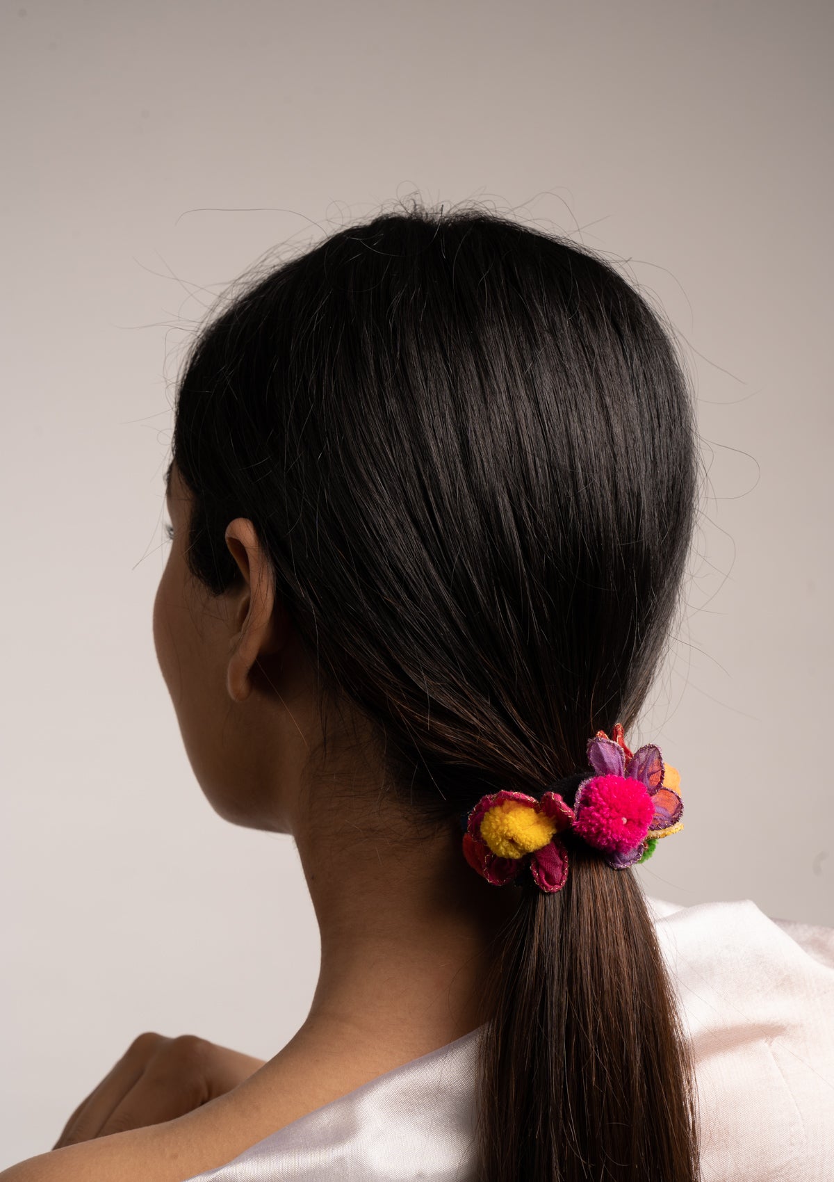 Floral Rubber band with pom poms.