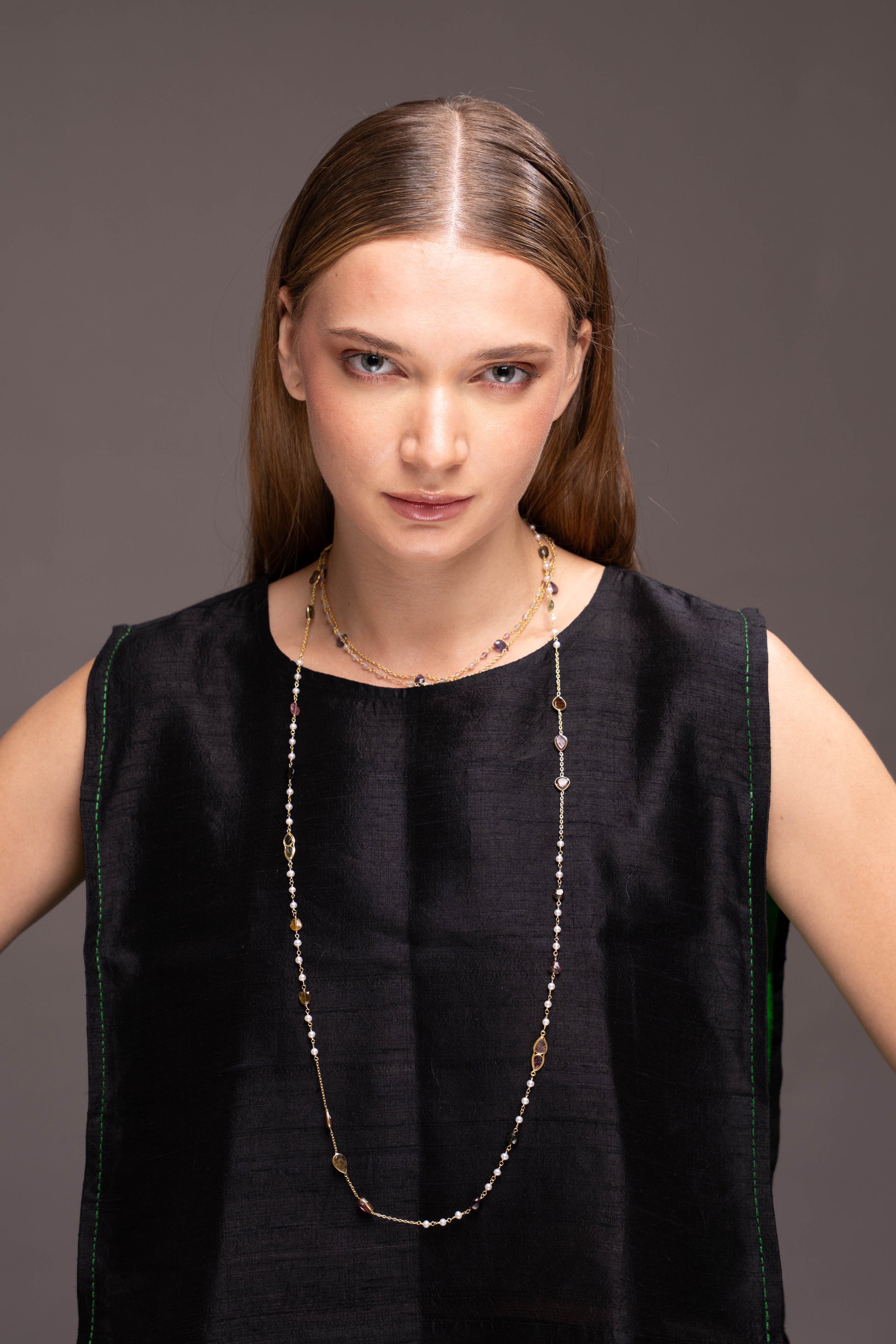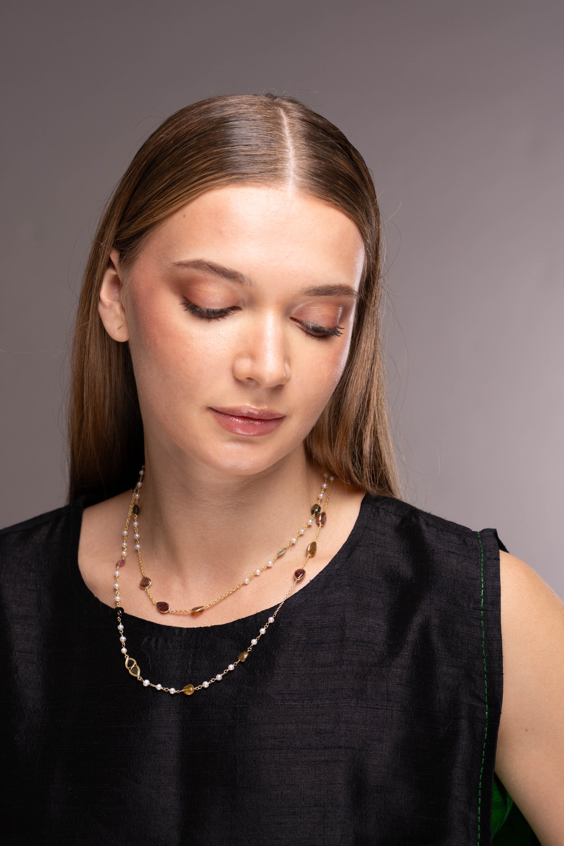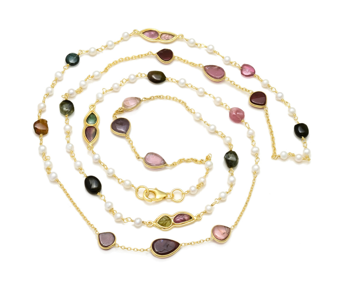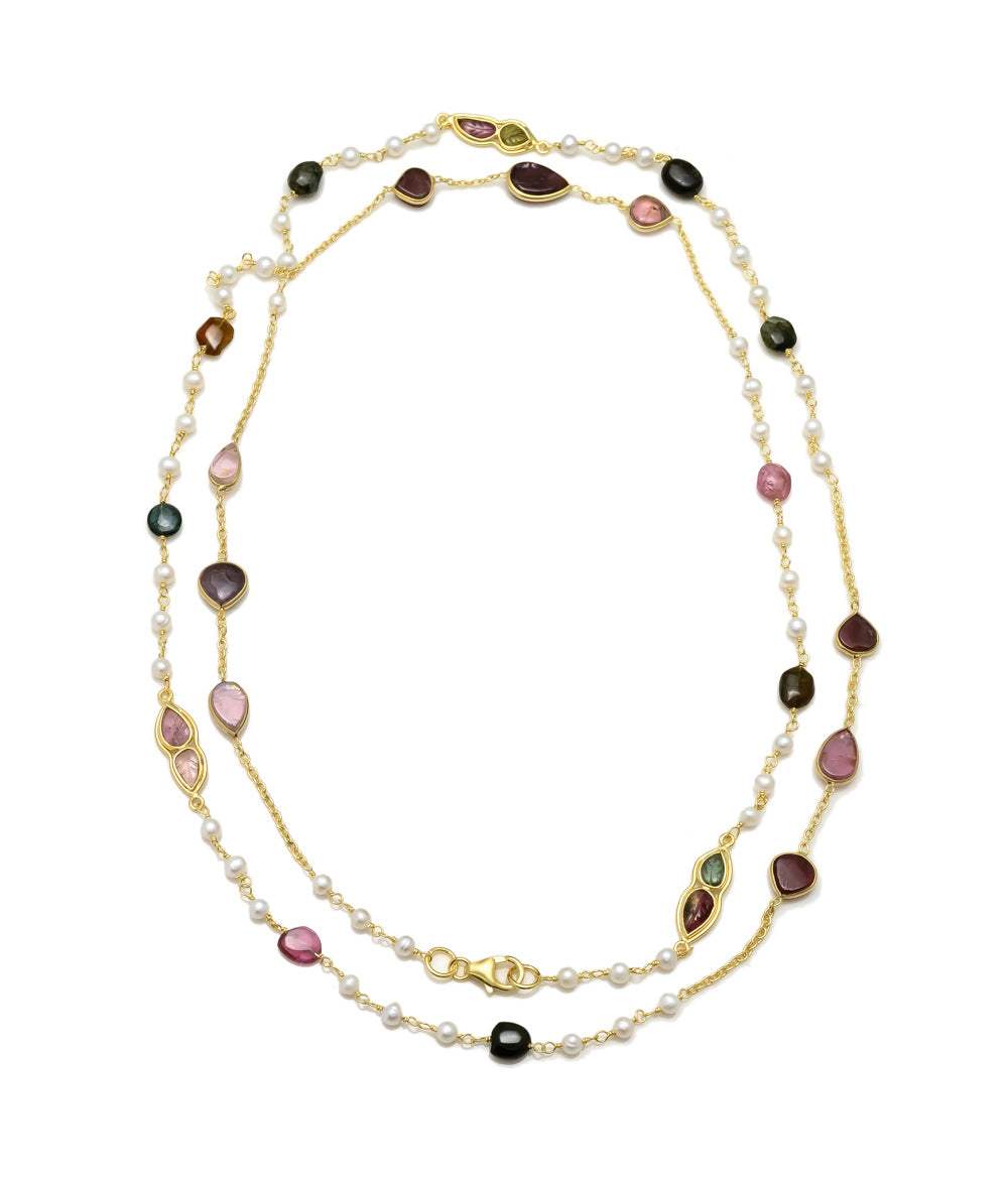 Classic pairing of pearls with tourmalines - never out of fashion. Double layer it or wear it solo.