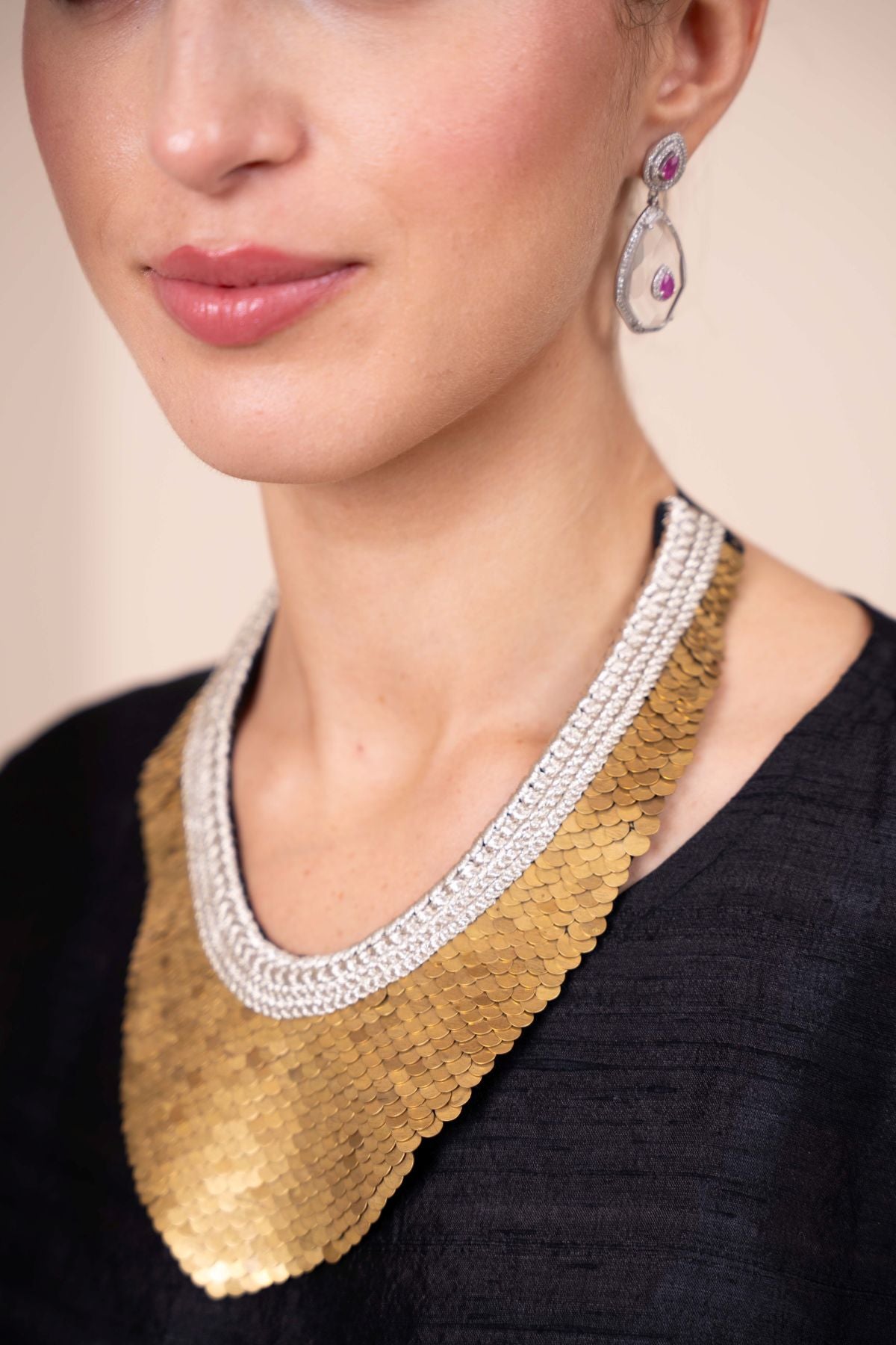 A striking neck piece, beaded by hand using brass sequins and zari. The necklace is adjustable and can be tied according to the length needed.