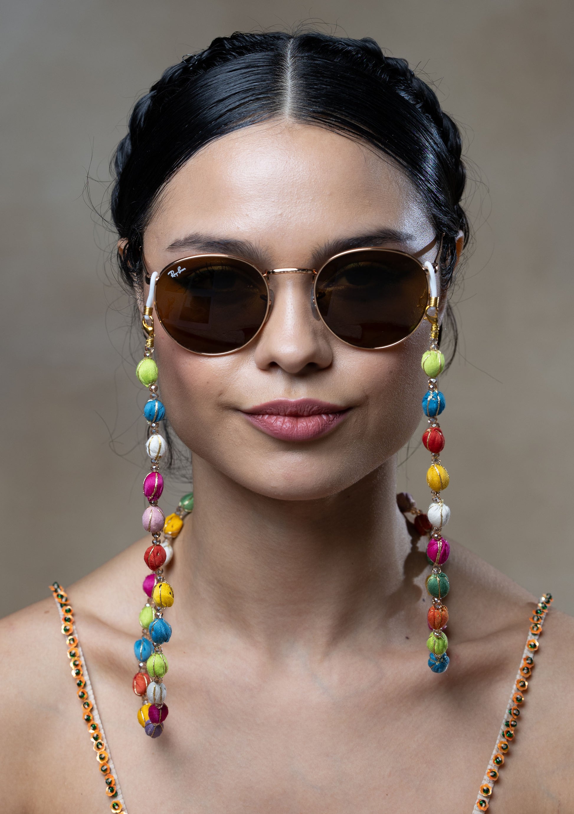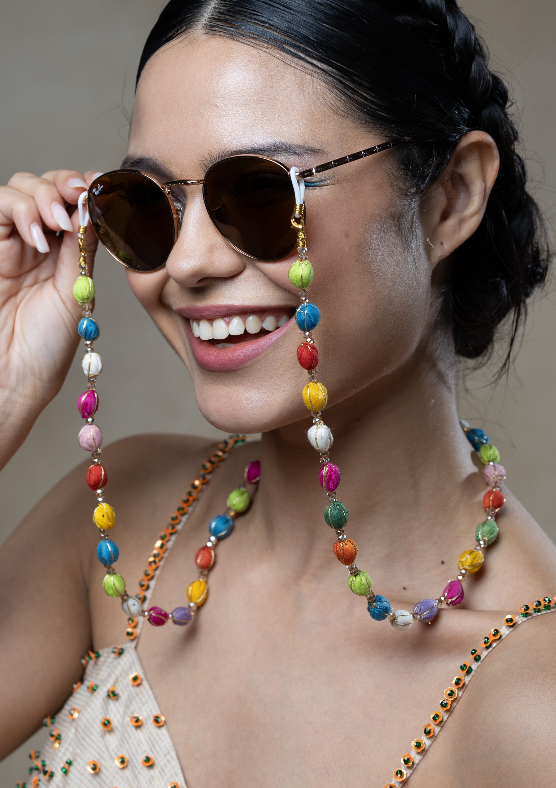 Bursting with colors and festivity, the Puranpoli Eyewear Chain mirrors the playful spirit of village "Holi colors" (Indian Festival) multicolored silk-thread wrapped beads with intricate detailing.