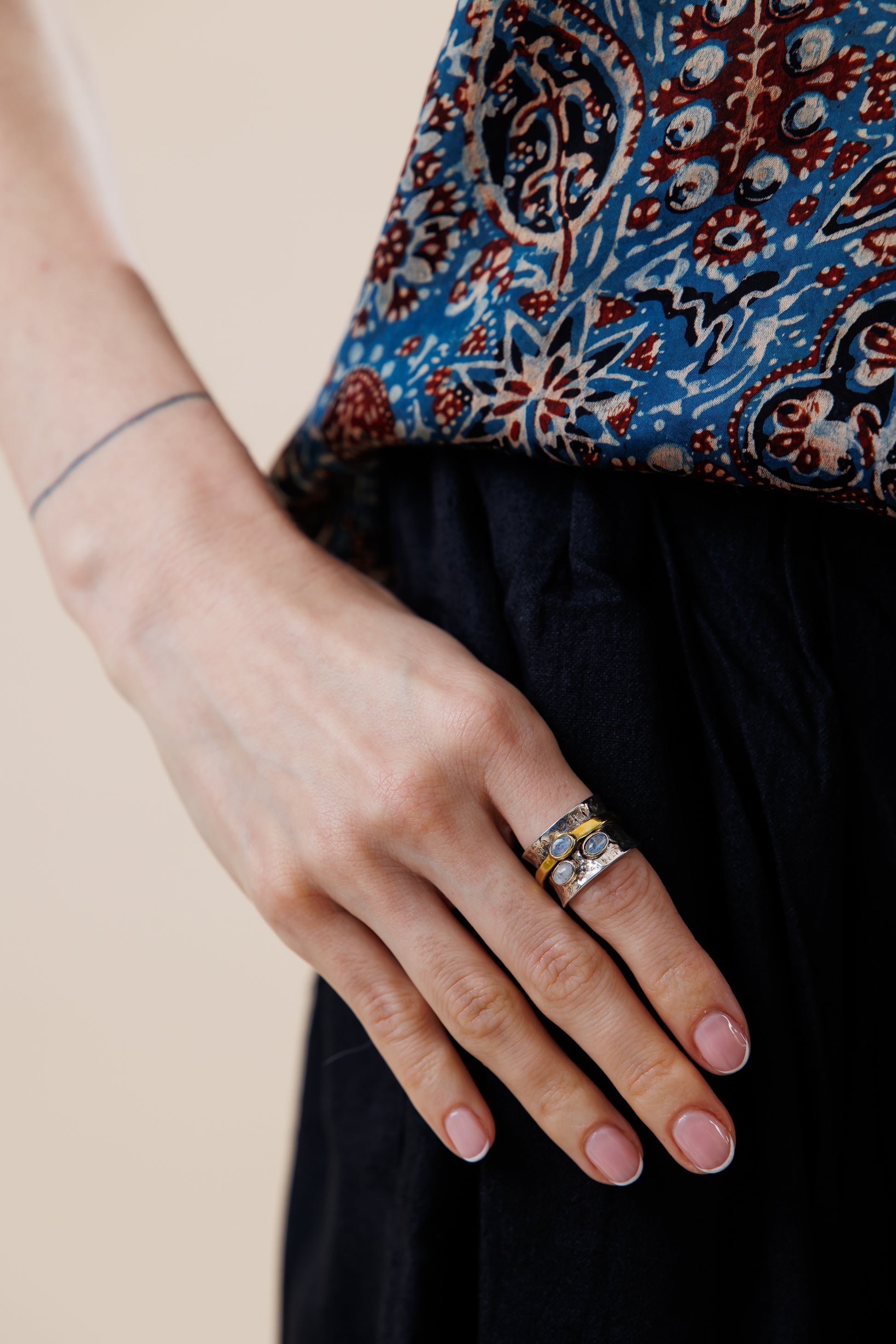 Cabochan cut rainbow moonstones set on a broad band of silver in an oxidised finish with a movable brass band in the middle.
