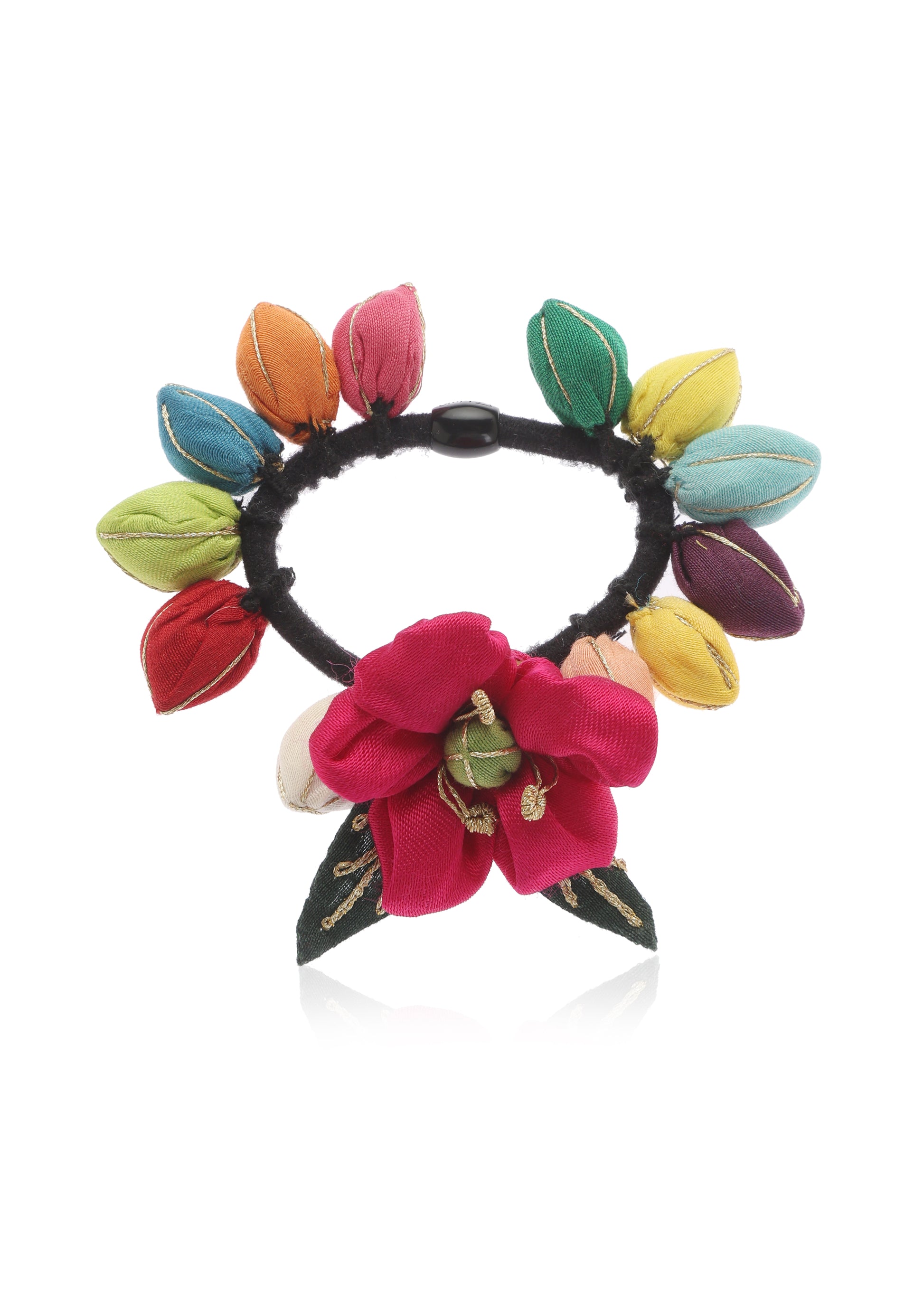 Satrangi rubber band featuring a striking bright pink flower at its center, surrounded by colorful buds and lush green leaves.