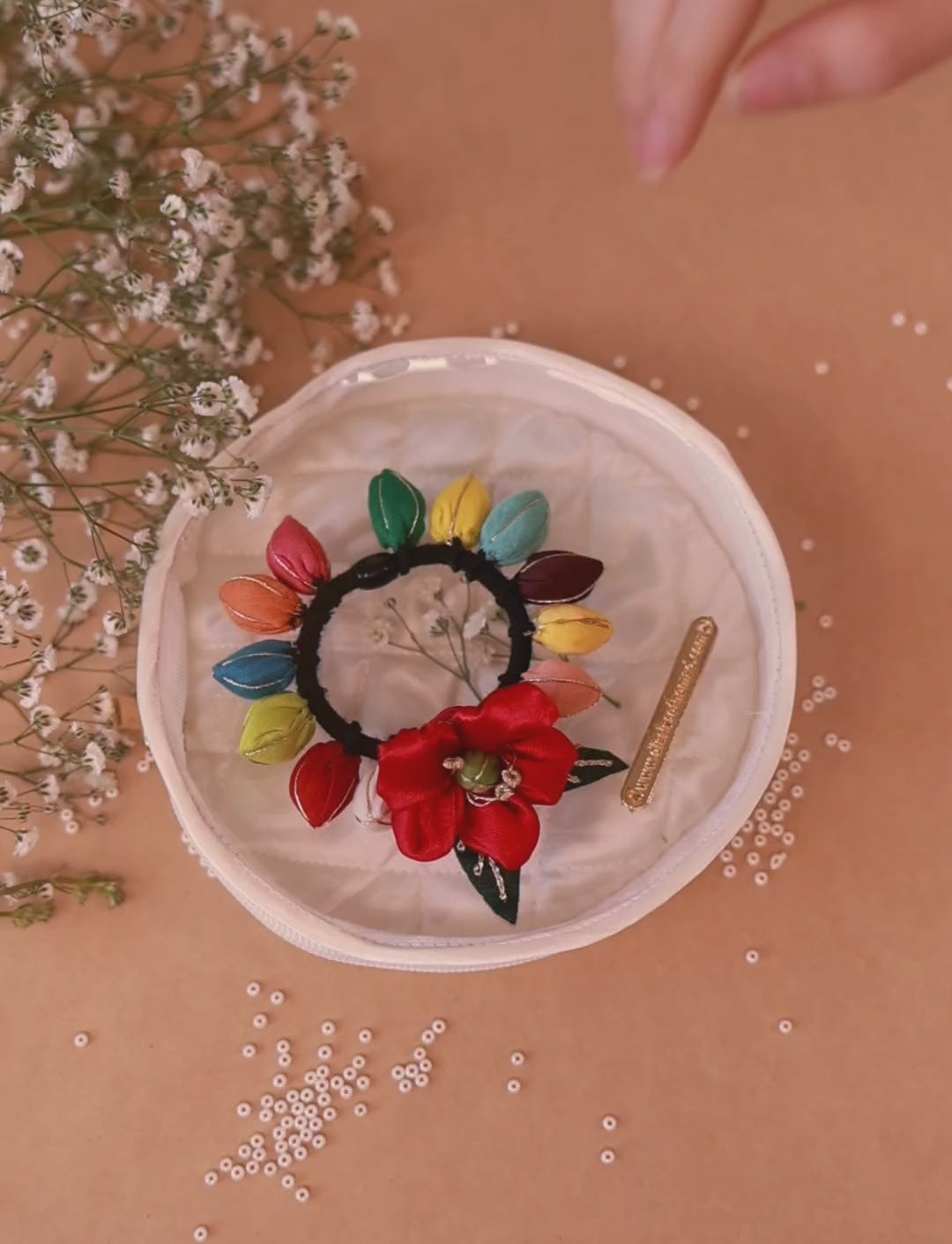 - Hand rolled flower bulbs are intricately crafted with soothing Vaijayanti Mala beads.