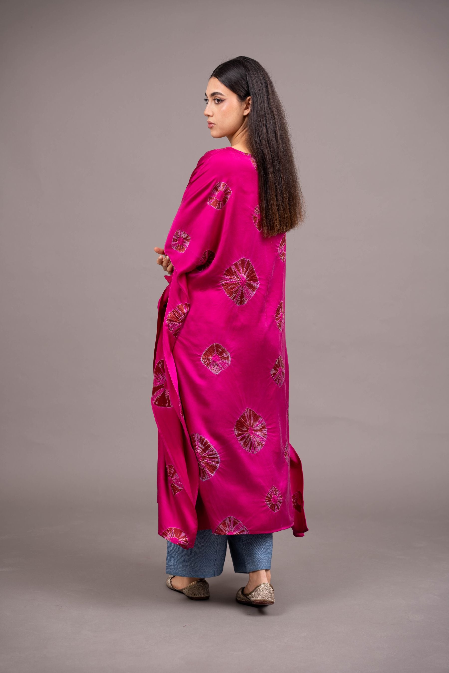 - Handcrafted from lux satin silk -embellished with a bold, mega bandhani scattered organically across the surface; a thoroughly contemporary aesthetic achieved from this ancient craft.
