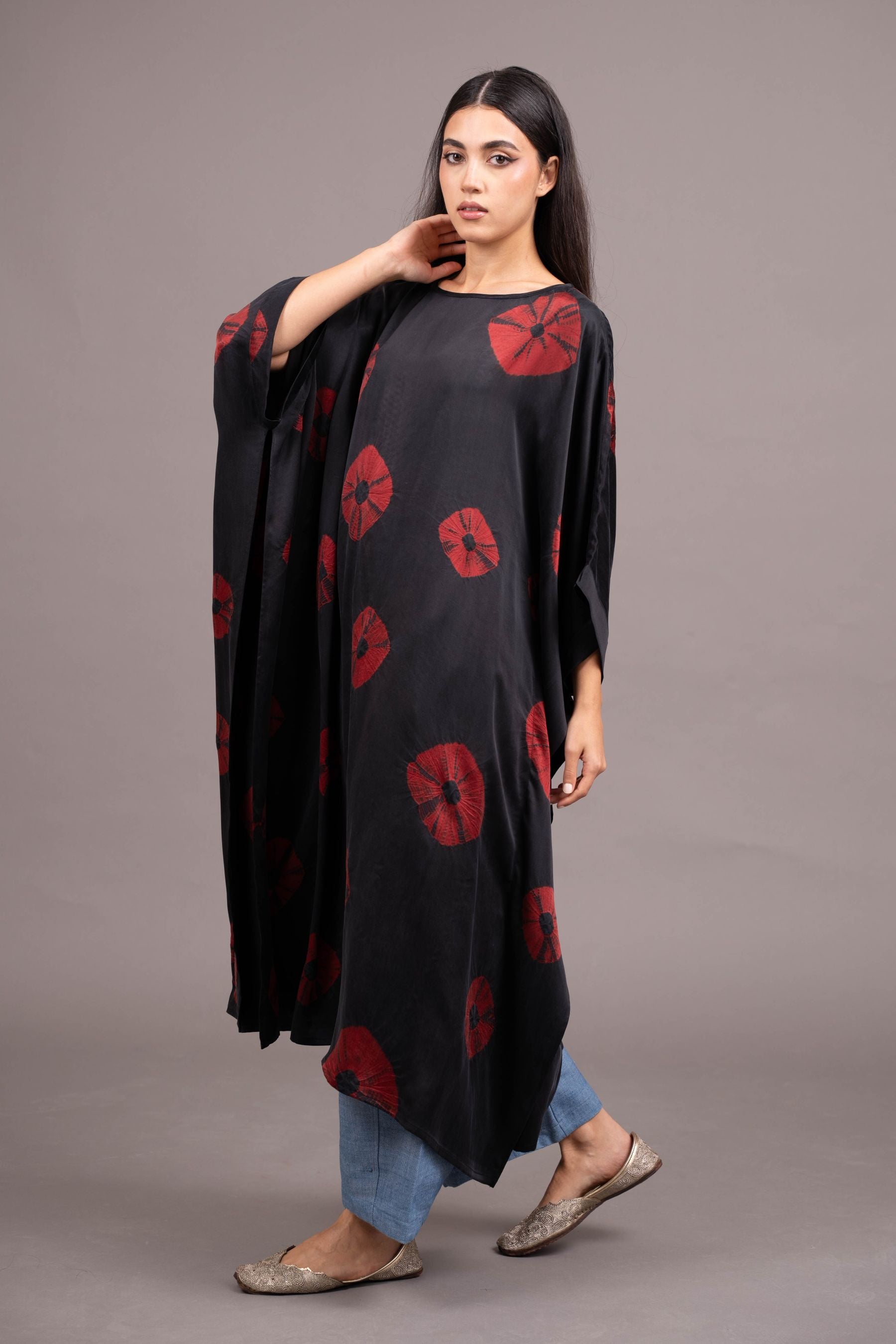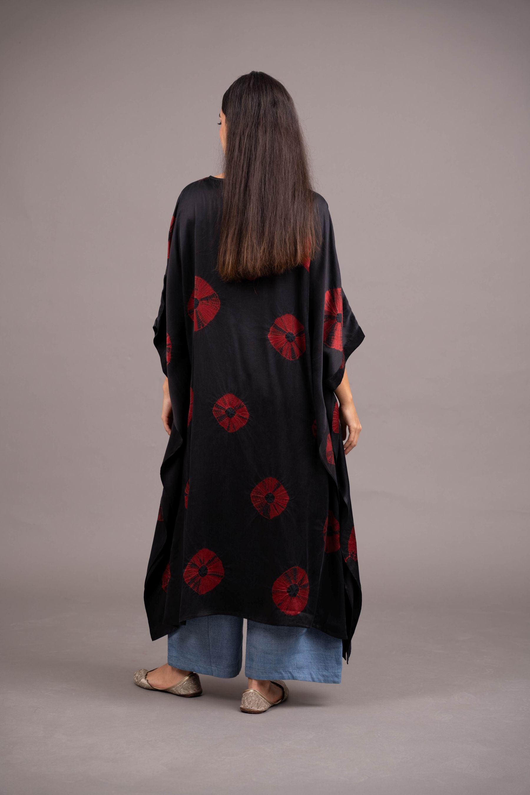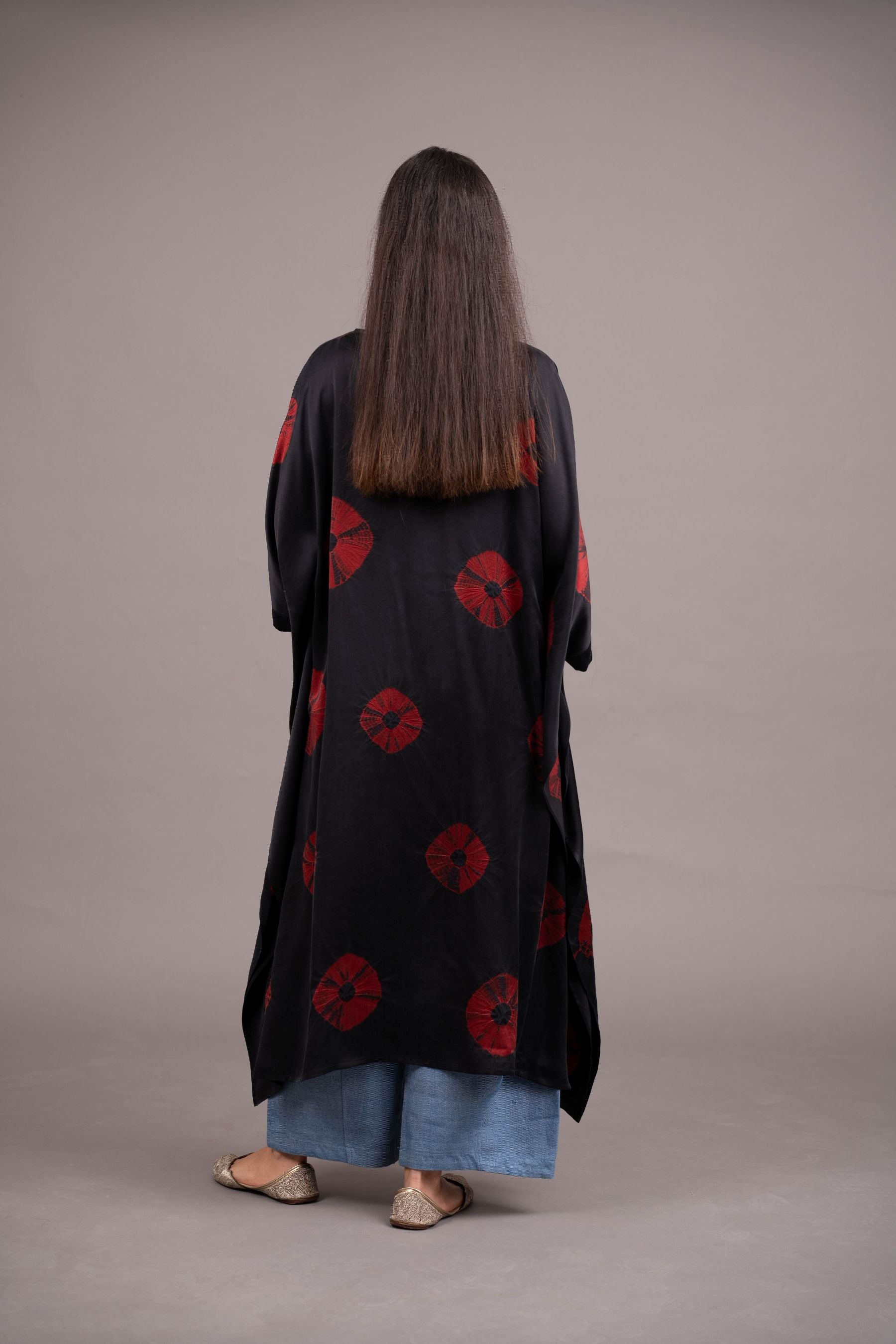 - Handcrafted from lux satin silk -embellished with a bold, mega bandhani scattered organically across the surface; a thoroughly contemporary aesthetic achieved from this ancient craft.