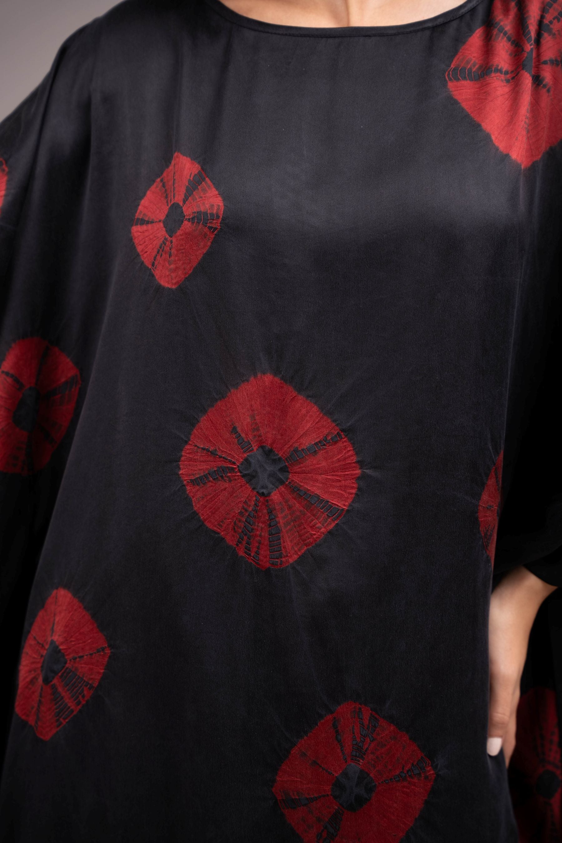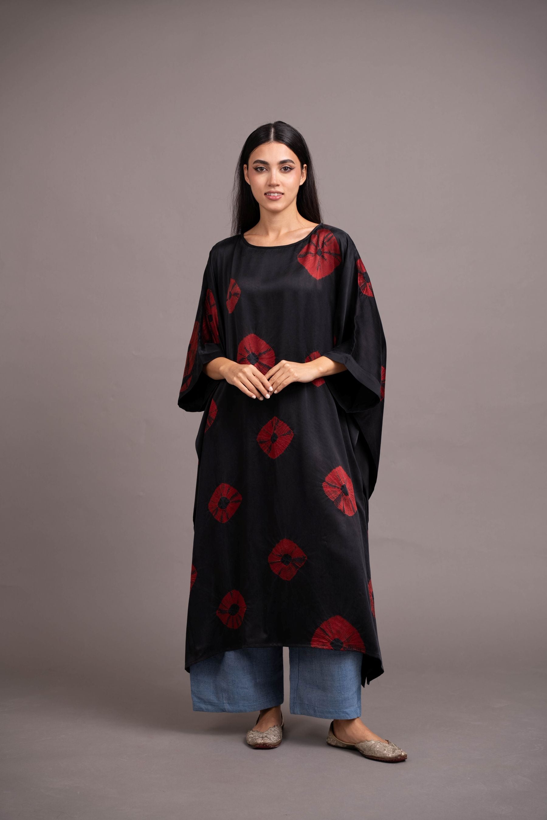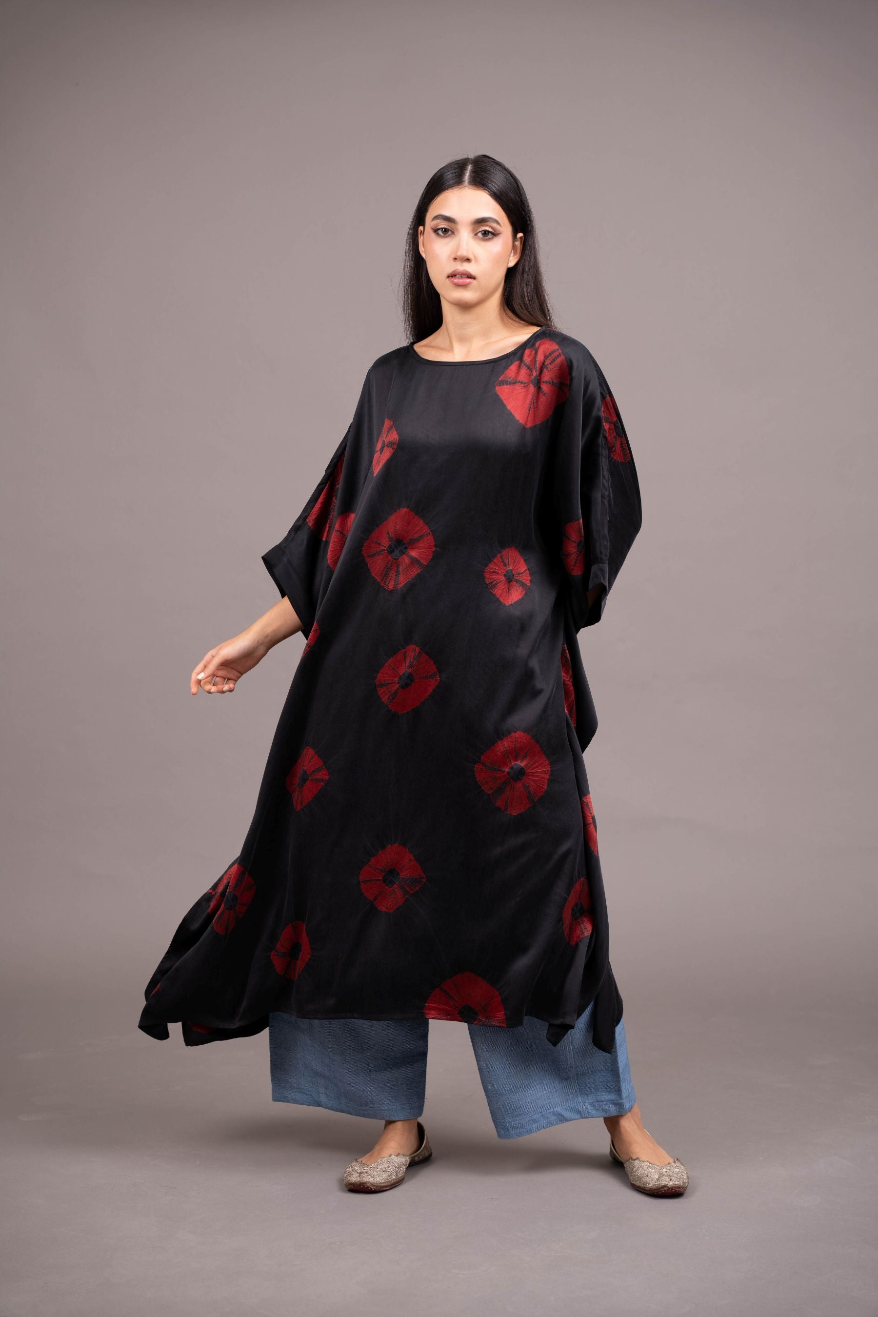- Handcrafted from lux satin silk -embellished with a bold, mega bandhani scattered organically across the surface; a thoroughly contemporary aesthetic achieved from this ancient craft.