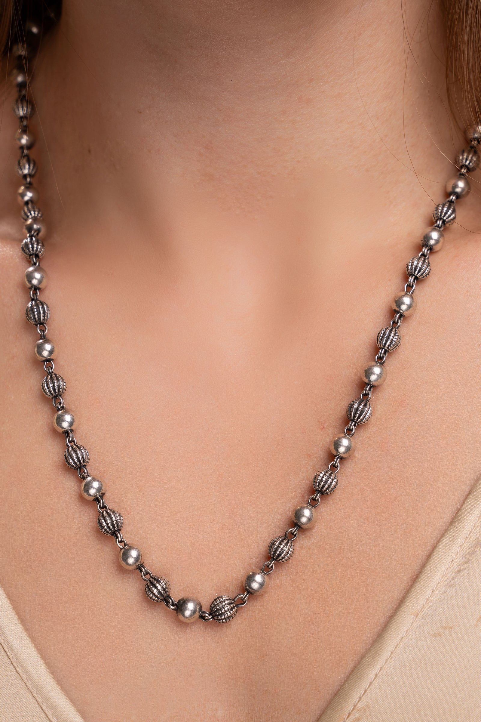 Plain silver balls and engraved silver balls alternated to make this bohemian / tribal vintage finish silver chain necklace.