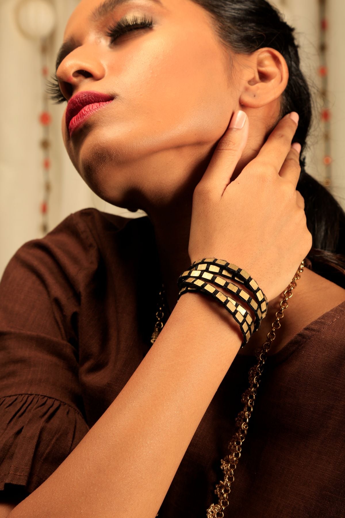 Our Bracelet square is made using brass square nuggets that are woven intricately into a wraparound bracelet. Grungy and elegant, this versatile bracelet is designed to be used in multiple ways. Long enough to wear as a necklace or even a belt!0