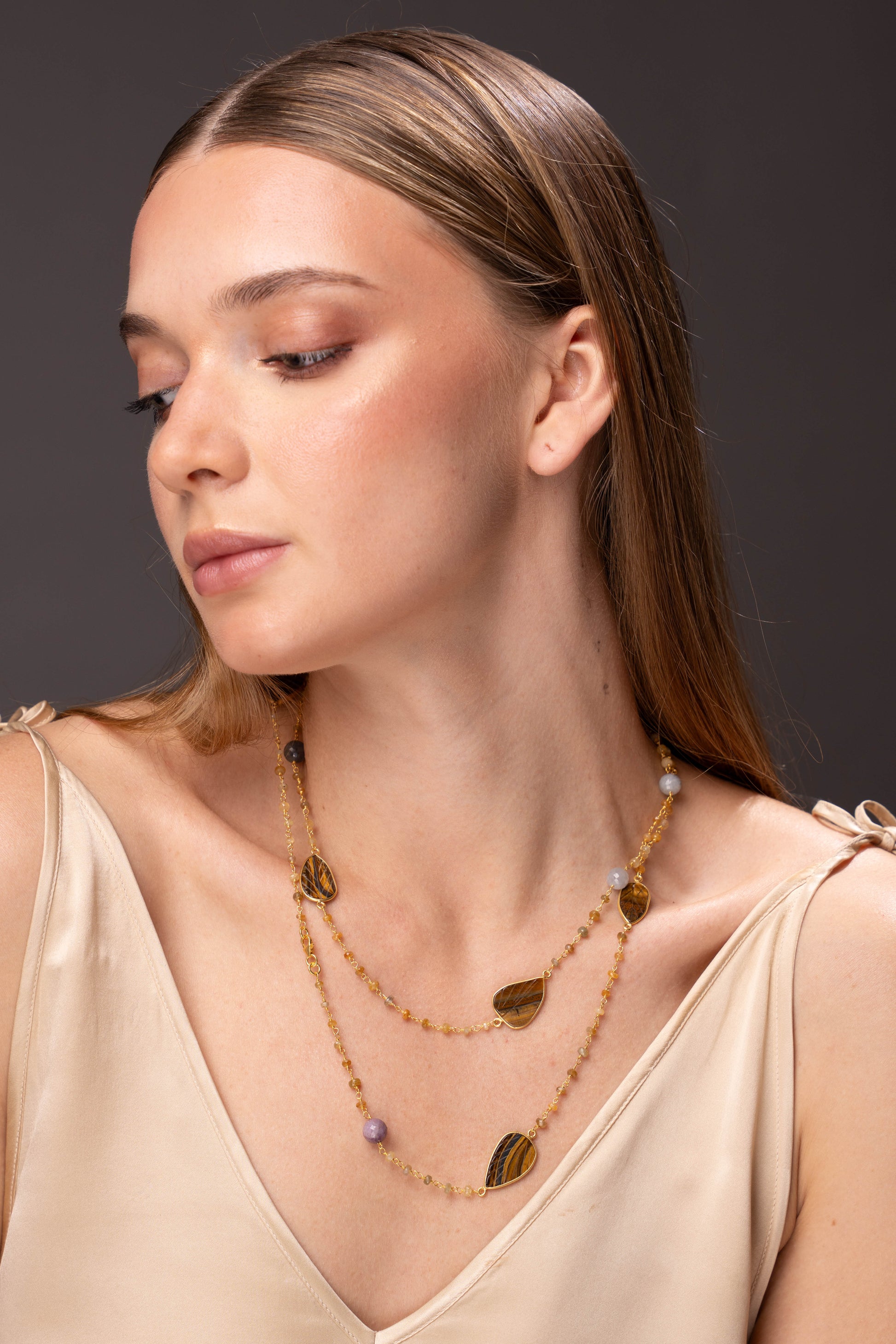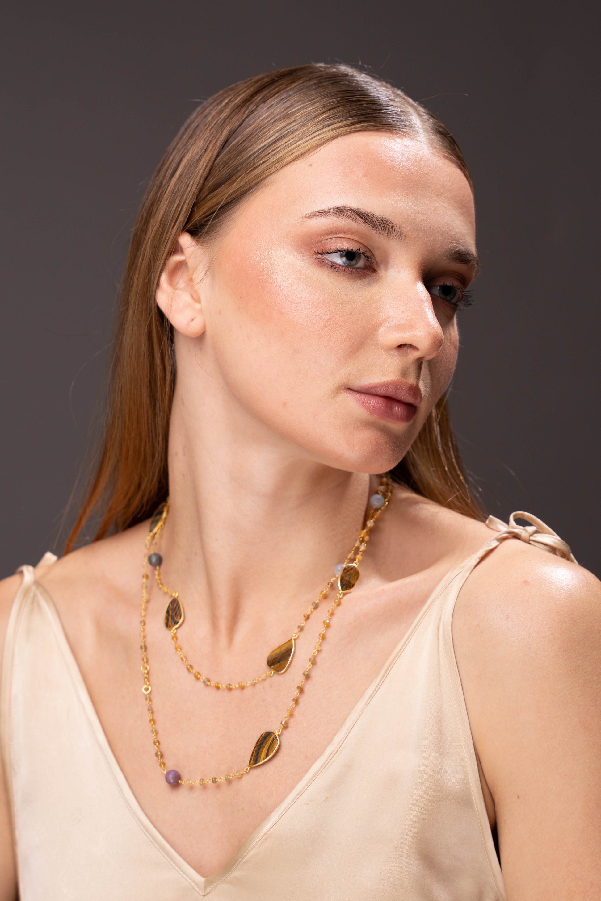 Carved leaf like tablets of tiger eye stones and beads strung together with multi colored sapphire balls in a gold plated silver link chain.