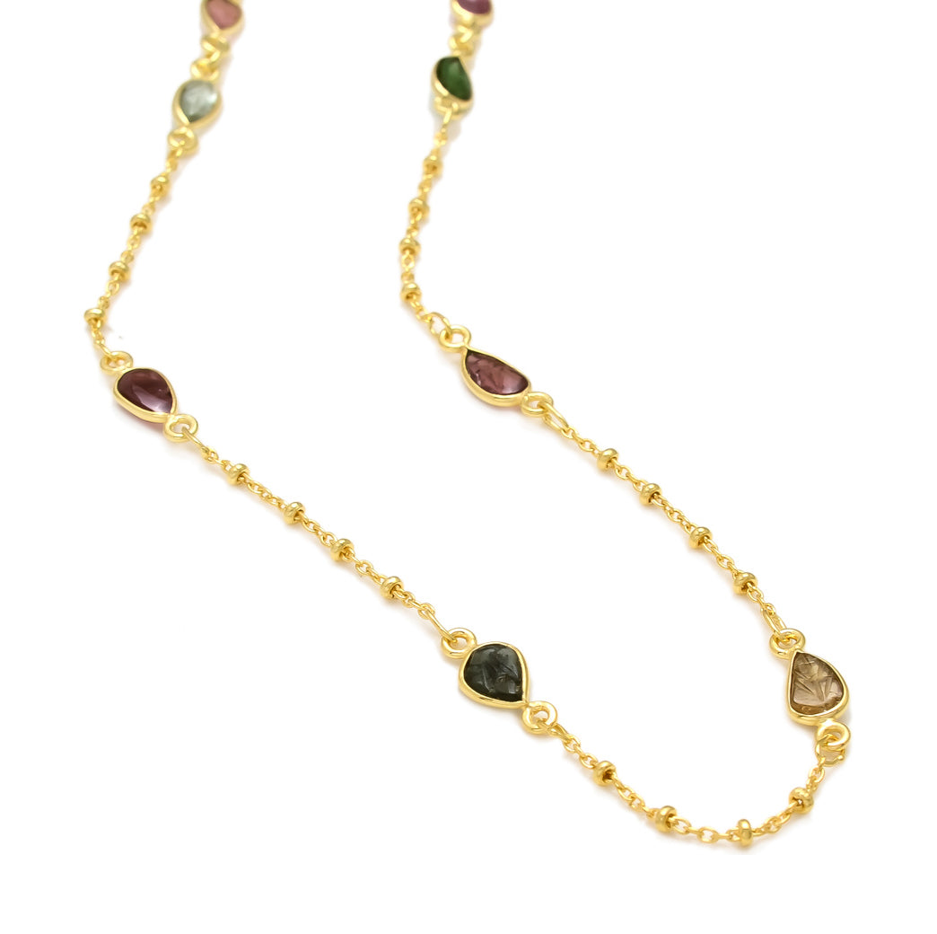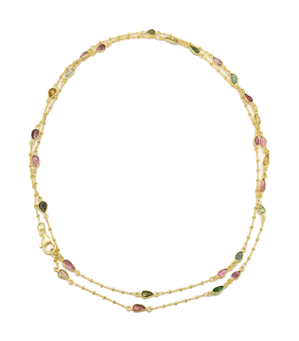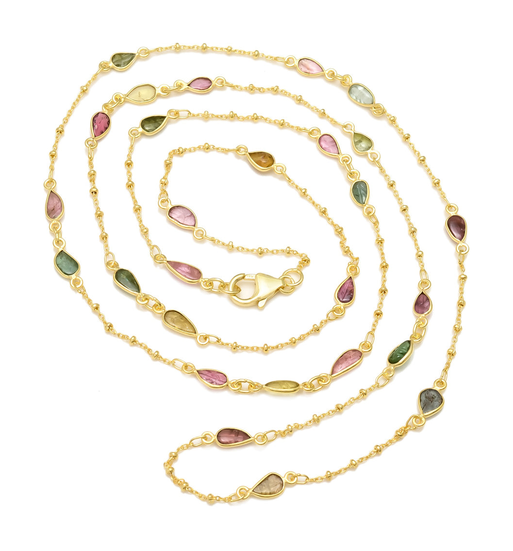Dainty faceted tourmalines set in a curb rawa chain. Handcrafted in silver with 18 ct gold plated finish.