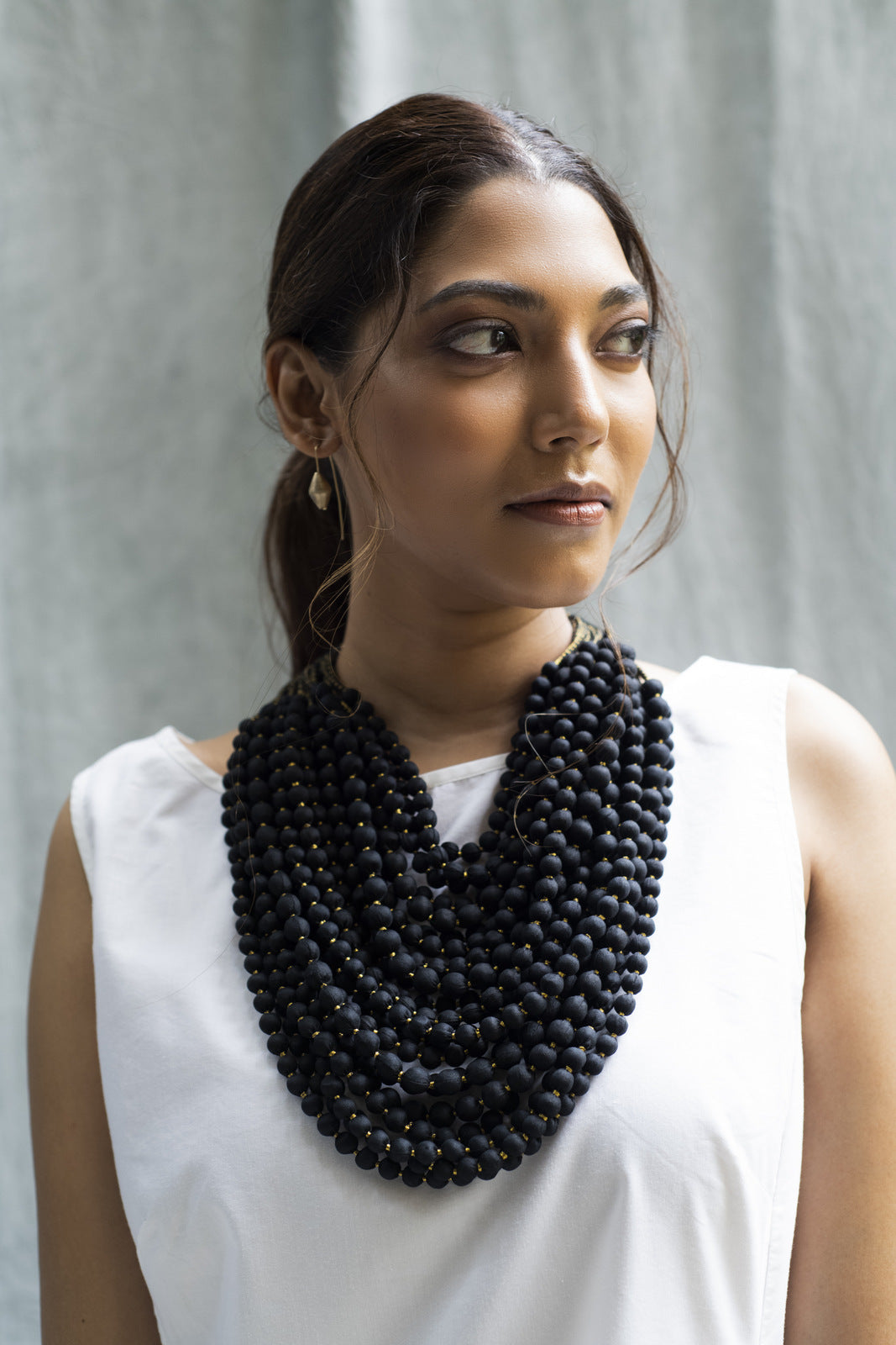 A colorful statement piece, 22-stringed beaded necklace hand made from upcycled silk saris. The silk is taken from remnants of Kantha Scarves. They contain no metal parts. The most striking colours and prints are selected from the mountains of sari remnants in HOWS workshop. These scraps are first matched, piece-by-piece, with colourful cotton thread, and then sewn into narrow, double-layered tubes. The artisans fill these tubes with wooden prayer beads, hand-stitching each bead into place with the thread.
