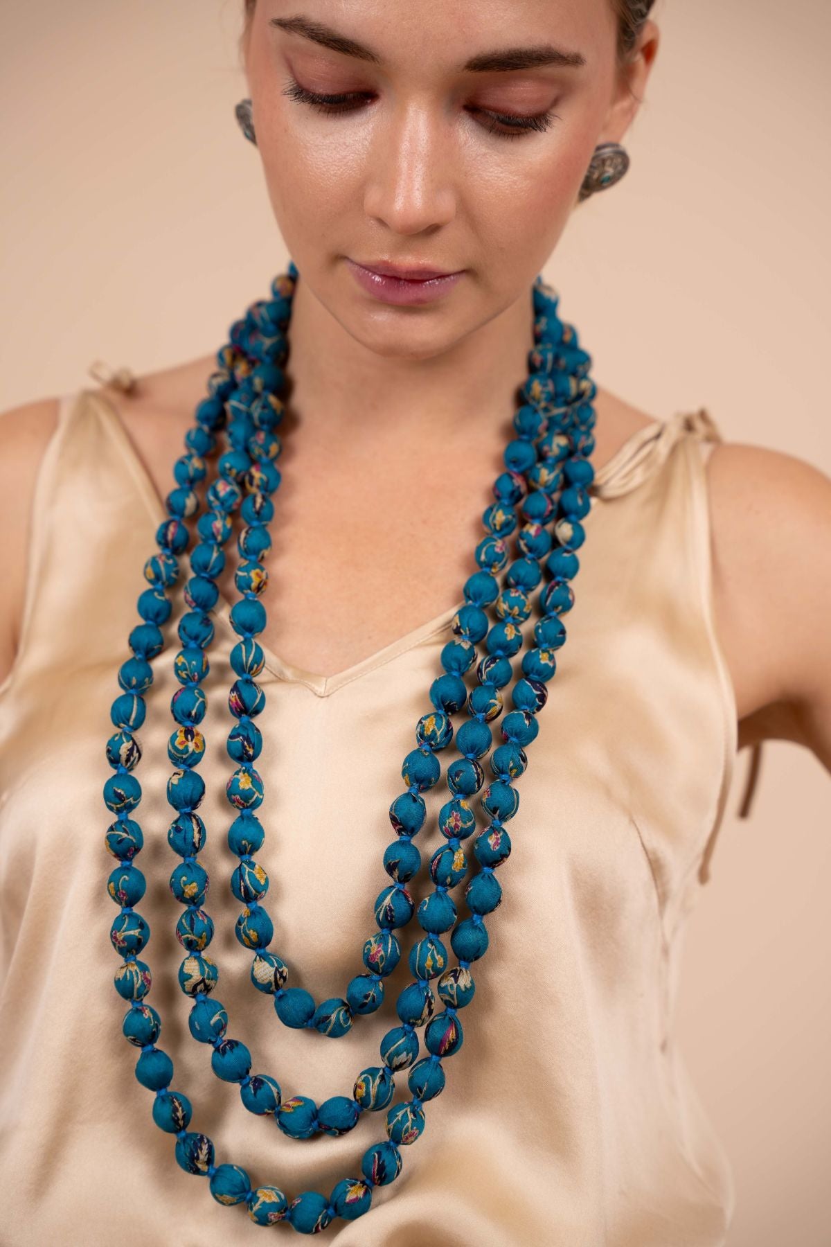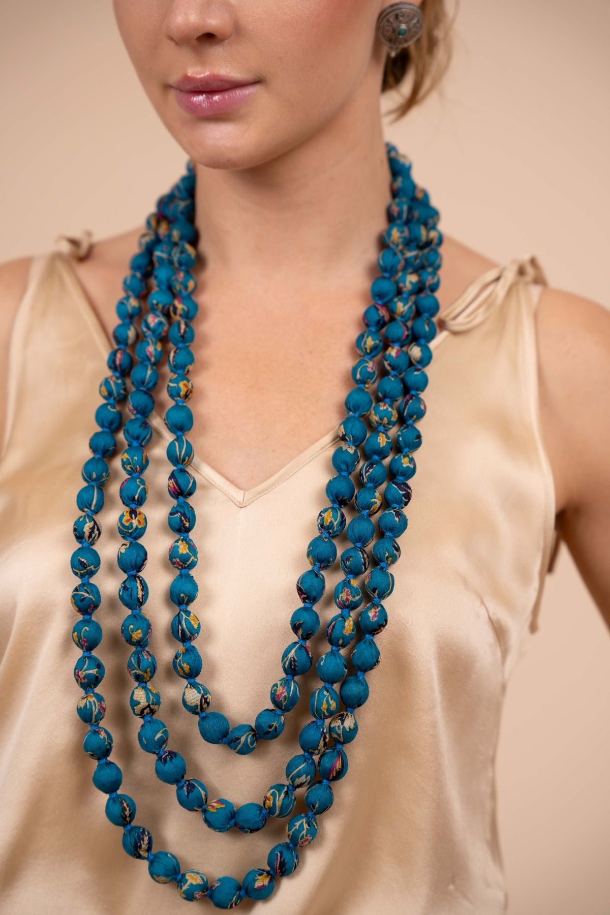Hand crafted beaded necklace made from upcycled silk saris. This is the newest style - 3 graded strands of large, round beads.