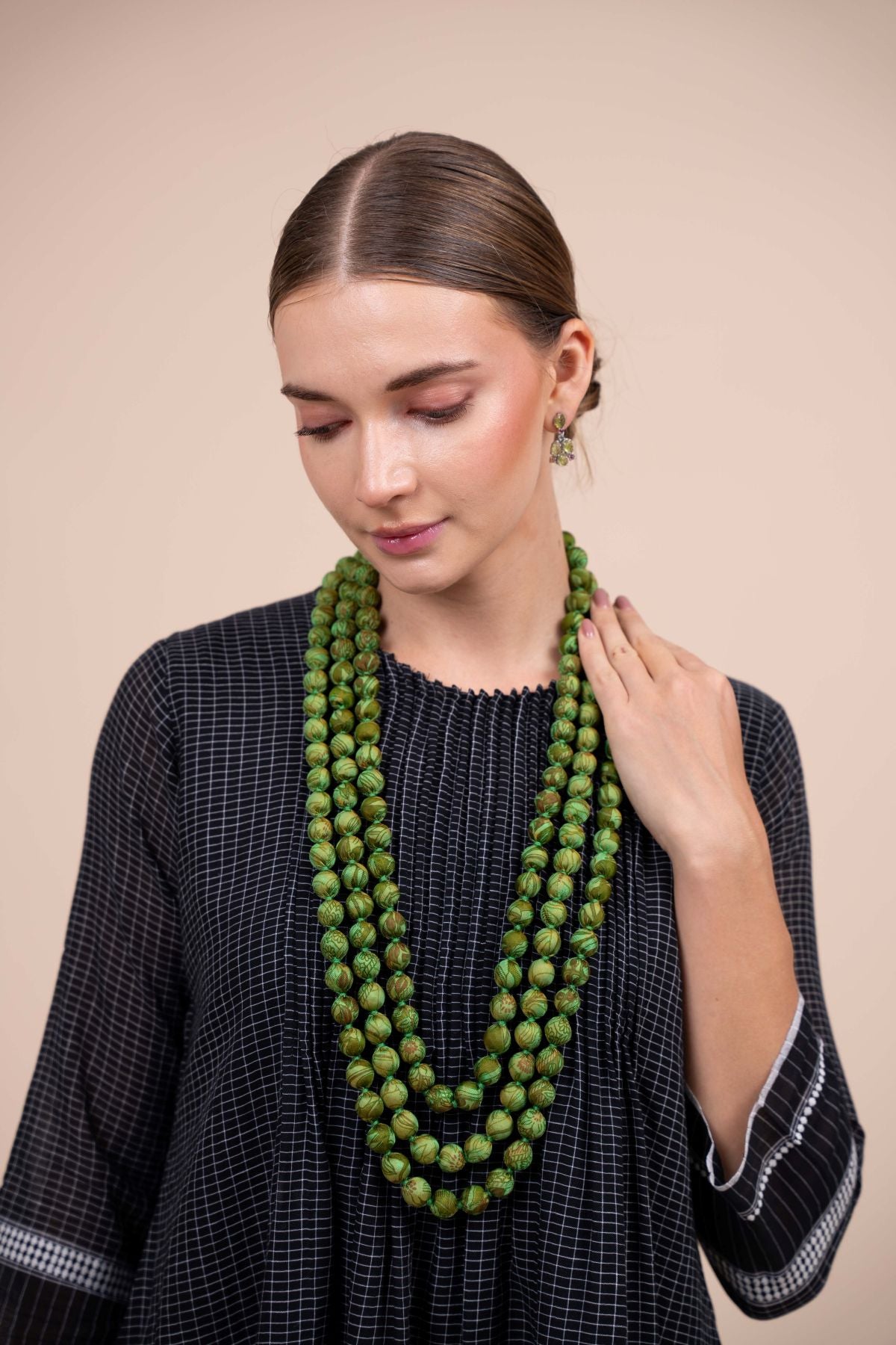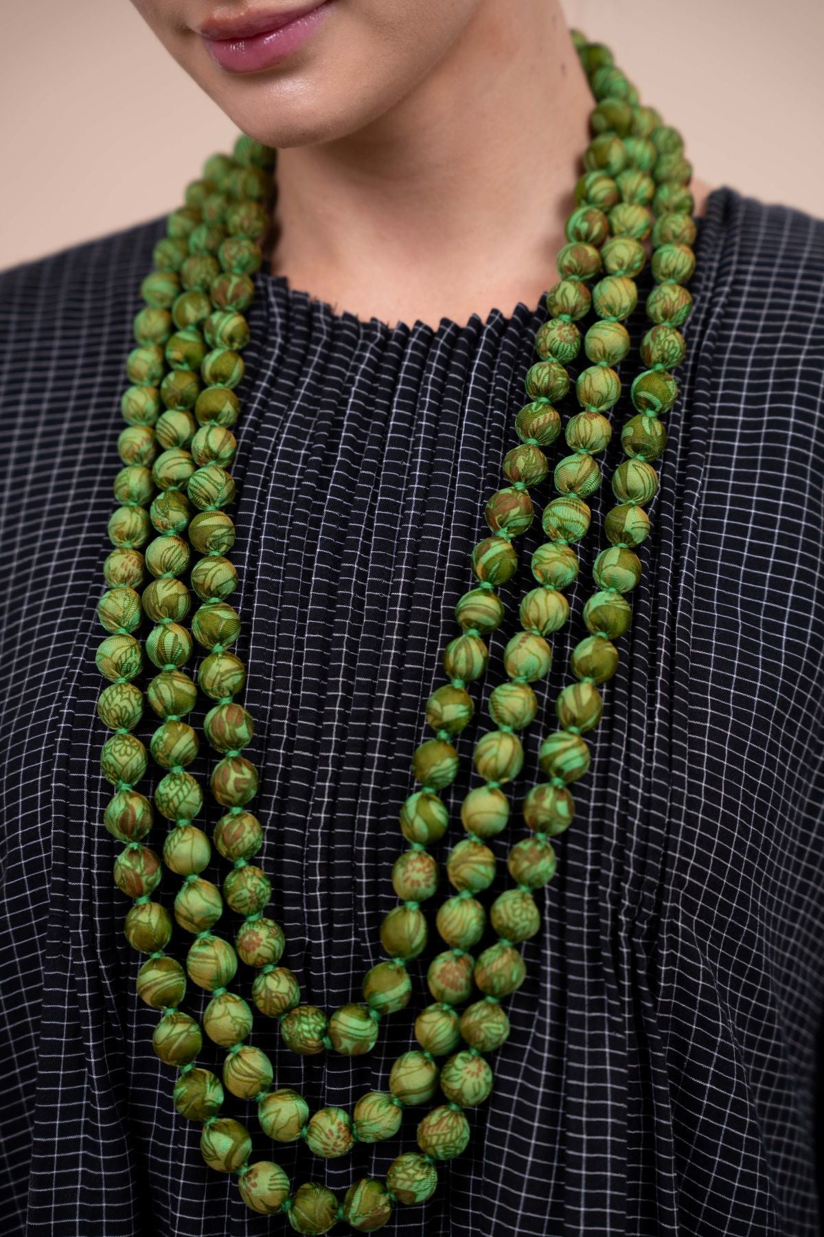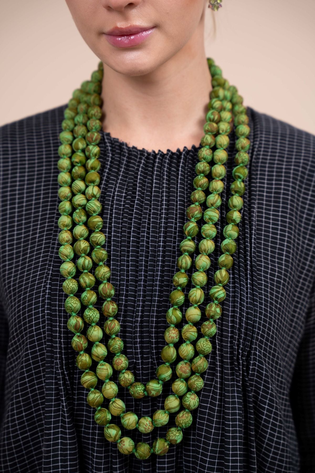 Hand crafted beaded necklace made from upcycled silk saris. This is the newest style - 3 graded strands of large, round beads.