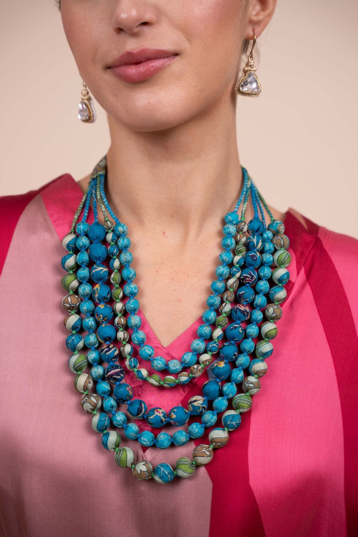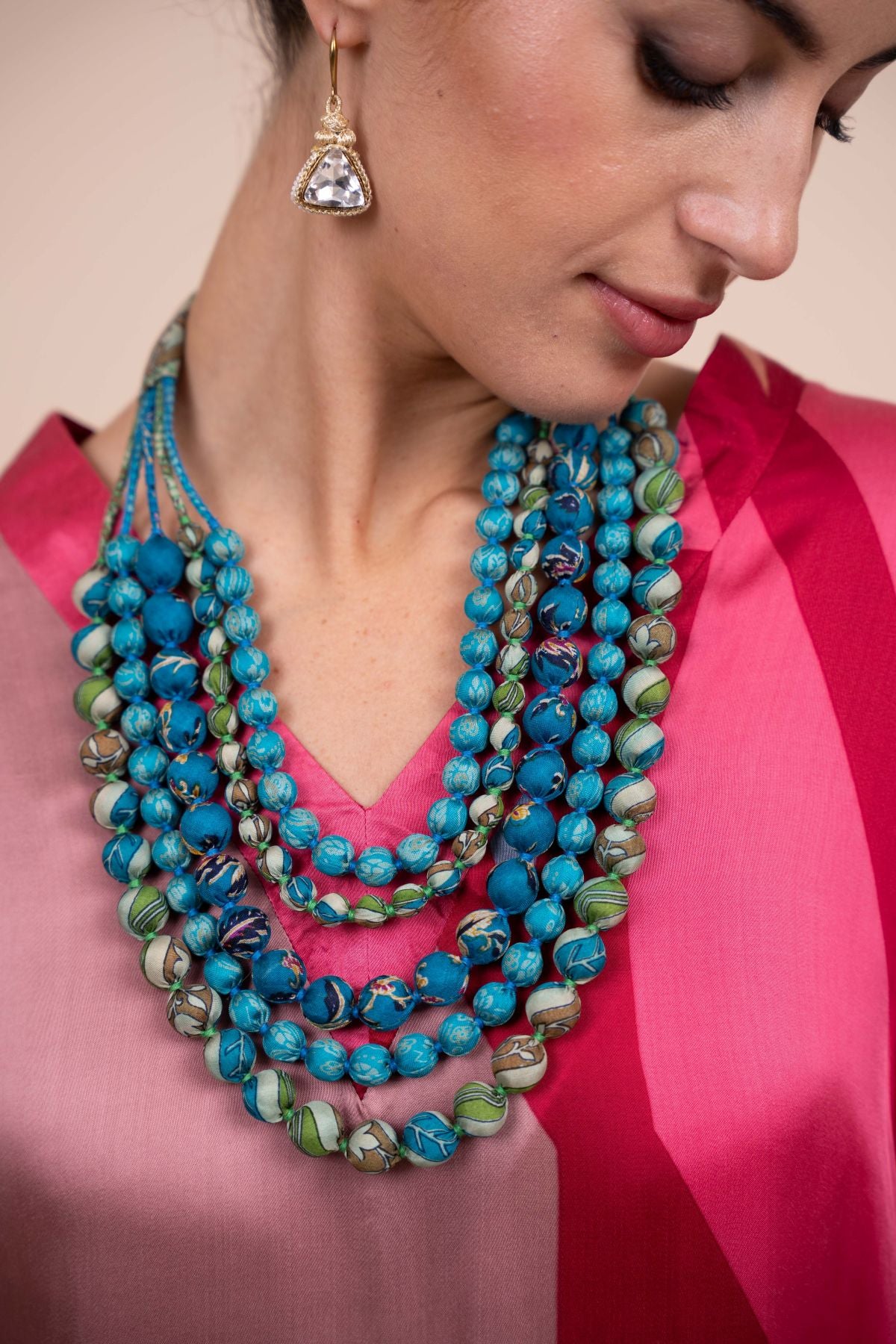 Handcrafted from wooden prayer beads covered in left over fabric from the remnants of scarves and dresses.
