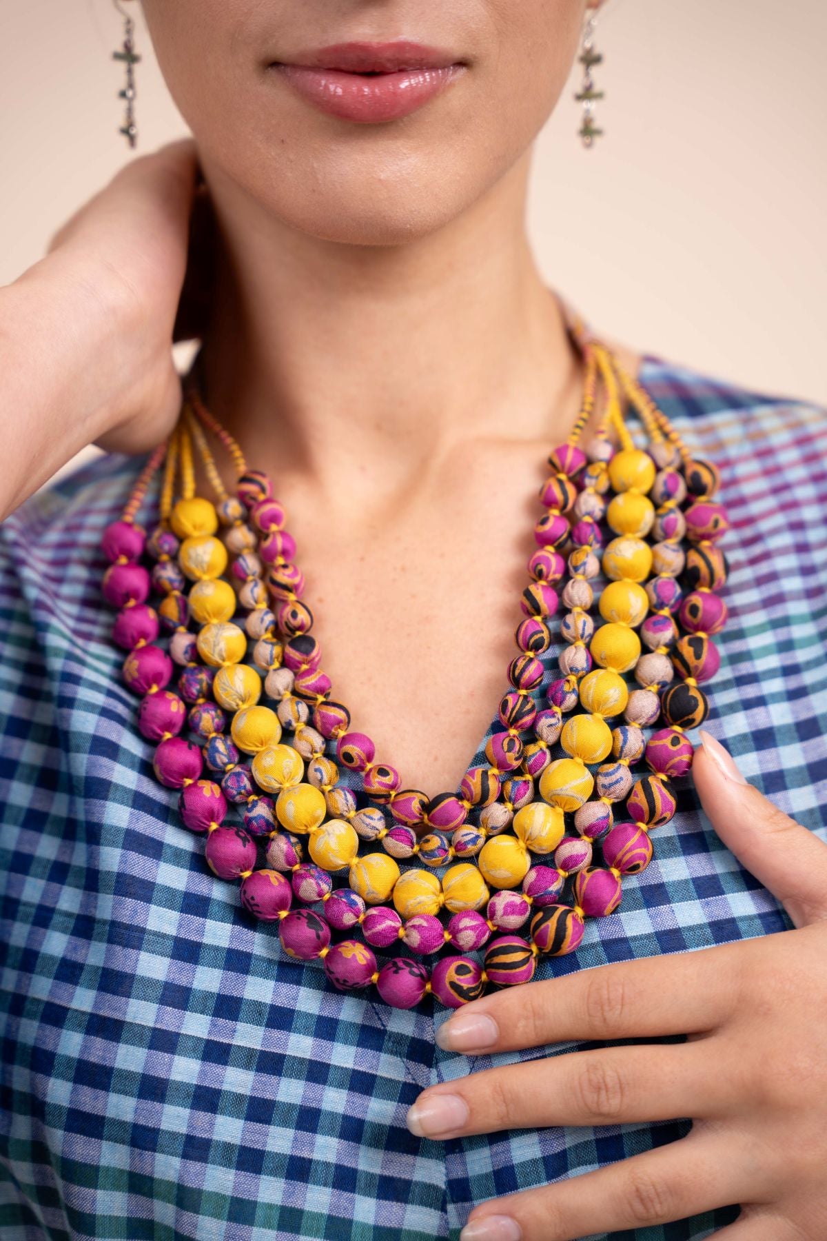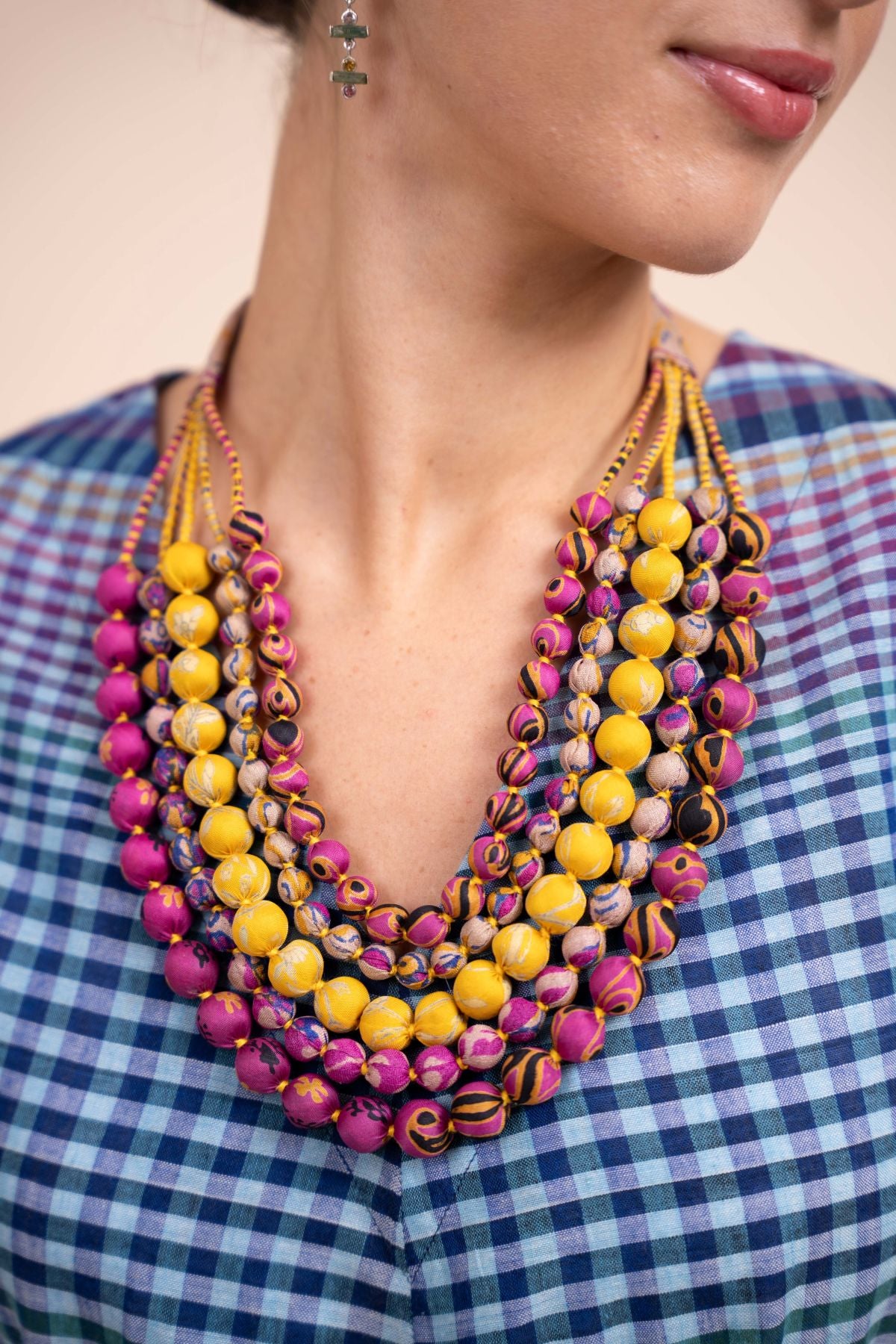 Handcrafted from wooden prayer beads covered in left over fabric from the remnants of scarves and dresses.