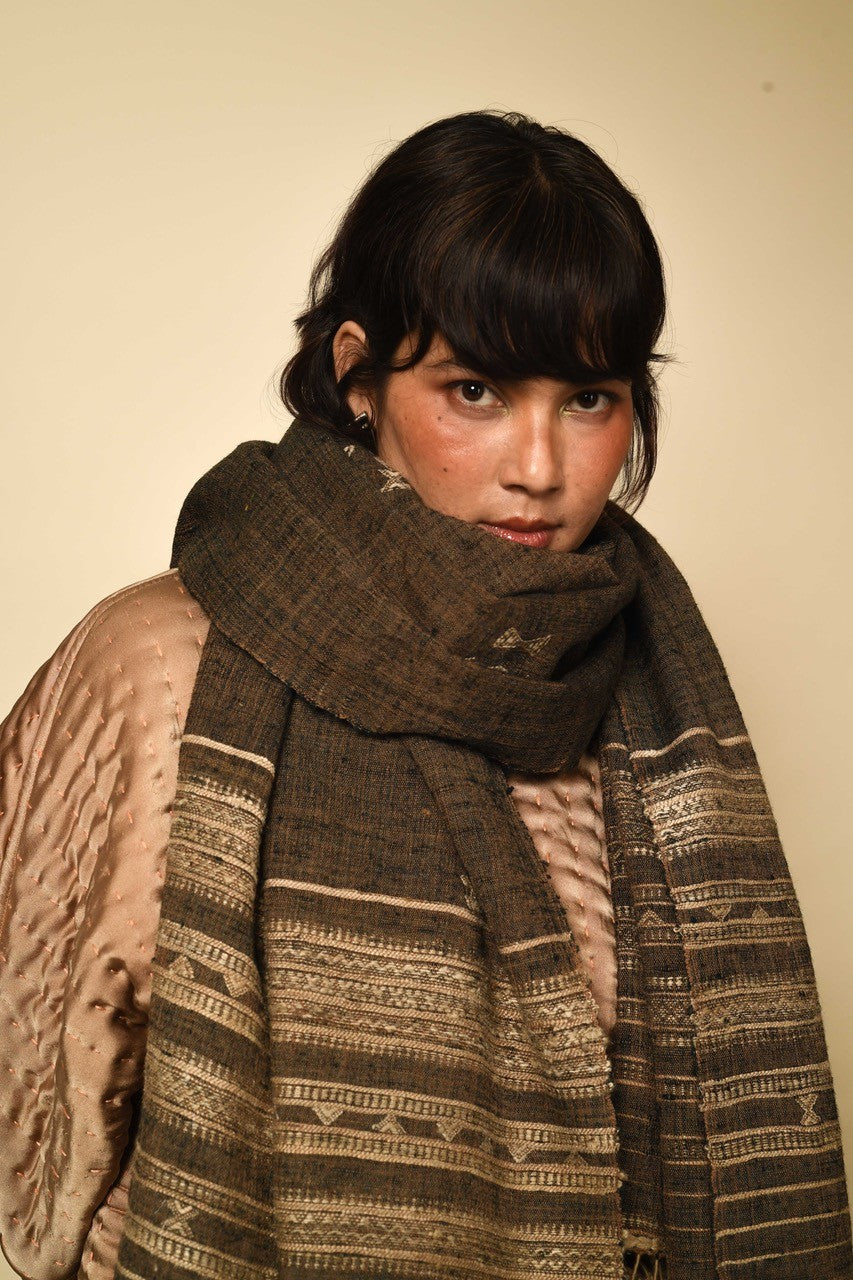 Handwoven tussar and eri silk with merino wool, crafted with laborious extra weft embroidery in the traditional motifs of the Vankar community of Kutch. A richly textured textile with beautiful detailing and finishing. The scarf has hand tied pom poms.